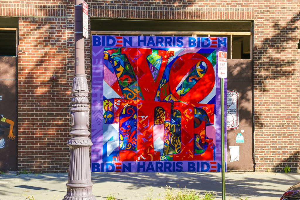Love this new “Vote Biden/Harris” wheatpaste mural located at Broad and Fitzwater Streets in South Philly! Designed by Amber Art & Design team member Ernel Martinez, the mural was installed by Keir Johnston, Samuel Rodriguez, and volunteers from Walls for Justice.