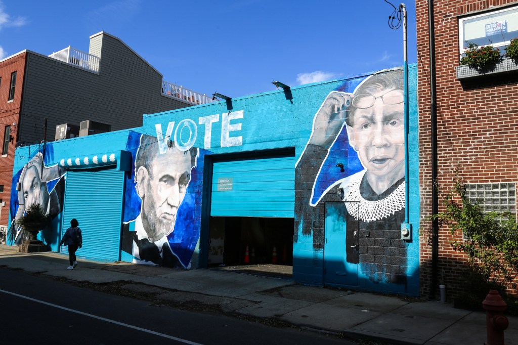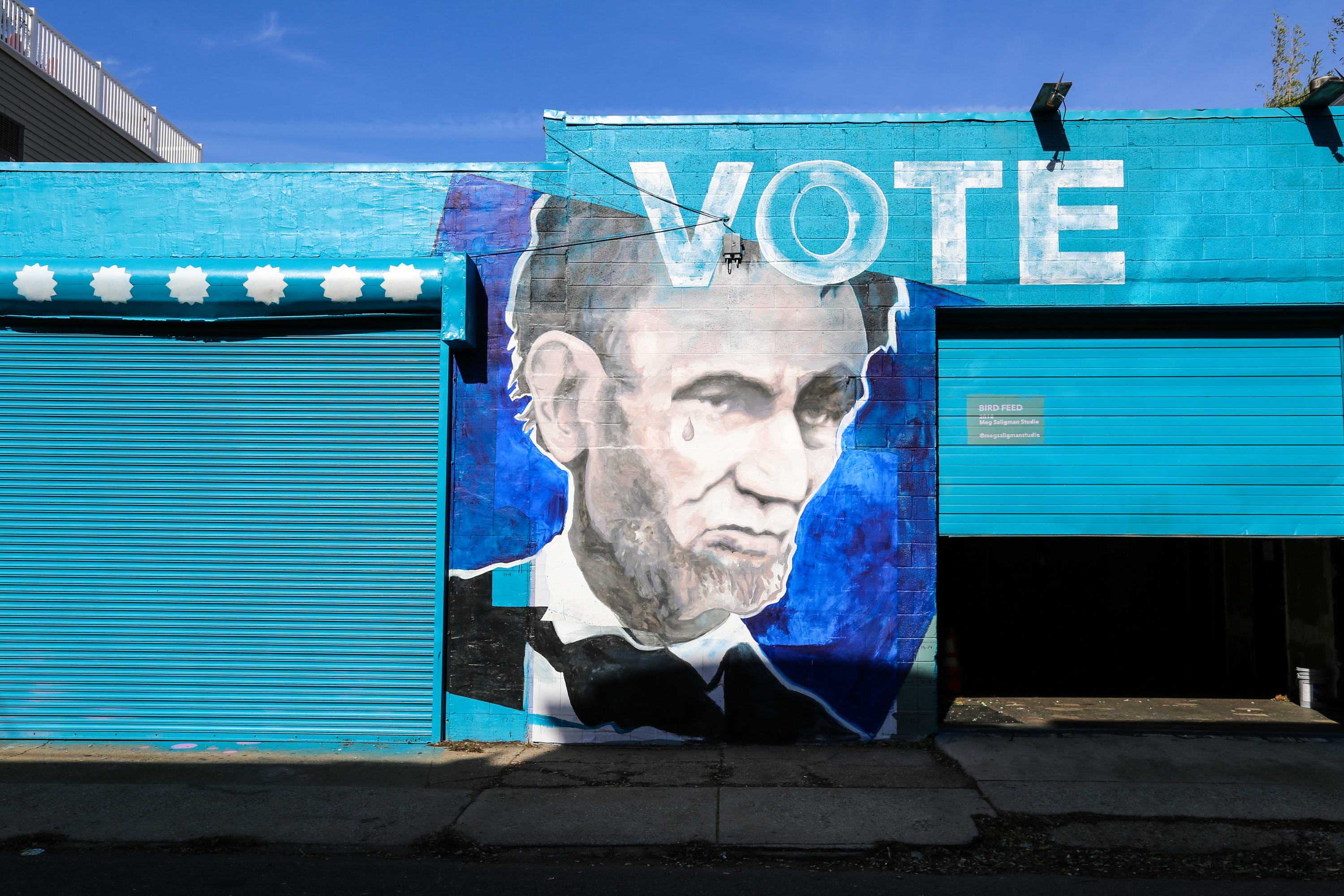 Painted over the last few days and being finished today, the mural depicts three icons of United States history with confounded expressions. From left to right on the wall those icons are Martin Luther King Jr., Abraham Lincoln, and Ruth Bader Ginsburg. Above the figures in capital letters sits the command, “VOTE”. And after the polls close in PA at 8pm tonight, the artist tells me she’ll be painting a “D” to finish the mural, leaving it to read: “VOTED”.