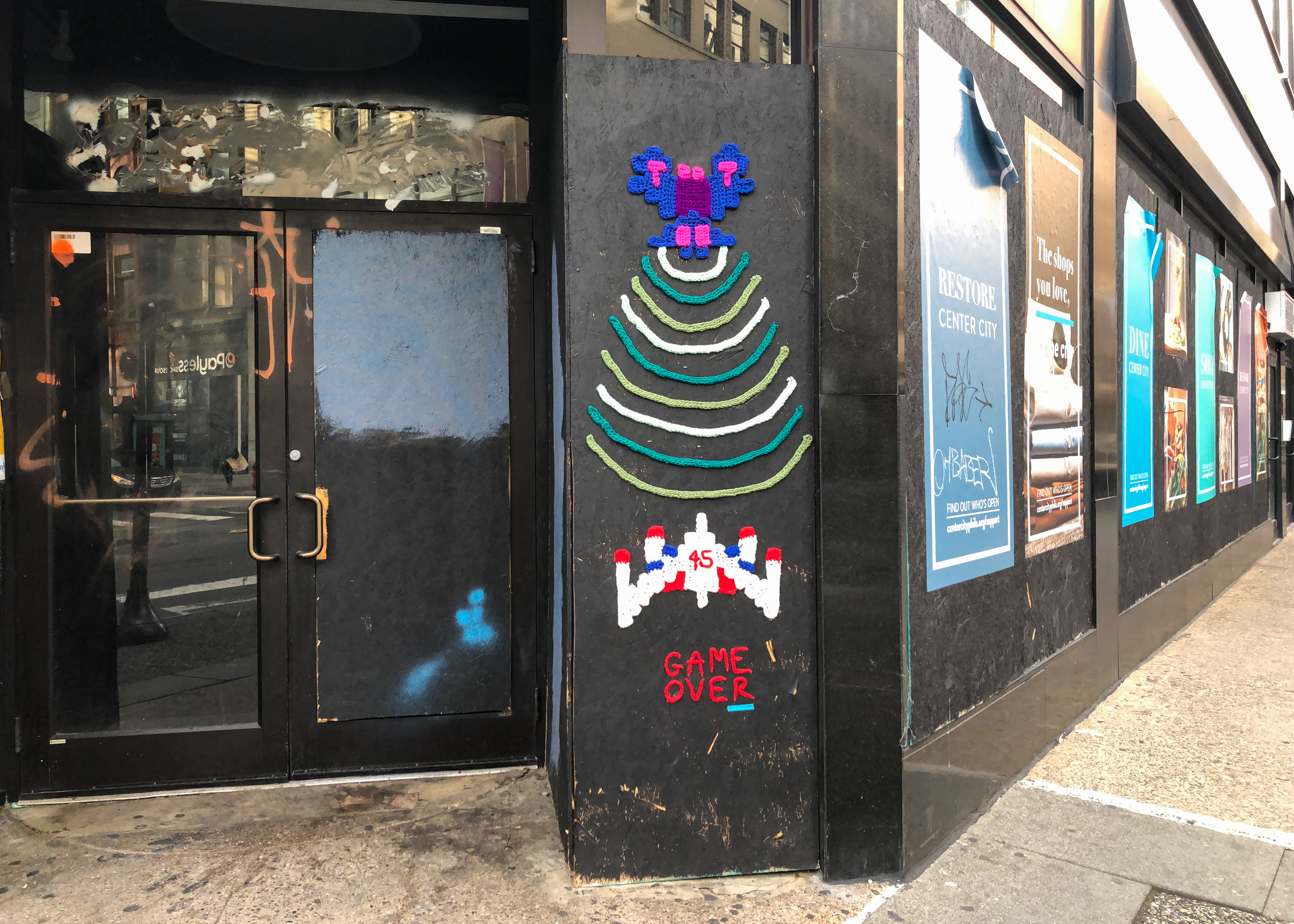 New “Game Over” yarnbomb installation today from Philly street artist Nicole Nikolich (aka Lace in the Moon) sends off the now former President #45. The new work is located at 16th and Chestnut Streets in Center City… Bye, Don. Have fun in Florida until we see you next time in court!