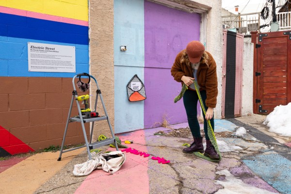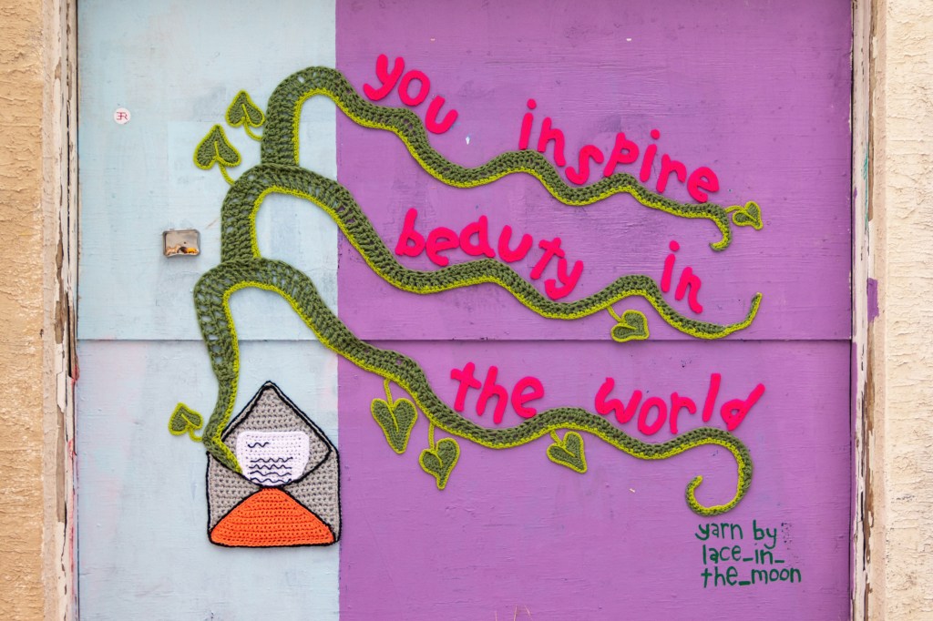 After seeing Nicole’s collaboration with Amberella in September, Danielle decided that Nicole’s colorful style was exactly what she was looking for. “I was so excited to make this piece for Danielle,” Nicole told me over text. “The placement of the proposal yarnbomb on Percy Street was extremely special because of its importance to the couple, who have helped curate and build the alley, and also an exciting and electric backdrop for my textured and bright medium.”