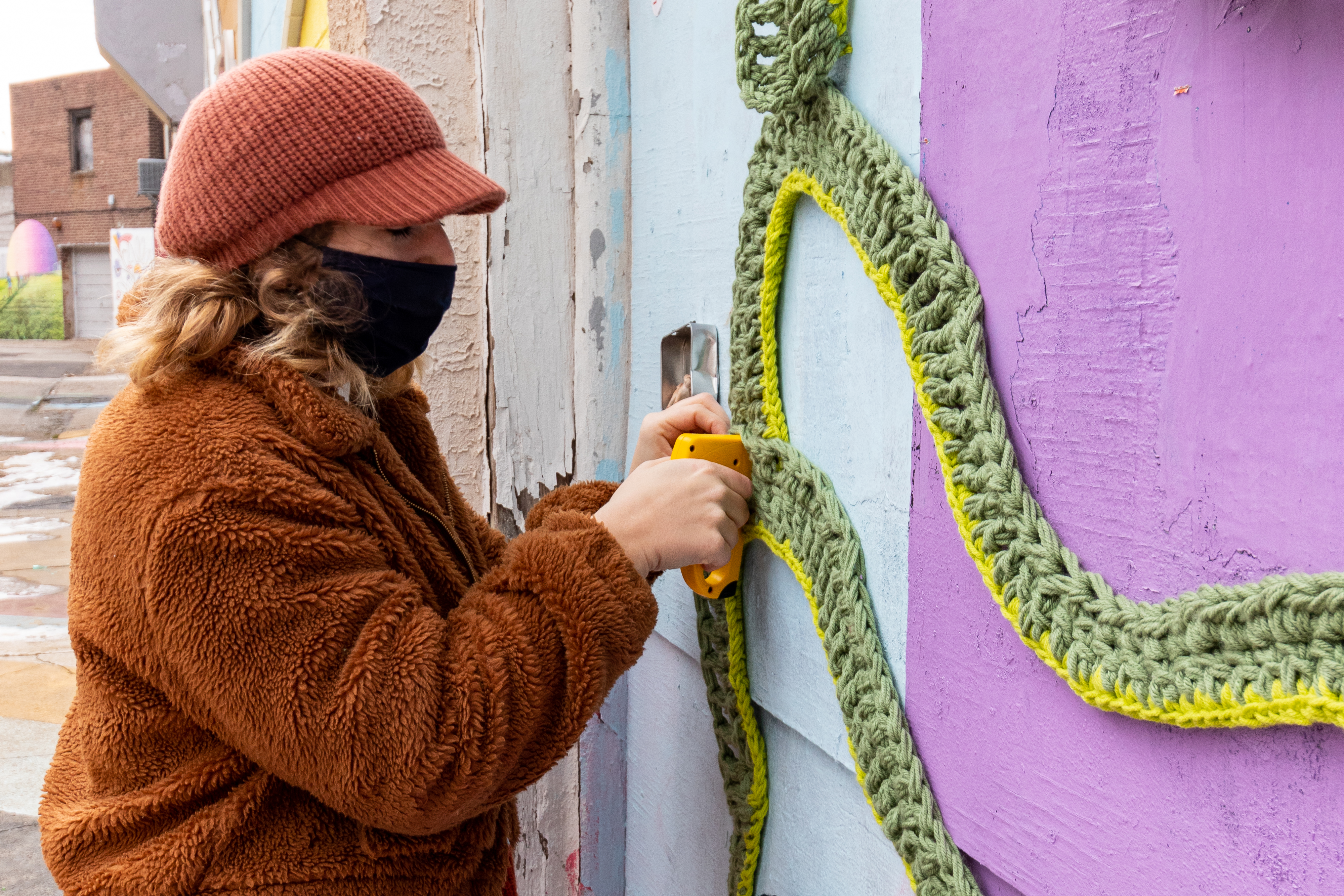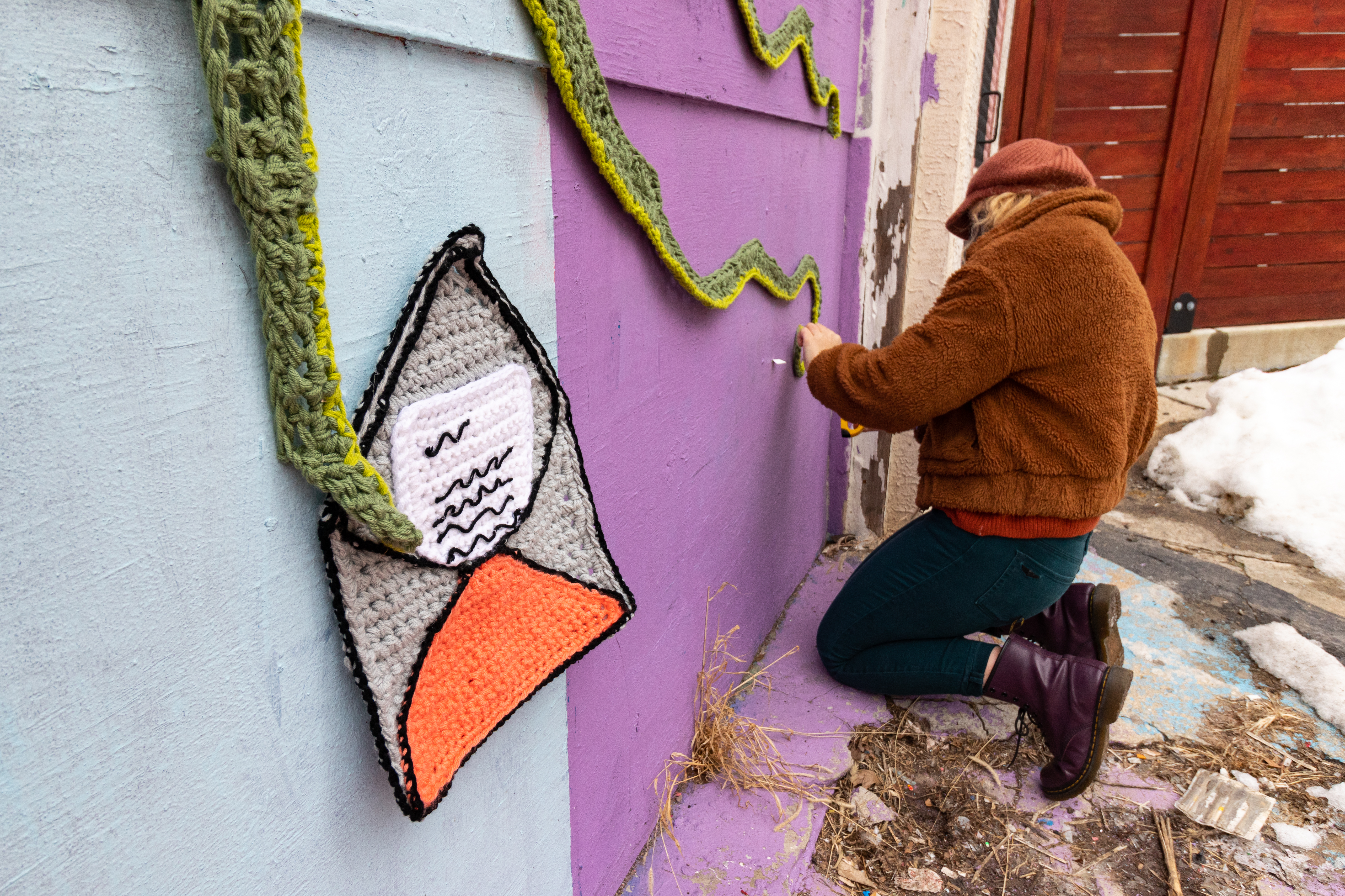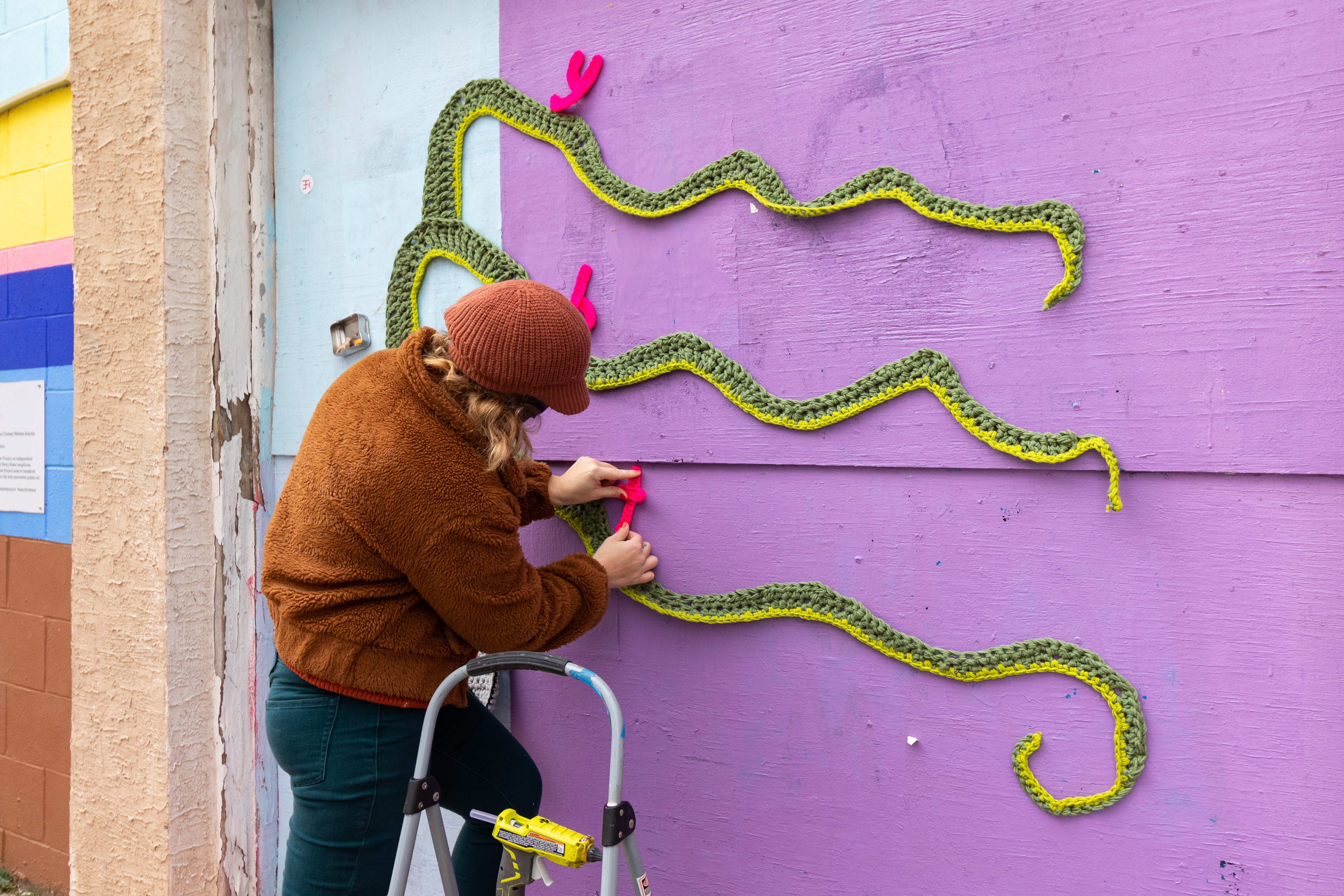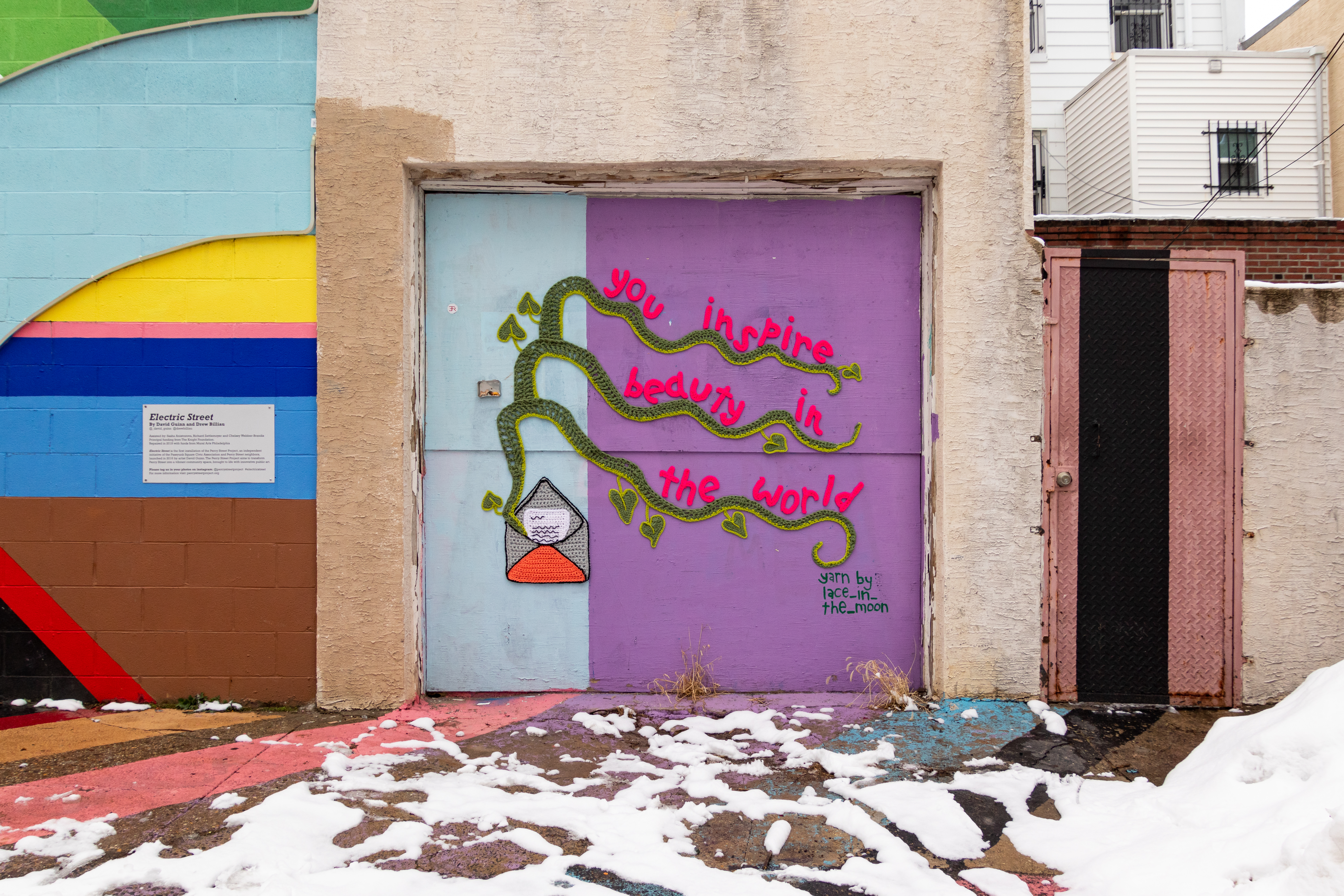 After seeing Nicole’s collaboration with Amberella in September, Danielle decided that Nicole’s colorful style was exactly what she was looking for. “I was so excited to make this piece for Danielle,” Nicole told me over text. “The placement of the proposal yarnbomb on Percy Street was extremely special because of its importance to the couple, who have helped curate and build the alley, and also an exciting and electric backdrop for my textured and bright medium.”