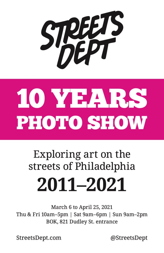 Streets Dept’s 10 Years Photo Show celebrates a decade of art on the streets of Philadelphia. Started in 2011 by photographer and curator Conrad Benner (that’s me), StreetsDept.com is an award-winning website that documents and celebrates Philly’s street art and public art. 10 Years Photo Show offers a visual look back at some of the most memorable moments from the blog’s history. From photographing artist Ishnikts yarnbombing the former Frank Rizzo monument in 2012 to commissioning artist Loveis Wise’s beloved temporary “Your Voice Has Power” mural during the 2018 midterm elections, this photography exhibition will recall fond memories for longtime Streets Dept followers and offer new folks a glimpse at the ephemeral side of Philly’s walls.