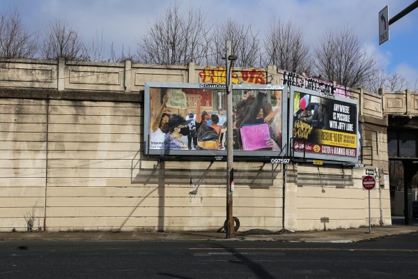 This is one of a series of art takeovers presented by SaveArtSpace‘s Whistling in the Dark project, a cross-media, tri-city, public art exhibition curated by Caledonia Curry (aka Swoon) and Gianni Lee that’s currently displaying art on billboards in New York City, Los Angeles, and Philadelphia.