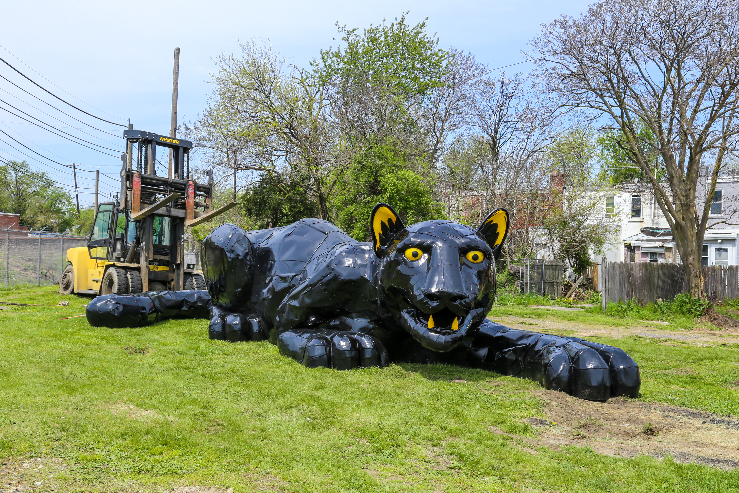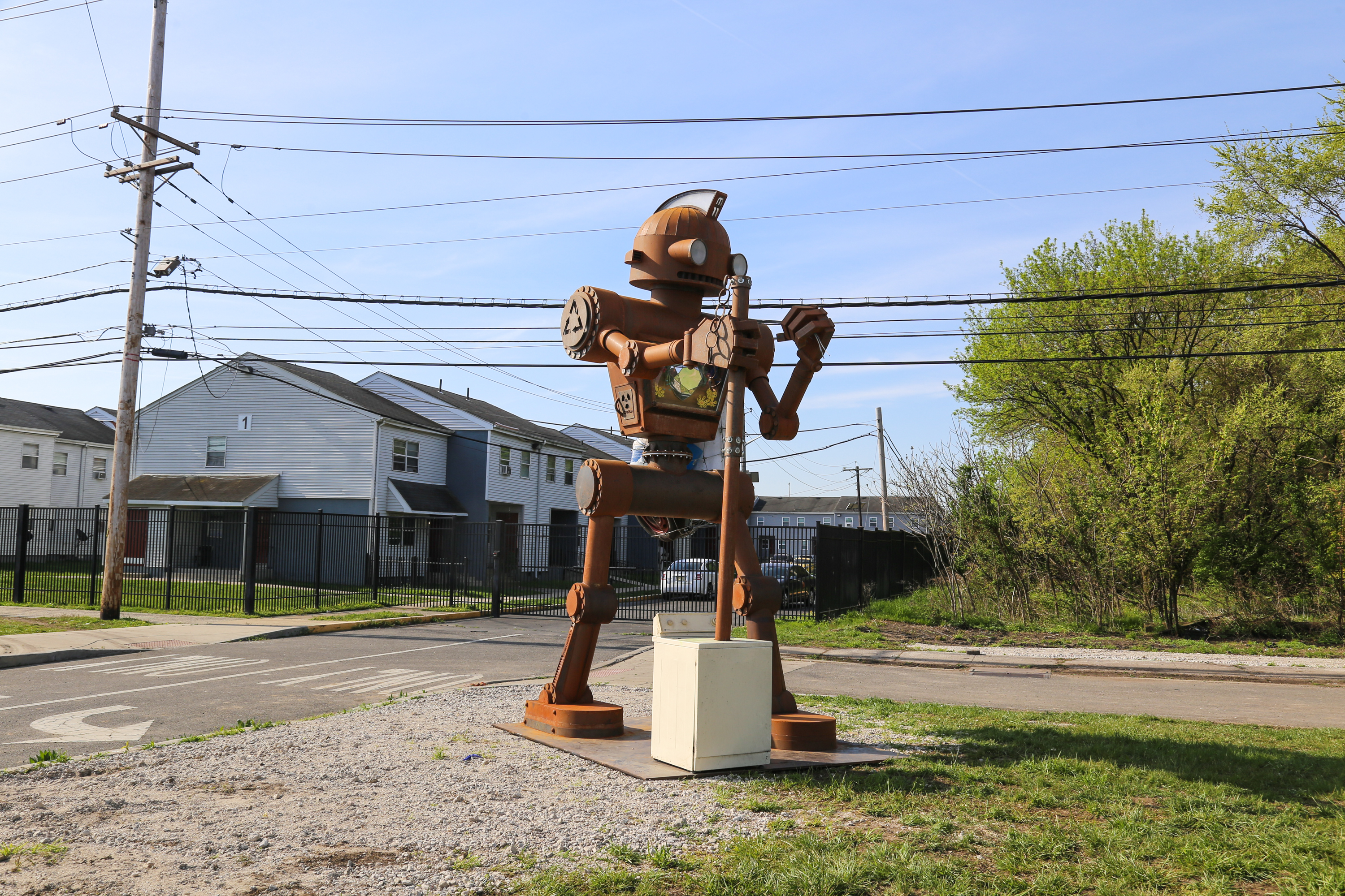 A New View features a massive feline designed from repurposed automobiles, a 15-foot-tall steel trash collecting creature, a machine that utilizes mealworms to eat Styrofoam packaging from e-waste, and more. The creations were specifically designed to raise awareness about illegal dumping of bulk waste in Camden, which costs taxpayers over $4 million annually.