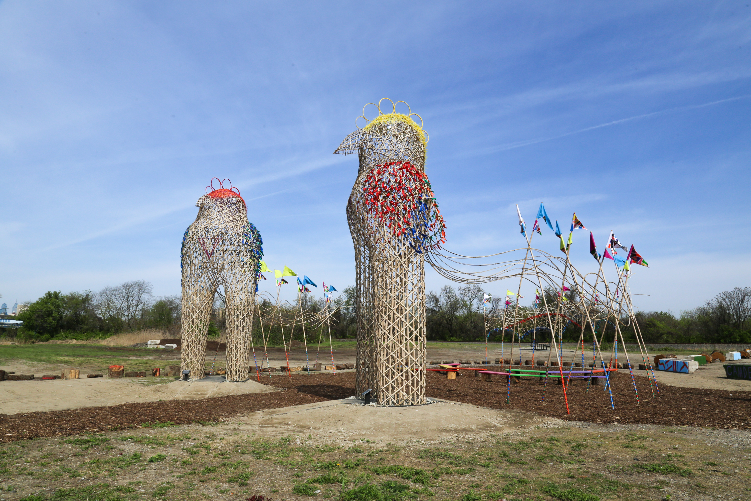 Phoenix Festival is comprised of two monumental 22-foot-tall sculptures made out of bamboo, and decorated with colorful recycled objects. Leading up to the grand installation, the artists worked with Camden educators and neighbors to create individual flags for the Festival. During a week-long residency on site, The Myth Makers worked with community volunteers to build and decorate a large open amphitheater for gatherings and events – both spontaneous and organized. A series of welcoming pathways connect the sculptures and the Gathering Place into a playful park setting. The goal for The Phoenix Festival is to create an adored space – as art is a catalyst for change.