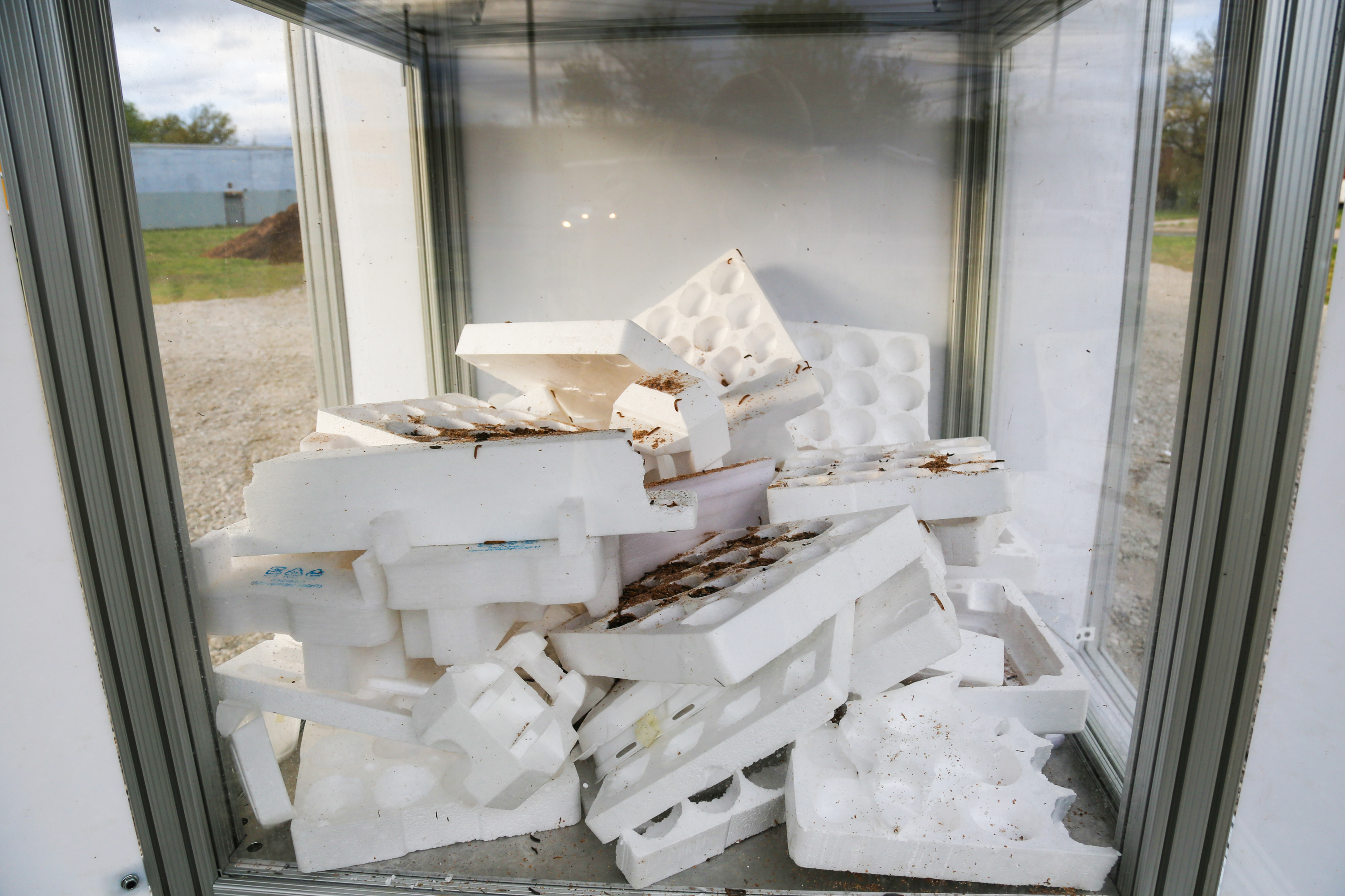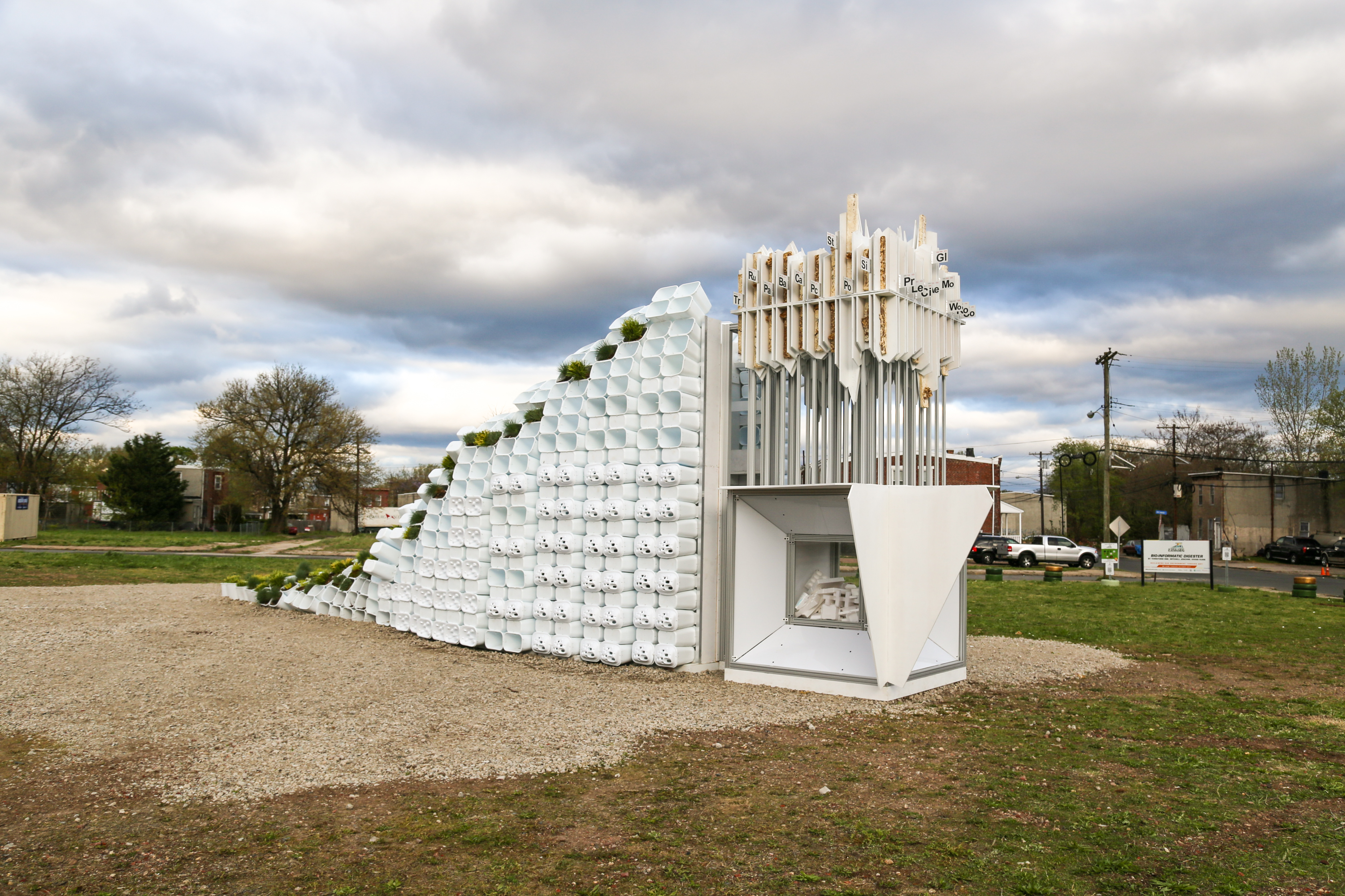 The Bio-Informatic Digester is a machine in the garden that utilizes mealworms to eat styrofoam packaging from e-waste. At the base, the tesseract showcases mealworms devouring community-donated styrofoam and at the top, mycelium erodes over time to reveal the biodiversity graph and future projections of Camden, NJ. Tapping into Camden’s roots as the first county in the state to mandate recycling, this project demonstrates a new method of biologically-driven recycling that can contribute to urban biodiversity. Furthermore, the project visualizes the often-unseen beneficial insect behavior in cities. Manifesting ecological routines into a visible spectacle is a utilitarian mechanism for building awareness and communicating intentions. Instead of burying or hiding urban metabolic infrastructure, reversing its presence is desirable. This machine shows nature as an aestheticized and functional event in its myriad of forms. It offers the community the capacity to see waste, energy or water systems in flux – highlighting their value and immediacy.