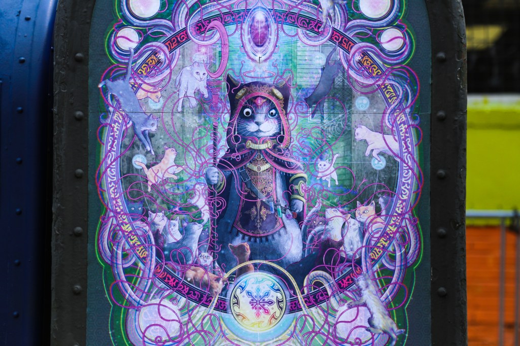 “They’re the latest iteration of the same theme I’ve been exploring for a while — my attempt at depicting a modern urban mythological/folkloric landscape,” Doug explained over text. “They started as digital drawings that I adapted to the format of the mail relay boxes, which I think conveniently have a shape similar to stained glass church windows. They’re also usually located on street corners, or crossroads, which are said to be liminal spaces where the spirit world can intersect with the human world.”