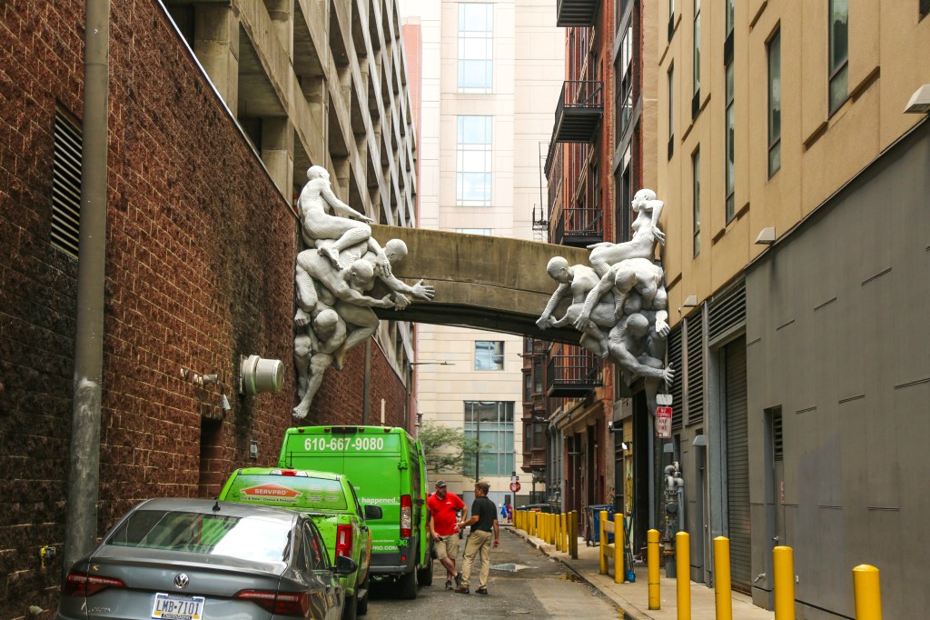 “Suspended 20 feet over an alley in Center City, Philadelphia, two groups of entangled bodies grapple with the task to sustain, or raise up a bridge that spans the width of the street,” the artist’s website reads! “The artwork is comprised of thousands of aluminum plates which topographically construct the sculpture’s surface. The artwork is meticulously designed to integrate into the existing built environment as part of the city’s renown Percent for Art program.”
