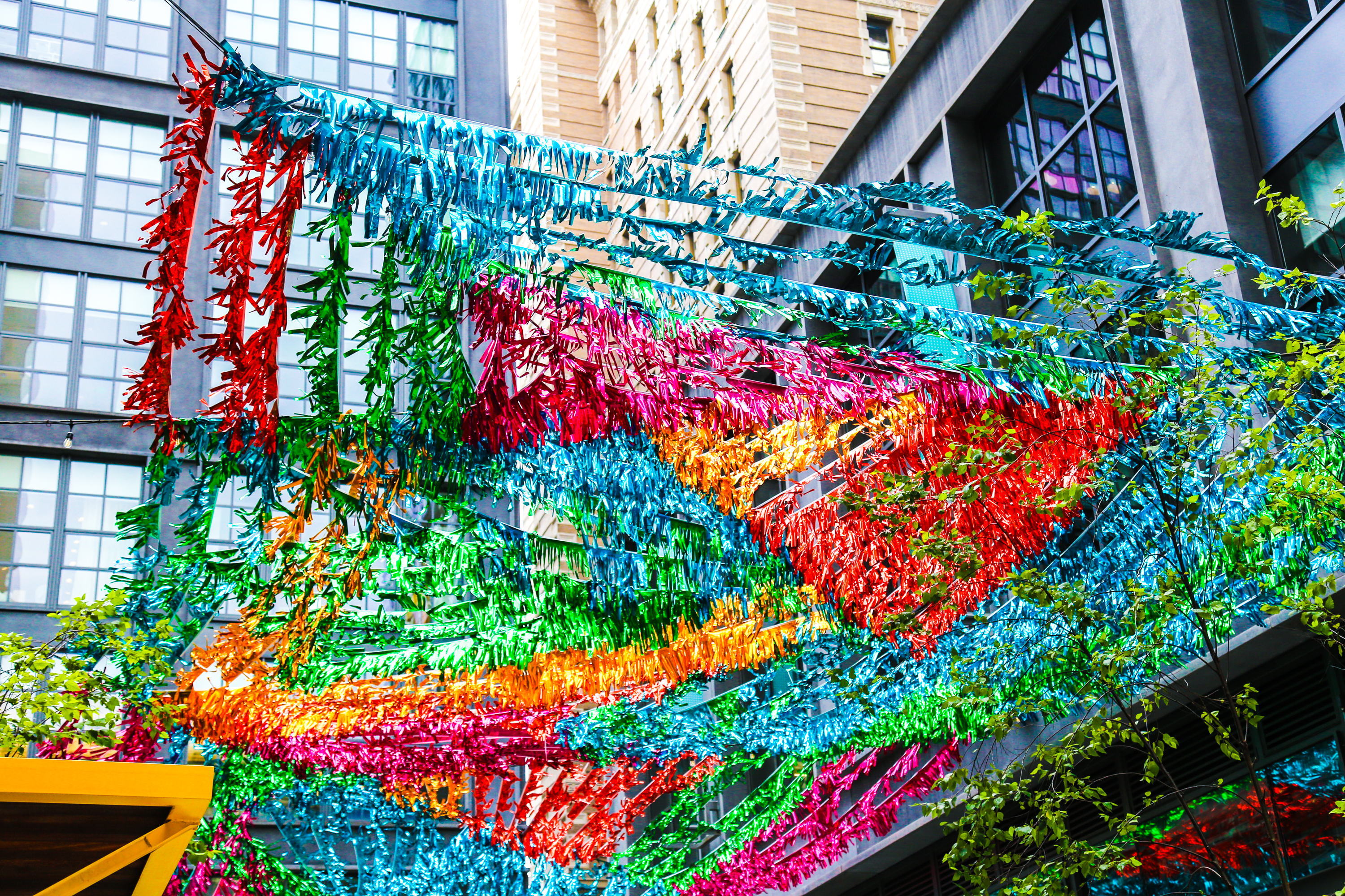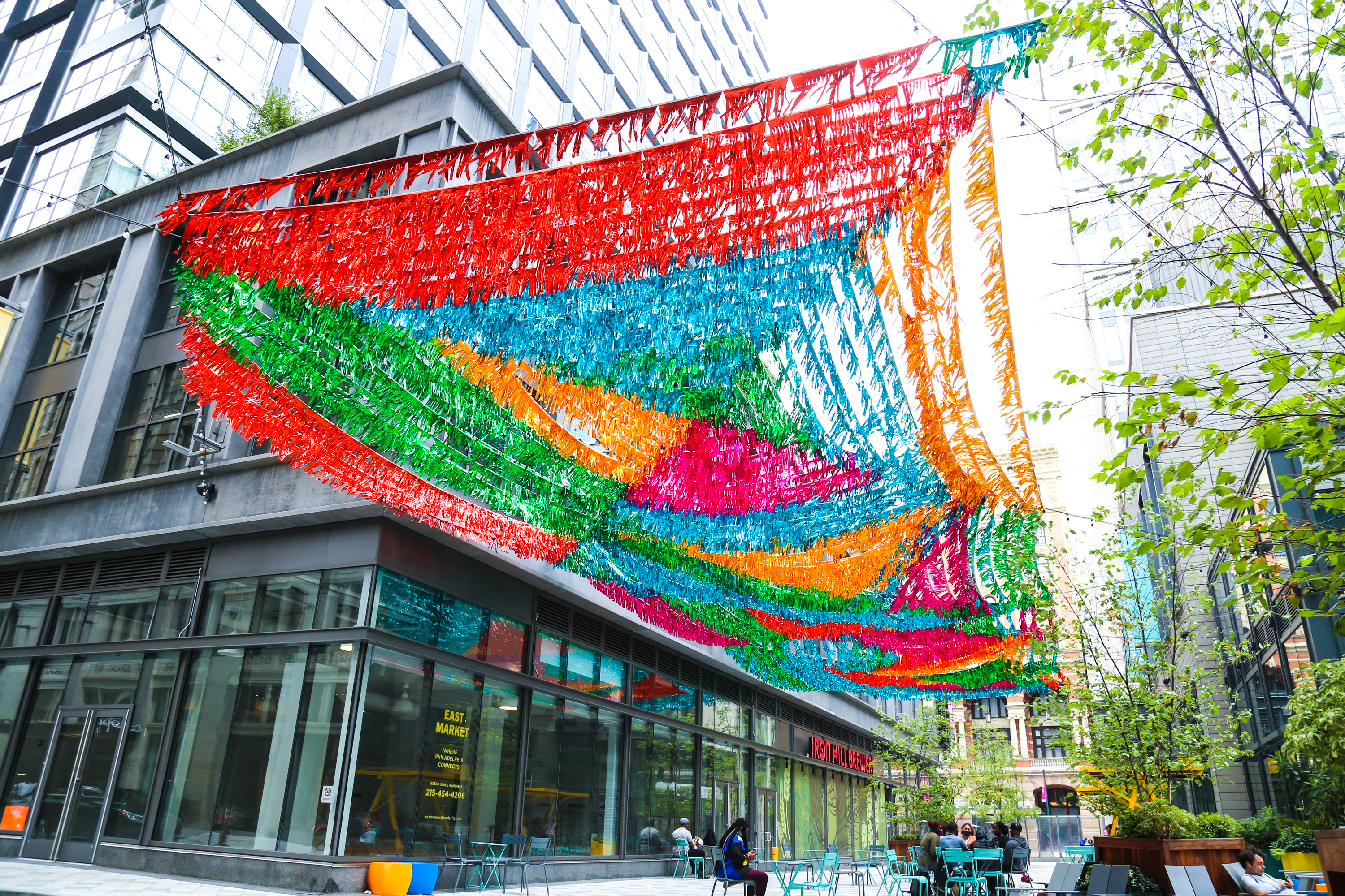 Beautiful new installation this week from Philly-area artist, Quinha (Érica Mukai Faria) along the pedestrian-only Chestnut Walk at East Market! The artwork features mixed use of colorful streamers and draws from the artist’s love of working with the sky.