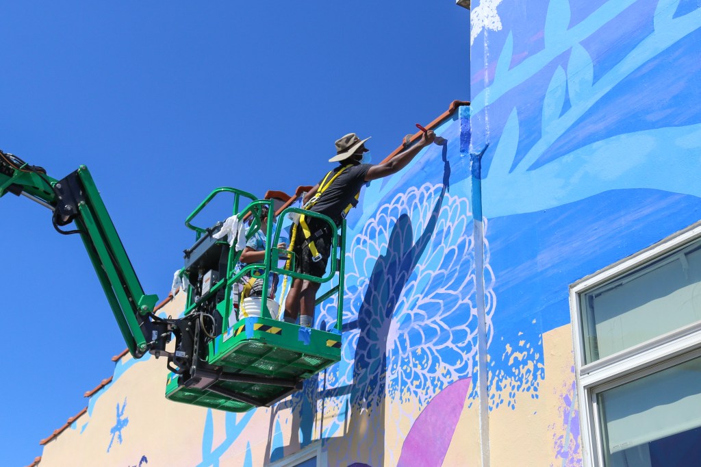 As you see in the photos of this post, the artwork was first painted on parachute cloth in-studio. It’s now being installed on-site. Some final painting was taking place when I went to go photograph the mural’s progress today. The artist estimates the mural should be completed in a week or so (weather always plays a role in determining that exactly.) Creating a mural parachute cloth like this, and finishing it with a final coat of a protective clear layer, allows a mural to age its best protecting it better from rain, wind, sun, and snow damage.