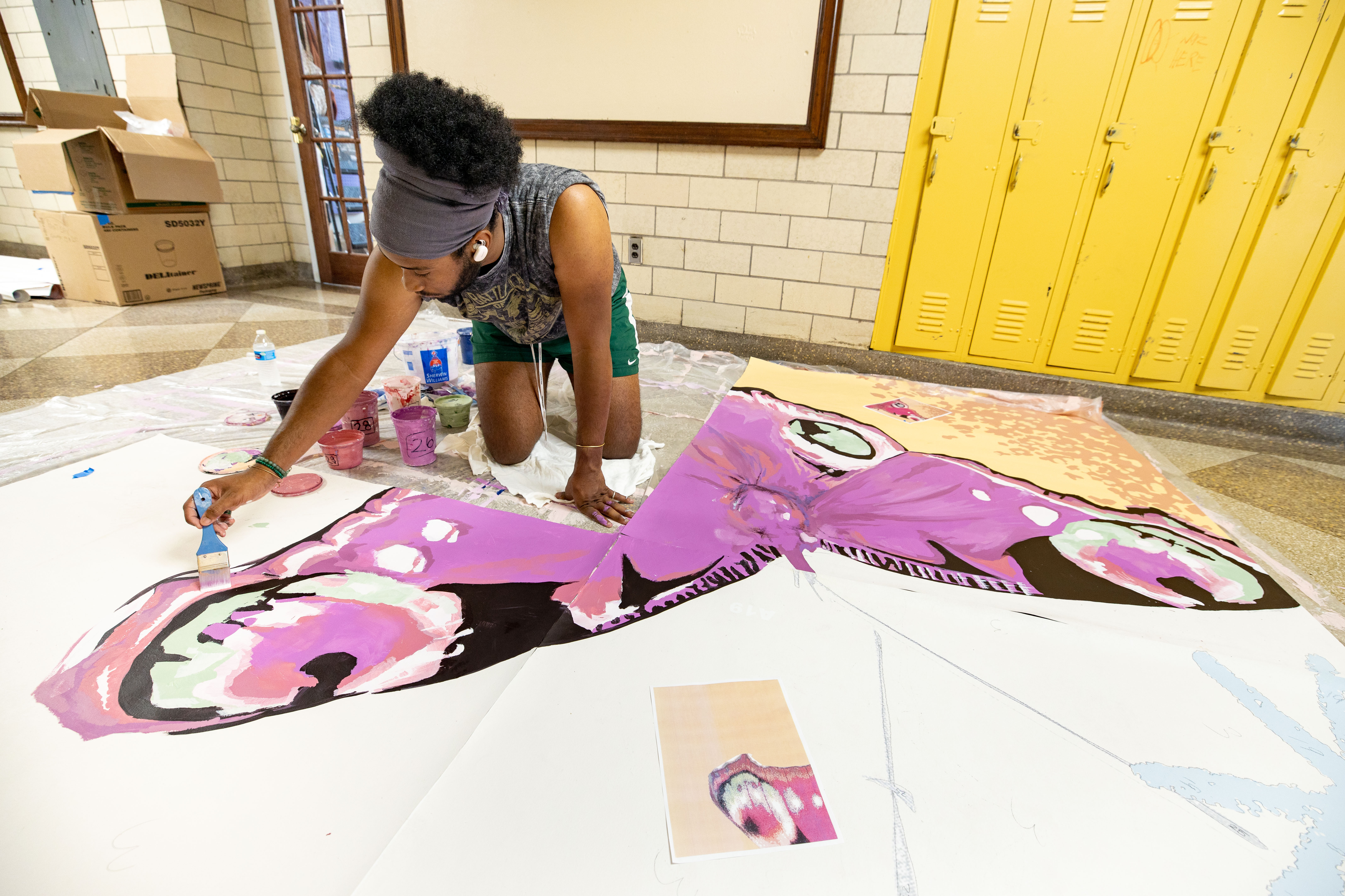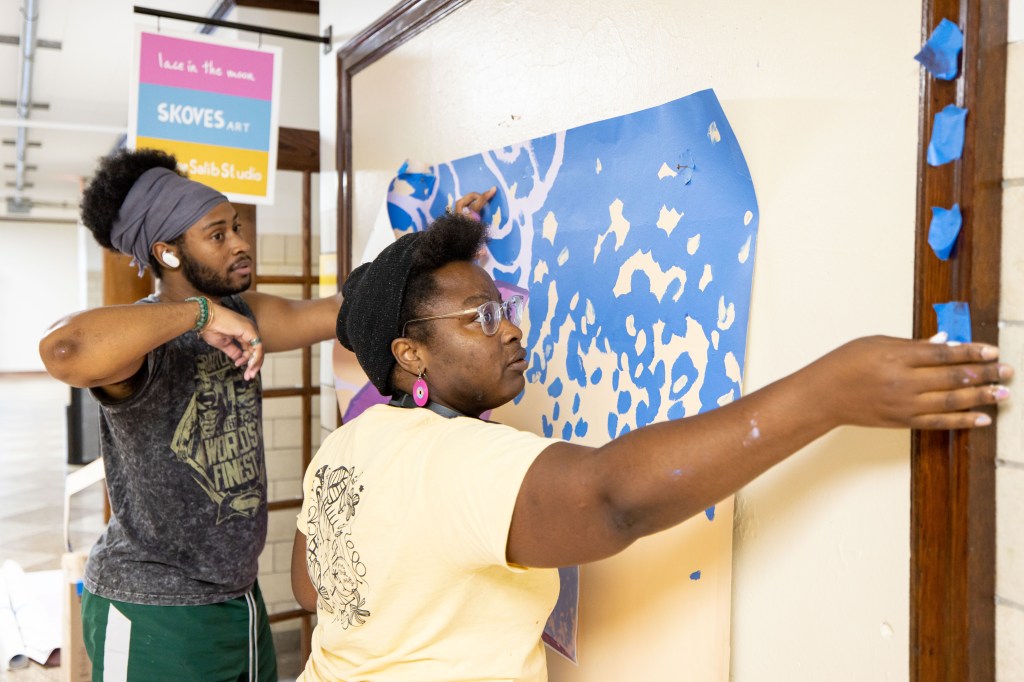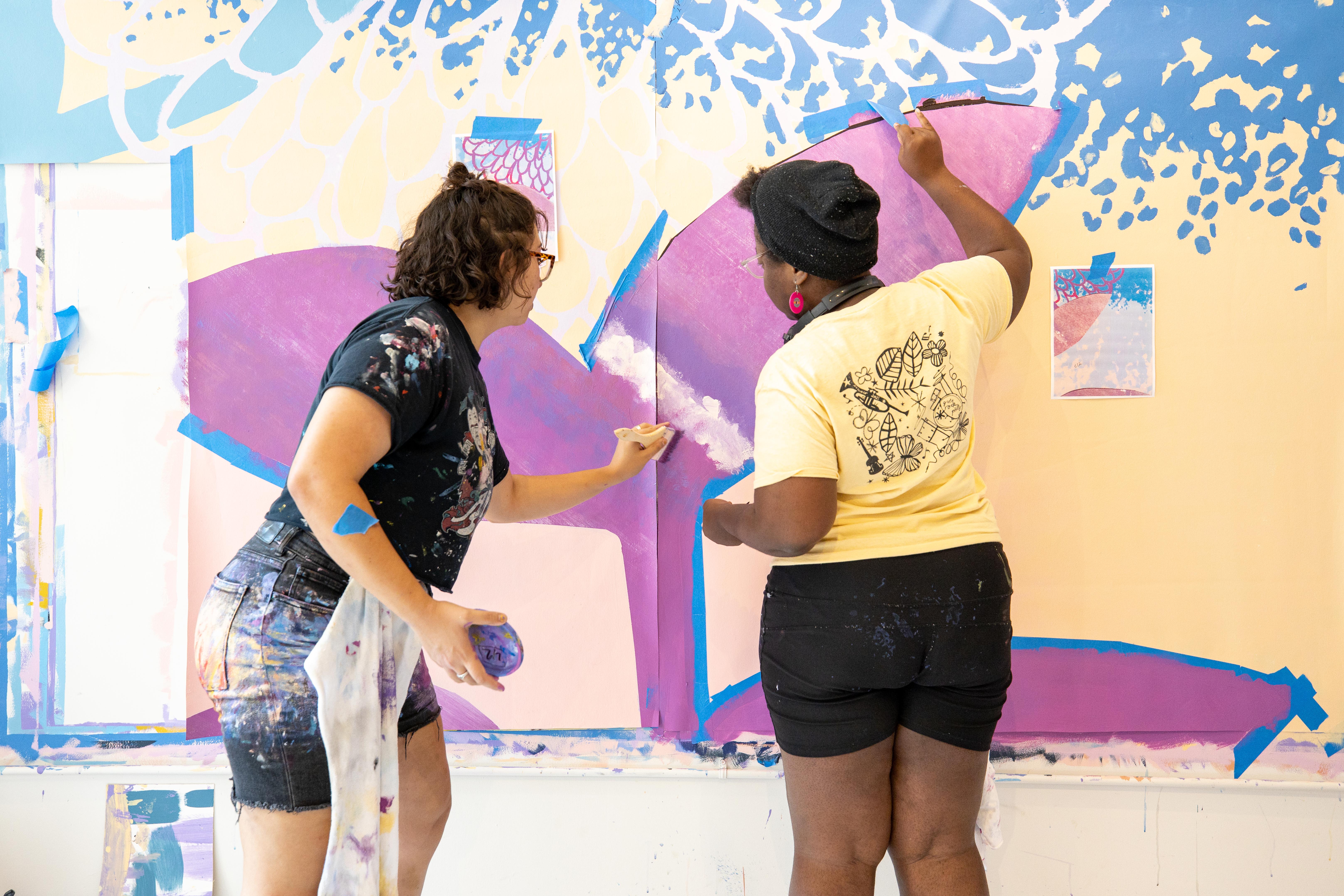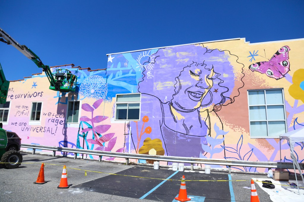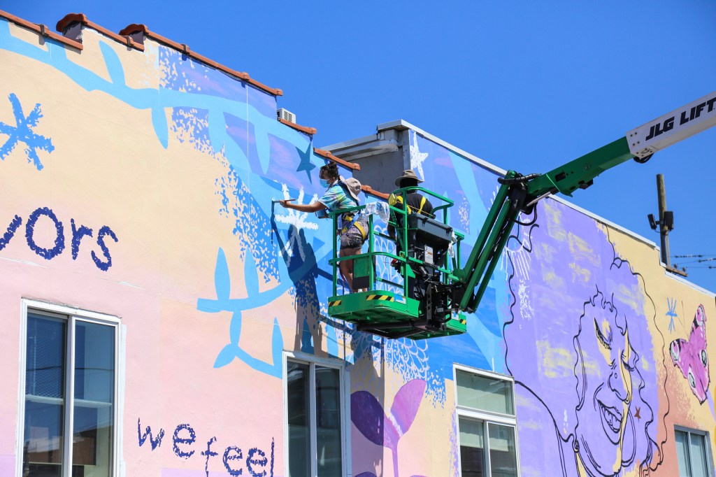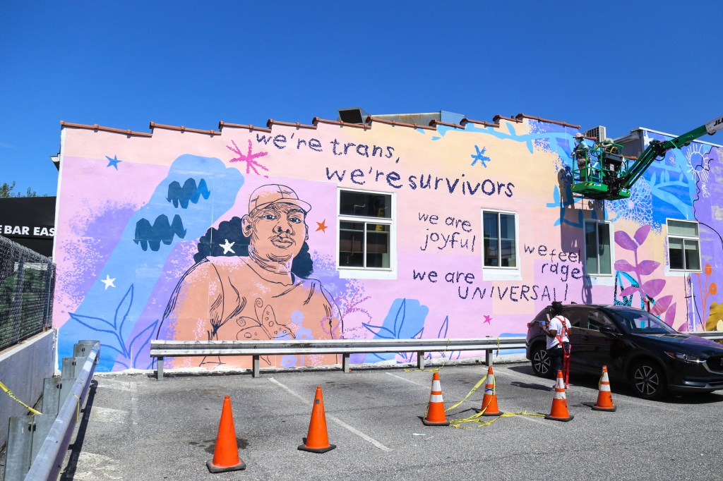 The mural says, “We’re trans/ we’re survivors/ we are joyful/ we feel rage/ we are universal!” And it features two large-scale portraits of two residents of Morris Home, Tazmere Stephens (left) and Jourdyn Carter (right) surrounded by blooming floral imagery and a butterfly in flight.