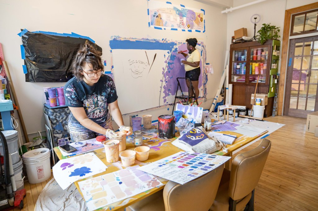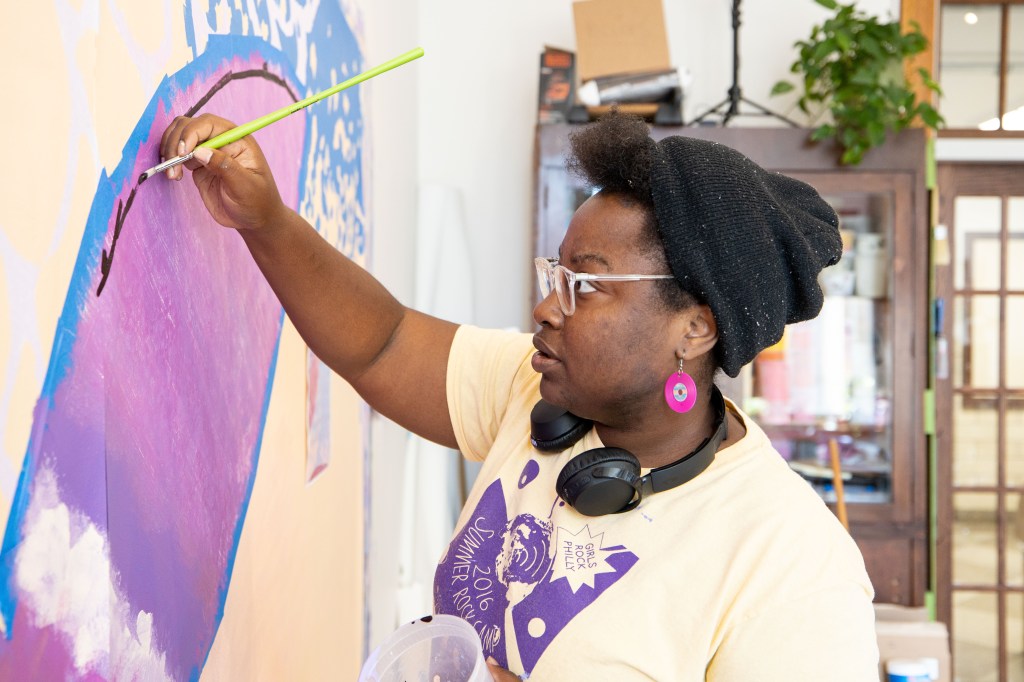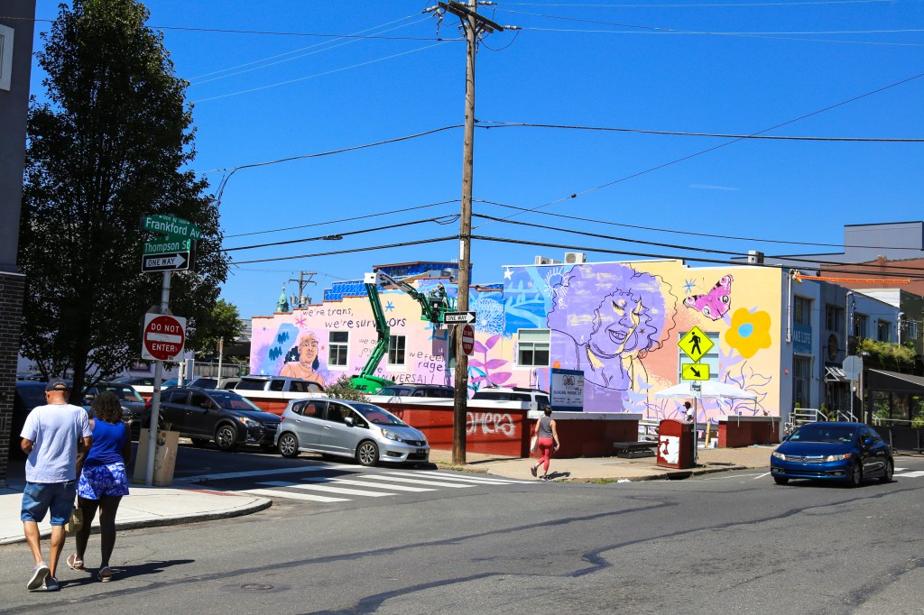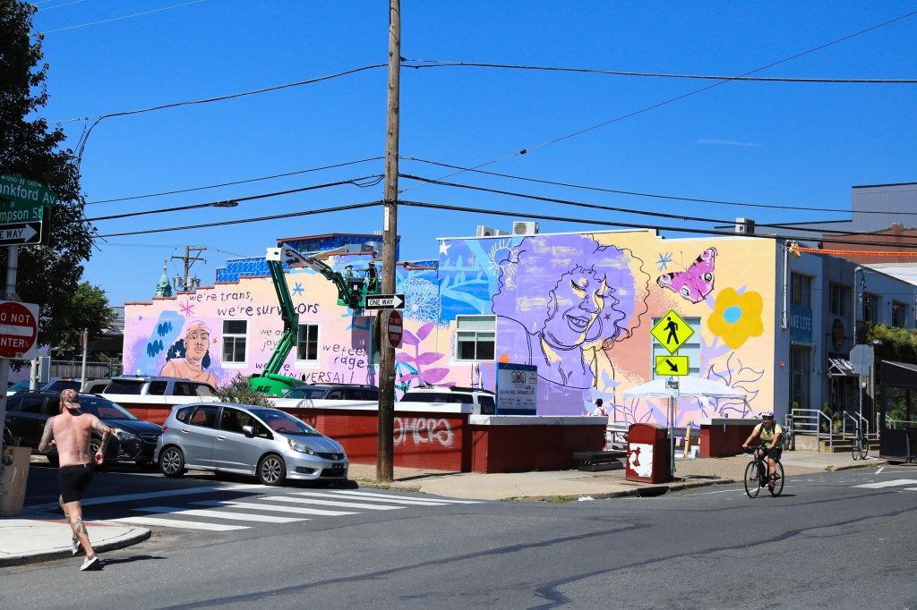 New mural going up in Fishtown right now by Philly-based artist, Kah Yangni celebrates trans and non-binary Philadelphians! Located at Frankford Avenue and Thompson Street, Kah created the mural with Morris Home and Mural Arts Philadelphia’s Porch Light program, along with assisting artists Sammy Kovnat and De’von Downes.