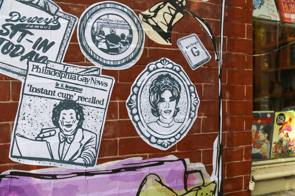 New mural this week by a collaborative group of local LGBTQ+ creatives Nilé Livingston, Nicole Nikolich, Marisa Velázquez-Rivas, and myself (Conrad Benner) celebrates queer joy in Center City! Titled Finding Our Happy, the new mural will be up for one year outside of Philly AIDS Thrift @ Giovanni’s Room at 12th and Pine Streets, created with support from Mural Arts Philadelphia.
