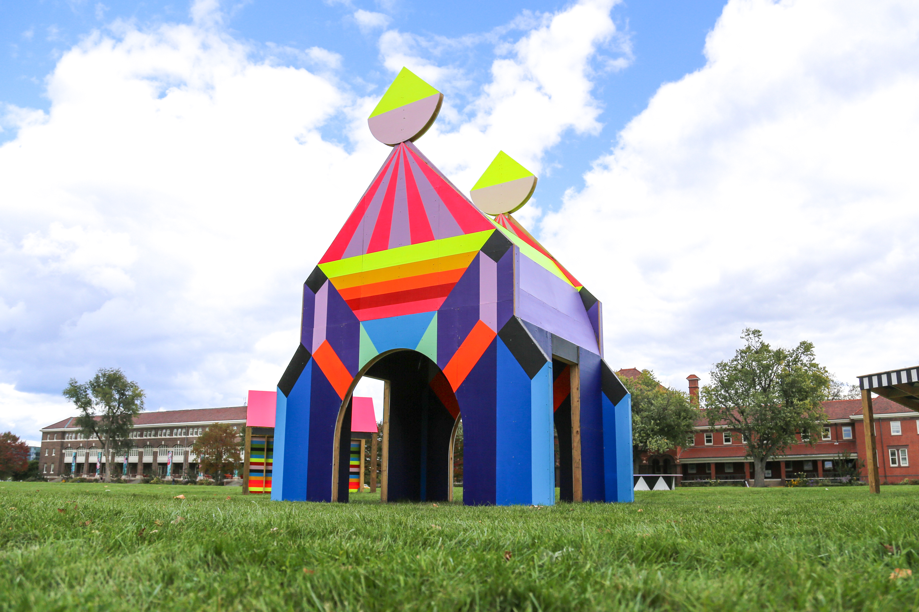 “Magical Fantasy is totally about escapism,” Morag elaborated in a press release about the project. “A place to be alone or to share with others. An embracing arch to draw you through into another world and a place where you can let your imagination take over. Three dwelling structures to spend time in to dream, dance, sing–what ever it makes you feel. They are deliberately small to have a feeling of intensity. The colours and patterns are intense to stimulate the brain. The work is there for people to enjoy and embrace. It was so important to me that the work found the perfect permanent home. As an artist I am very aware that making temporary work that is only up for a few days can be very bad for the environment and we must take responsibility for the work we put into the world, to be aware what materials use their sources and how important giving work as long a life as possible, and then at the end of it that it can be recycled and put back into the system not in landfill.”