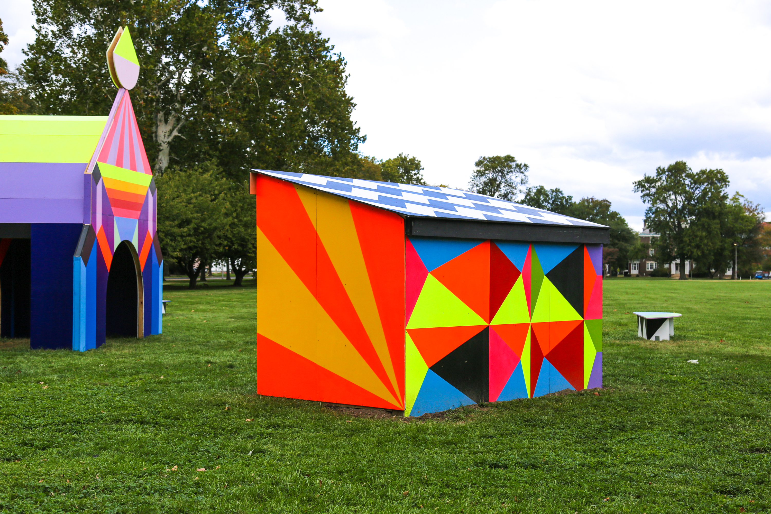 A new installation from London-based artist Morag Myerscough is now located at the Marine Parade Grounds at Broad Street and Constitution Avenue at Philly’s Navy Yard! Created with anonymous Philly-based curatorial Group X, Morag Myerscough initially created the artwork, titled Magical Fantasy, for AEG and the 2021 Firefly Music Festival, a four-day music festival in Dover, Delaware. Through the artist and AEG’s dedication to reuse it has been relocated to the Navy Yard for the public to enjoy for one year: now through the end of October 2022! The Navy Yard is free and open to all to access everyday from sunrise to sunset.