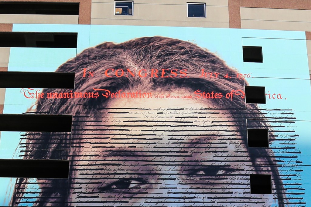Incredible new mural this month from Mural Arts Philadelphia asks its viewers to hold truth to power and examine the spoken and unspoken truths in one of the United States’ founding documents. Conceived by artists Reginald Dwayne Betts and Titus Kaphar as their contribution as fellows with Mural Arts Philadelphia’s Reimagining Re Entry Fellowship, the mural is titled Declaration and it is located at 15th and Race Streets in Center City. To create the mural, Reginald and Titus chose to work with men and women from Mural Arts’ Guild Program, a reentry program for men and women returning from prison, as well as men from the Mural Arts mural program at SCI Phoenix.