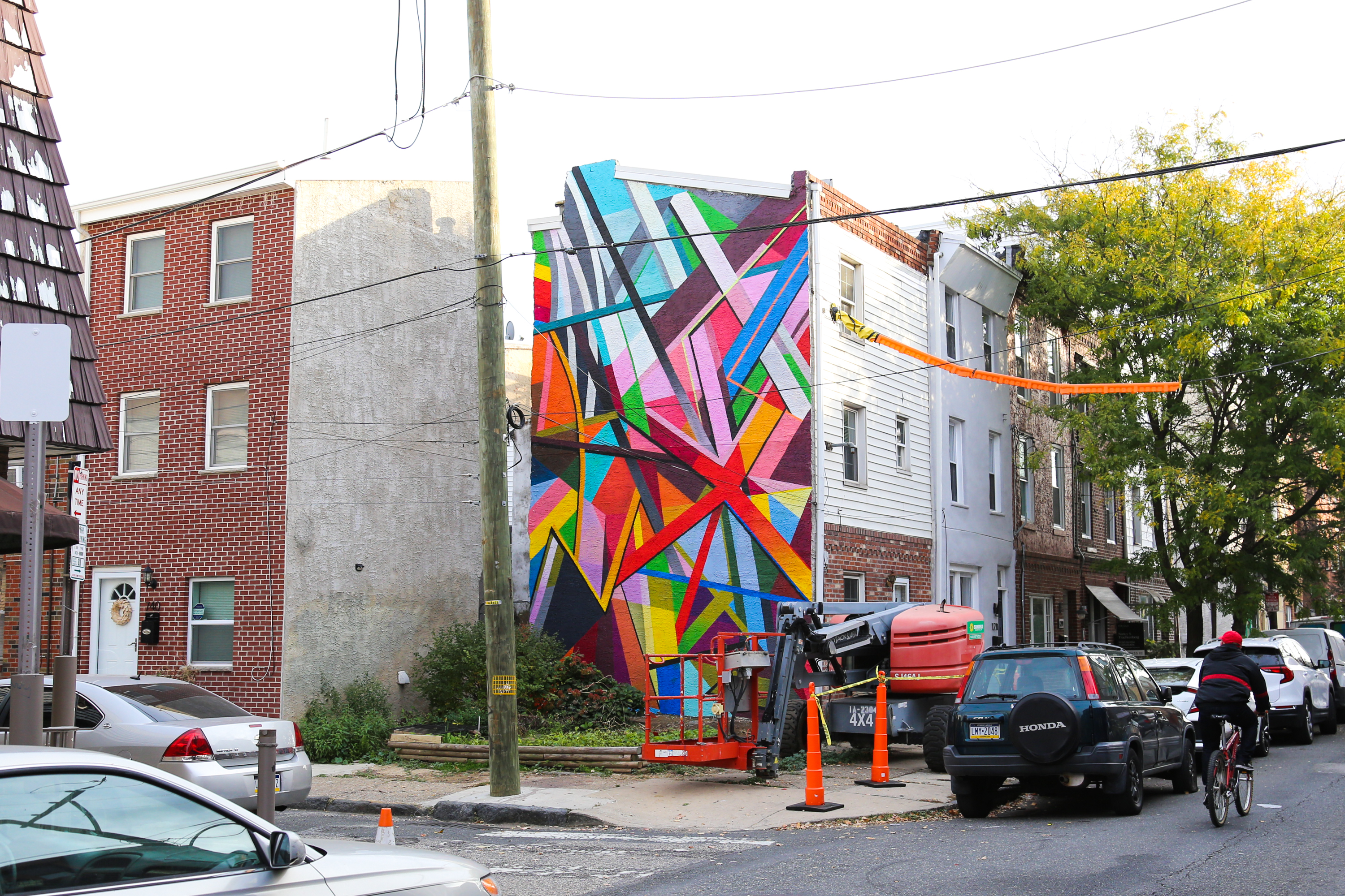 New mural completed this week by artist Andrea Grasso, located at 8th and Manton Streets in South Philly! Titled Convergence, the mural was created with Mural Arts Philadelphia. It’s the latest in a seemingly growing number of awesome abstract murals coming from the organization, including this recent one from artist Tim McFarlane.