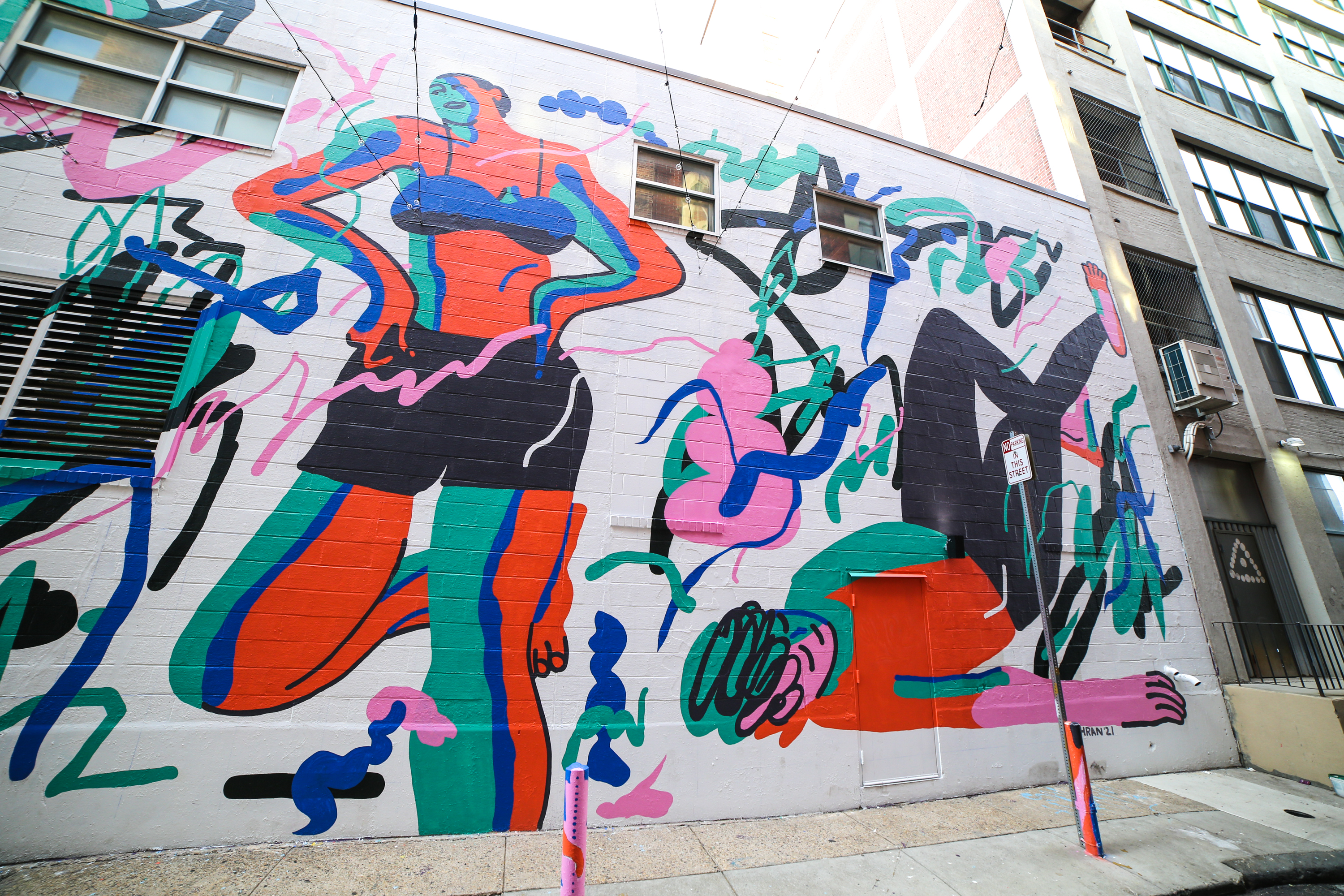 New mural this month by Brooklyn-based artist Josh Cochran located on Pearl Street between 12th and 13th Streets! Created with the Asian Arts Initiative, this mural, titled Strobe Lights, is Josh’s second in Philly and the largest mural he’s done anywhere. (His other Philly mural is on the Henry C. Lea Elementary in West Philly, by the way.)
