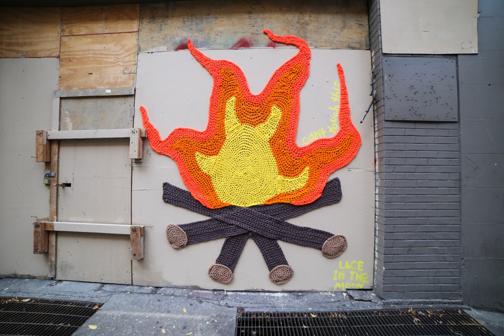 Philly street artist Nicole Nikolich (aka Lace in the Moon) has just installed her latest yarnbomb that’s warming Philadelphians spirits during what feels like an unusually frigid late fall! Installed this week on Pine Street at Broad Street, the artist’s campfire inspired artwork also has a fun secret for anyone who follows her on social media.