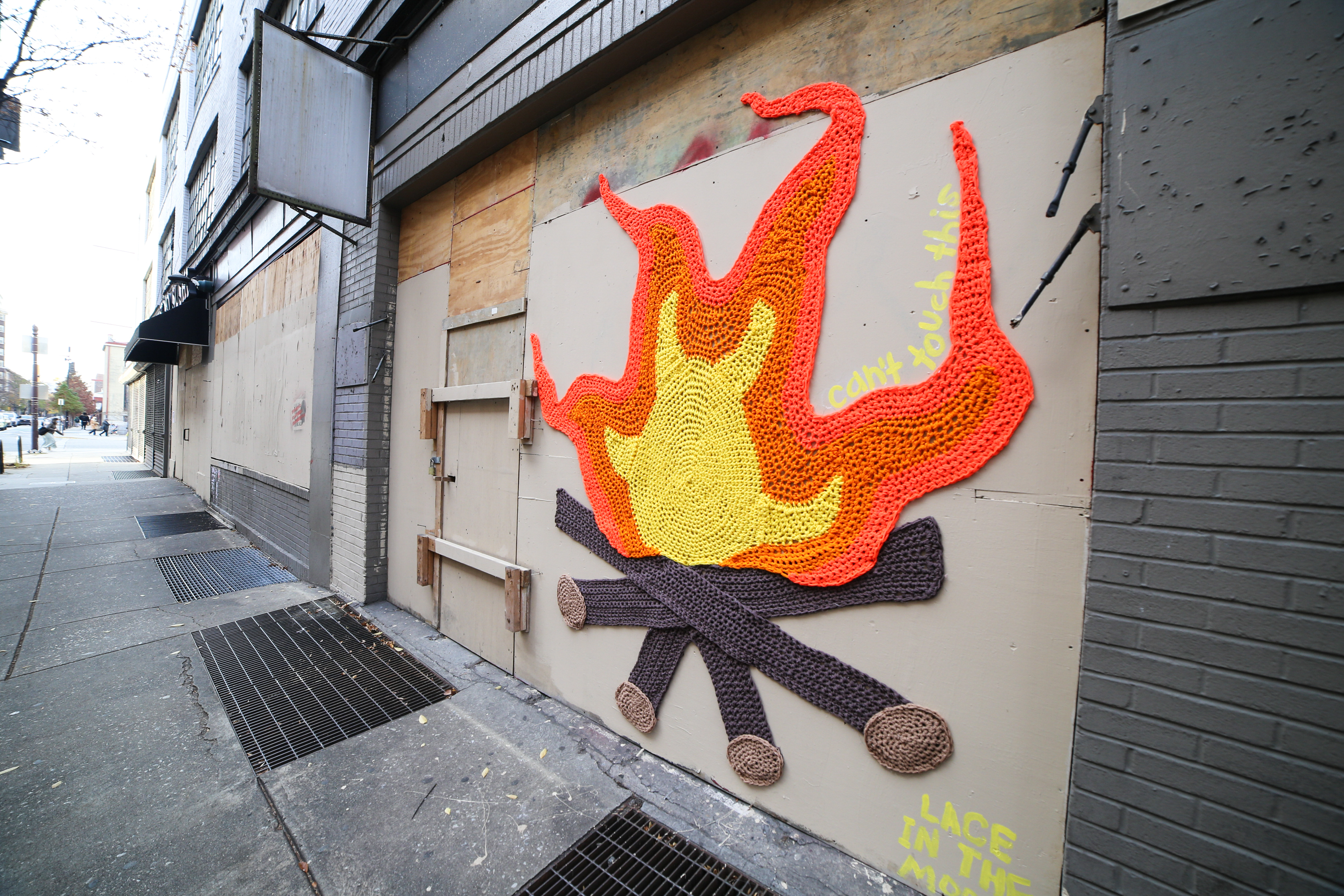 Philly street artist Nicole Nikolich (aka Lace in the Moon) has just installed her latest yarnbomb that’s warming Philadelphians spirits during what feels like an unusually frigid late fall! Installed this week on Pine Street at Broad Street, the artist’s campfire inspired artwork also has a fun secret for anyone who follows her on social media.
