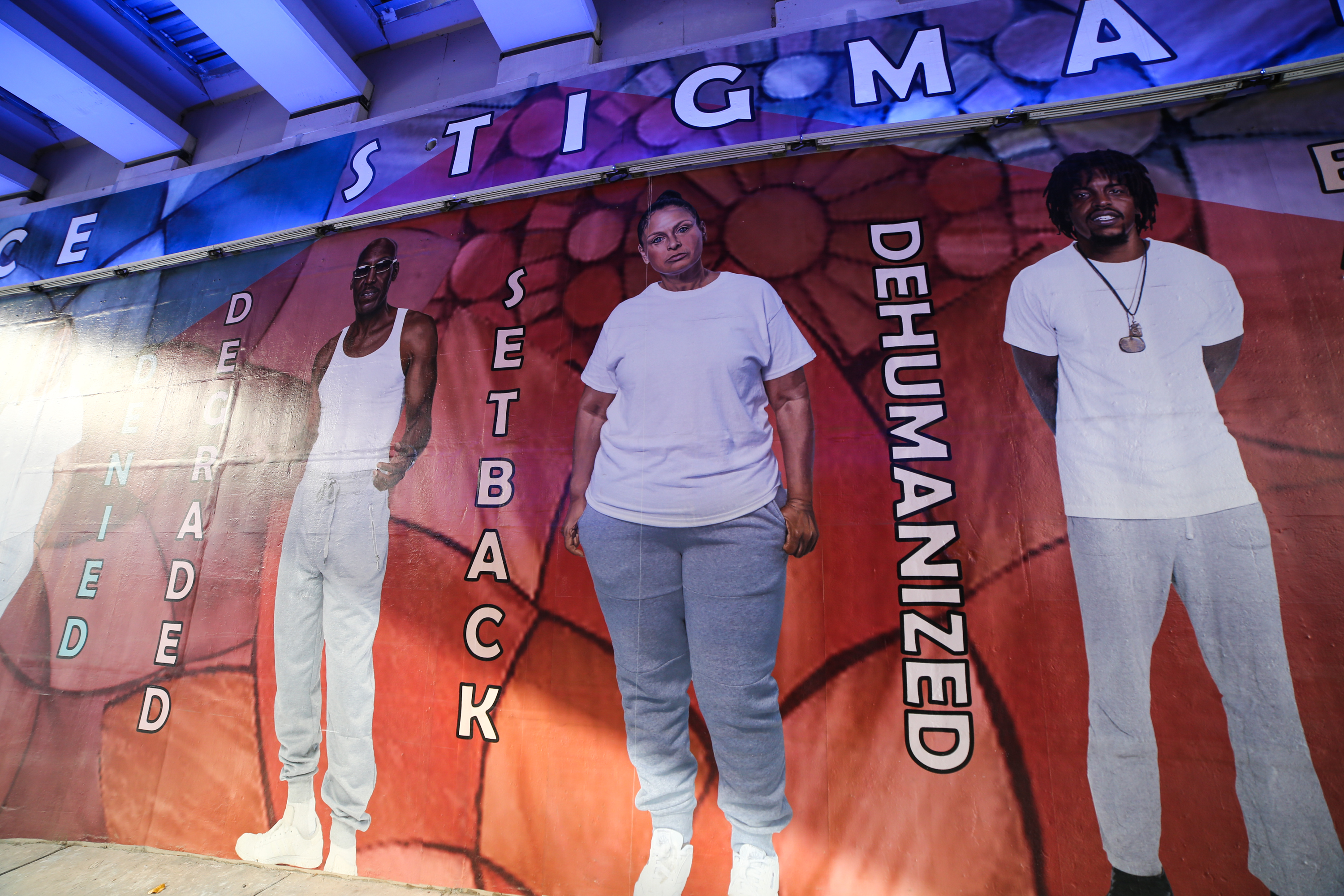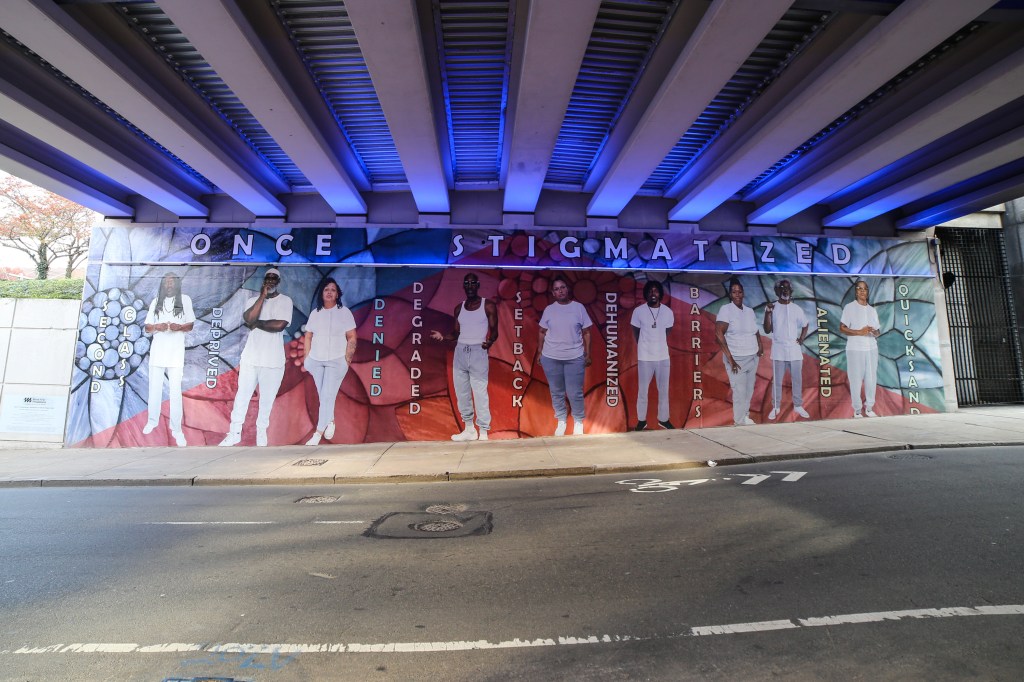 New mural, titled Point of Triangulation: Intersection of Identity, invites viewers to challenge their own stigma towards formerly incarcerated people. Located at 21st Street and JFK Boulevard, the mural was created by artists Michelle Jones and Deborah Willis with support from Mural Arts Philadelphia.