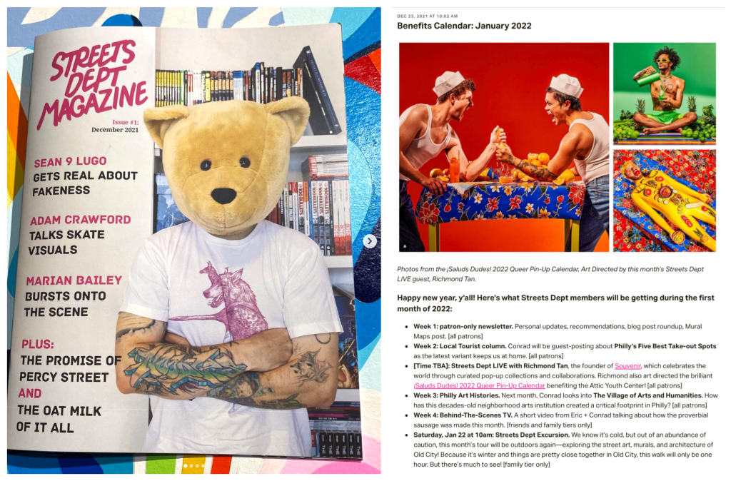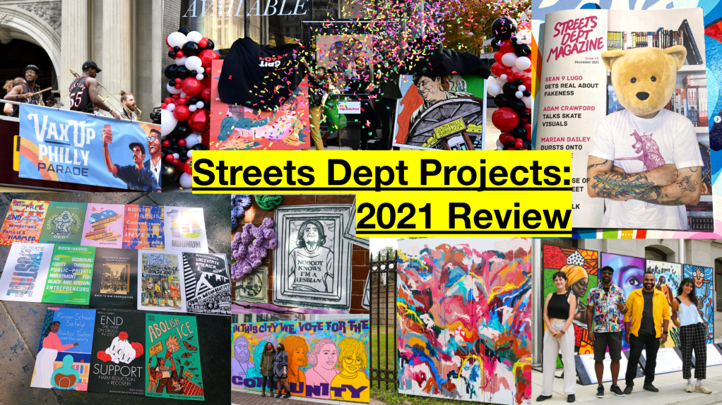 I can’t tell you how incredible it’s been to launch a Patreon this year! Thanks to nearly 100 Streets Dept Patreon subscribers (and growing monthly), we’re now able to create more articles exploring Philly’s art histories, create public art maps, build suggestions for local tourism, offer seats to our virtual (Zoom) audience for live recordings of the Streets Dept Podcast, host monthly tours of Philly’s art world, and last but not least release Streets Dept’s first-ever print magazine.