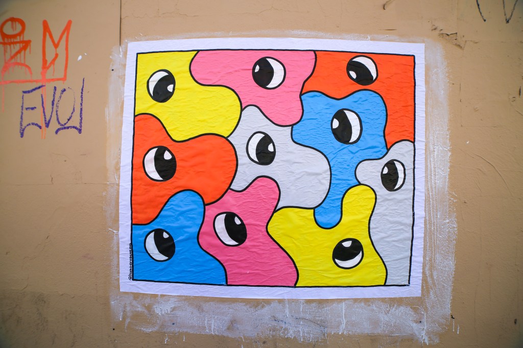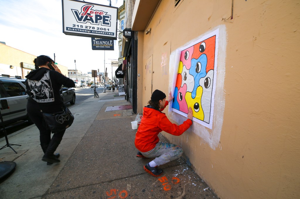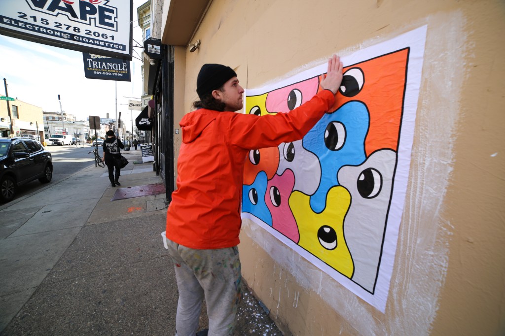 “I first got into art when I was in middle school, but drifted away from it over time. As I got older (early 20s) I was struggling with my mental health, and needed an outlet to express my feeling so I got back into it. A little while later I decided to start taking it more seriously and devoting mostly all of my time to art. I didn’t go to school for art, so I pretty much just tried a bunch of stuff until I arrived at a style that I felt really suited me. A few artists that inspire me are KAWS, Gabriele Bruns, and Keith Haring. As far as how I got into street art, it really started because I wanted to share my art with as many people as possible. I love the city of Philadelphia, I was born and raised here, so I wanted to share it with the people of the city. My work is really bright and colorful, so my hope was that the colors in my work could positively affect the people who see it. It was a bit of trial and error when I first started pasting up, but I really just took a leap and went for it.”
