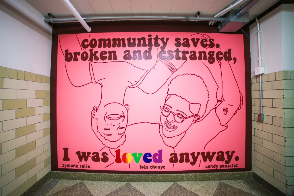 Titled You Are My Other Me, Symone wrote the following about their new mural on Instagram: “You Are My Other Me is a mural that celebrates queer relationships in all their forms and how they foster collective healing. Platonic relationships, romantic relationships, and everything in between have been such a huge part of my growth and healing throughout my 20’s. It was literally dreamy to create this mural with Candy Alexandra González that was inspired by our trauma informed queer exploration art class, centered for BIPOC folks, that was funded through the Art and Change Grant by the Leeway Foundation. Throughout the series of classes we talked about our journeys of how we all have blossomed into our most authentic selves and created art about it. Through a writing activity we facilitated, Lois Cheaye, wrote this beautiful poem that is featured on the mural. This mural was truly a collaboration in all its forms.”