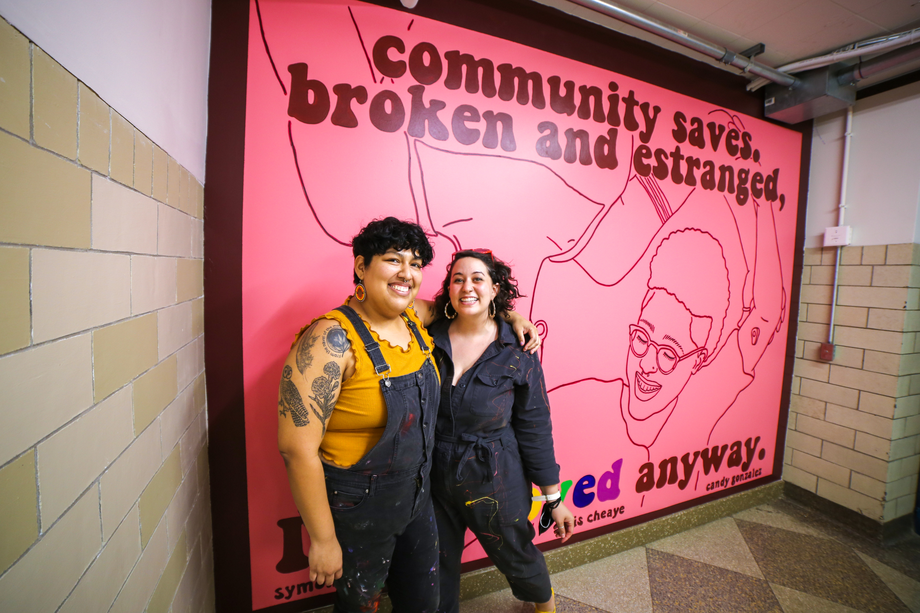 Titled You Are My Other Me, Symone wrote the following about their new mural on Instagram: “You Are My Other Me is a mural that celebrates queer relationships in all their forms and how they foster collective healing. Platonic relationships, romantic relationships, and everything in between have been such a huge part of my growth and healing throughout my 20’s. It was literally dreamy to create this mural with Candy Alexandra González that was inspired by our trauma informed queer exploration art class, centered for BIPOC folks, that was funded through the Art and Change Grant by the Leeway Foundation. Throughout the series of classes we talked about our journeys of how we all have blossomed into our most authentic selves and created art about it. Through a writing activity we facilitated, Lois Cheaye, wrote this beautiful poem that is featured on the mural. This mural was truly a collaboration in all its forms.”