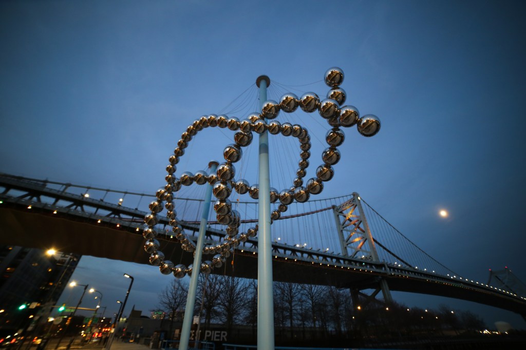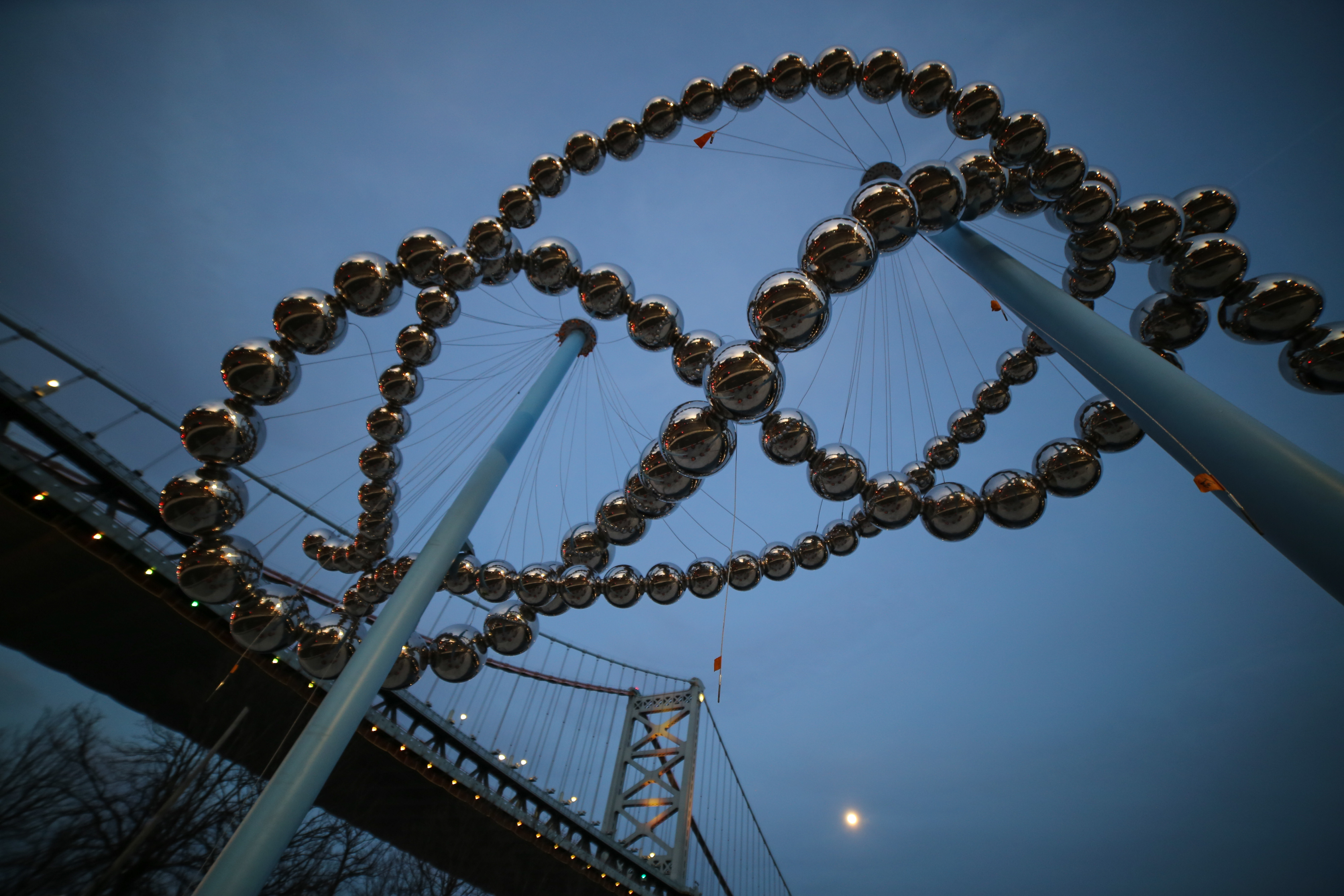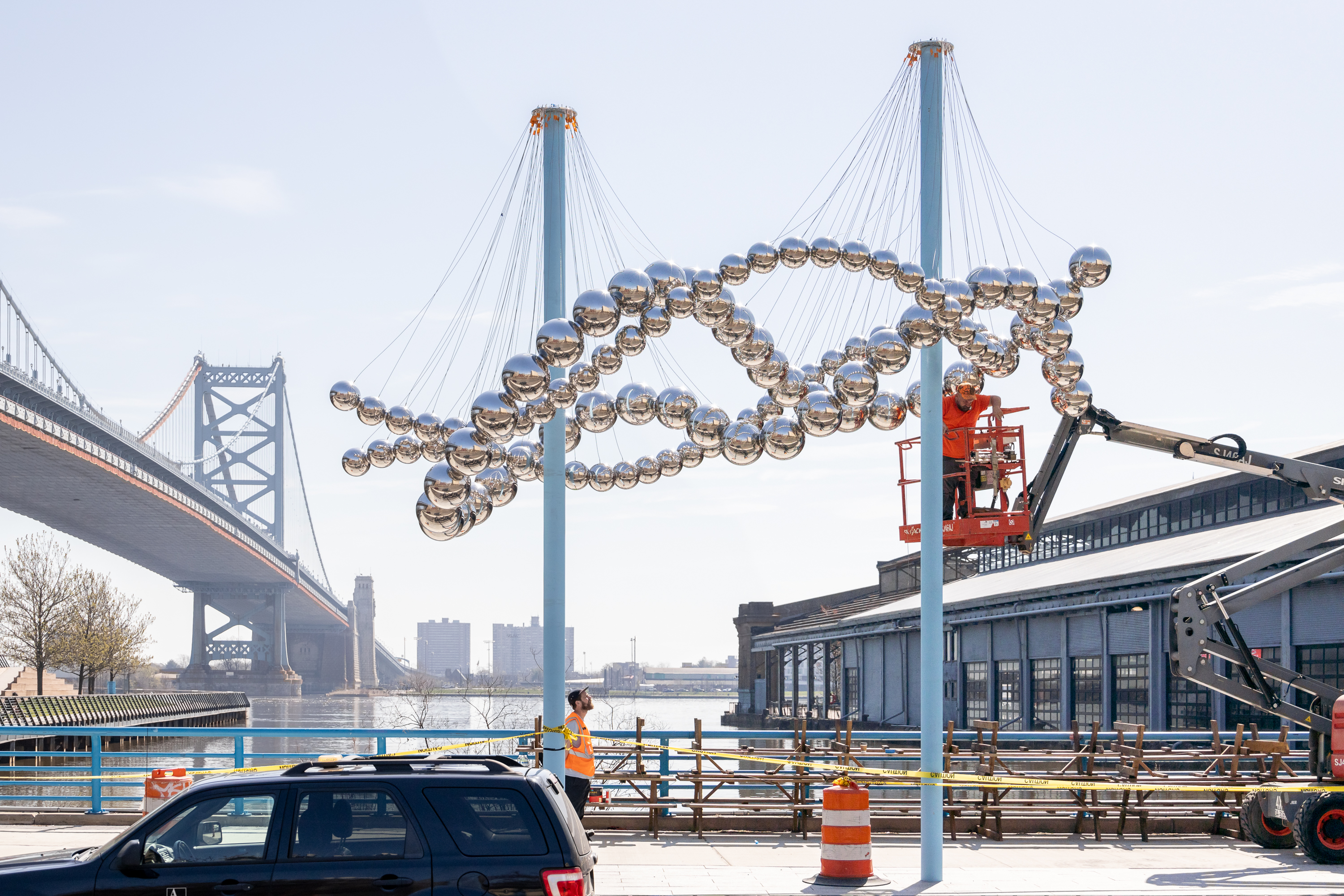 “The artwork takes the form of a giant knot constructed in stainless steel spheres that are suspended overhead from tall poles suggestive of the sail and ‘cargo masts’ that once operated on the boats and wharves at the River Trail site. Further drawing from its setting, the blue tone of the poles is matched 1:1 to the paint of the Benjamin Franklin Bridge.”