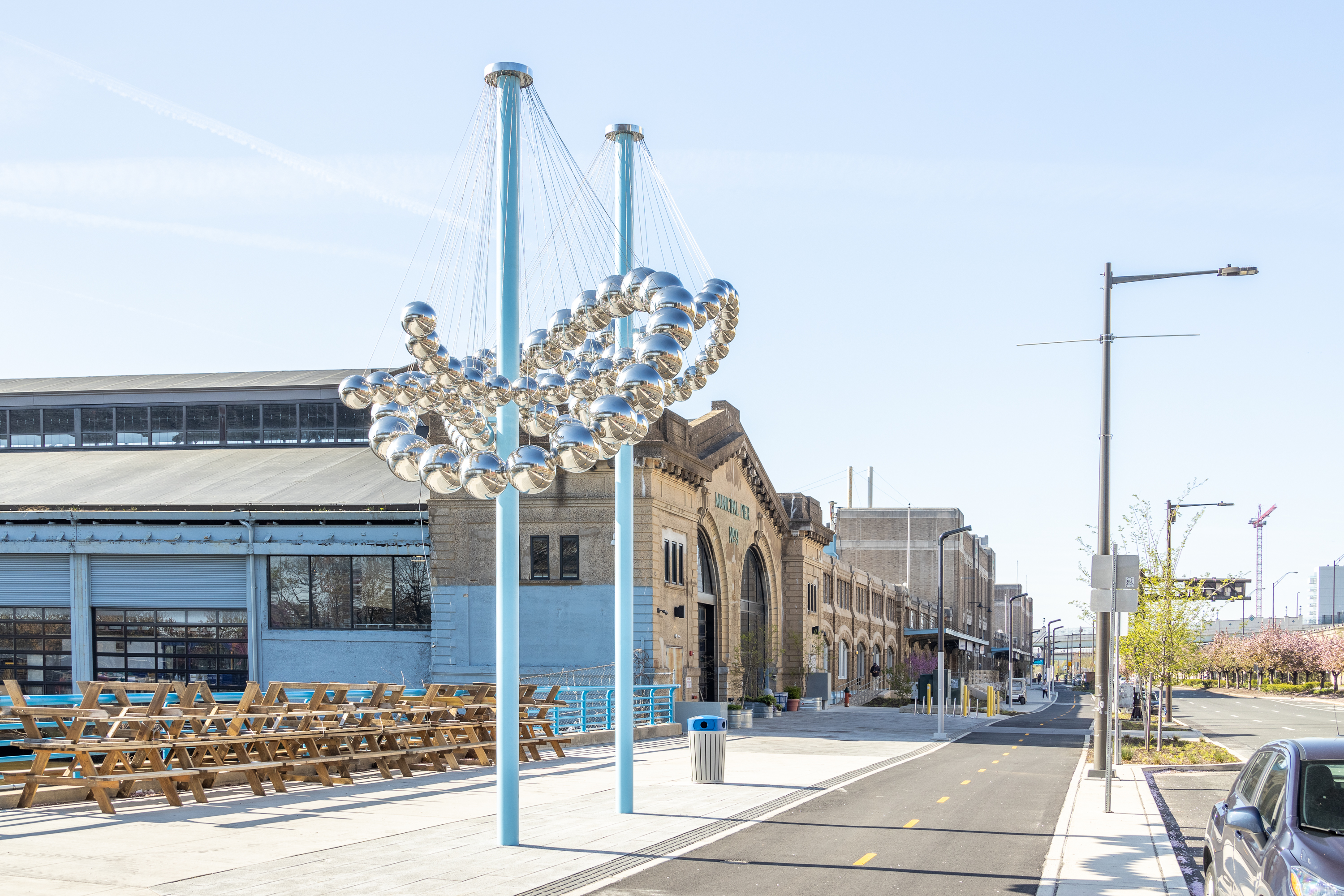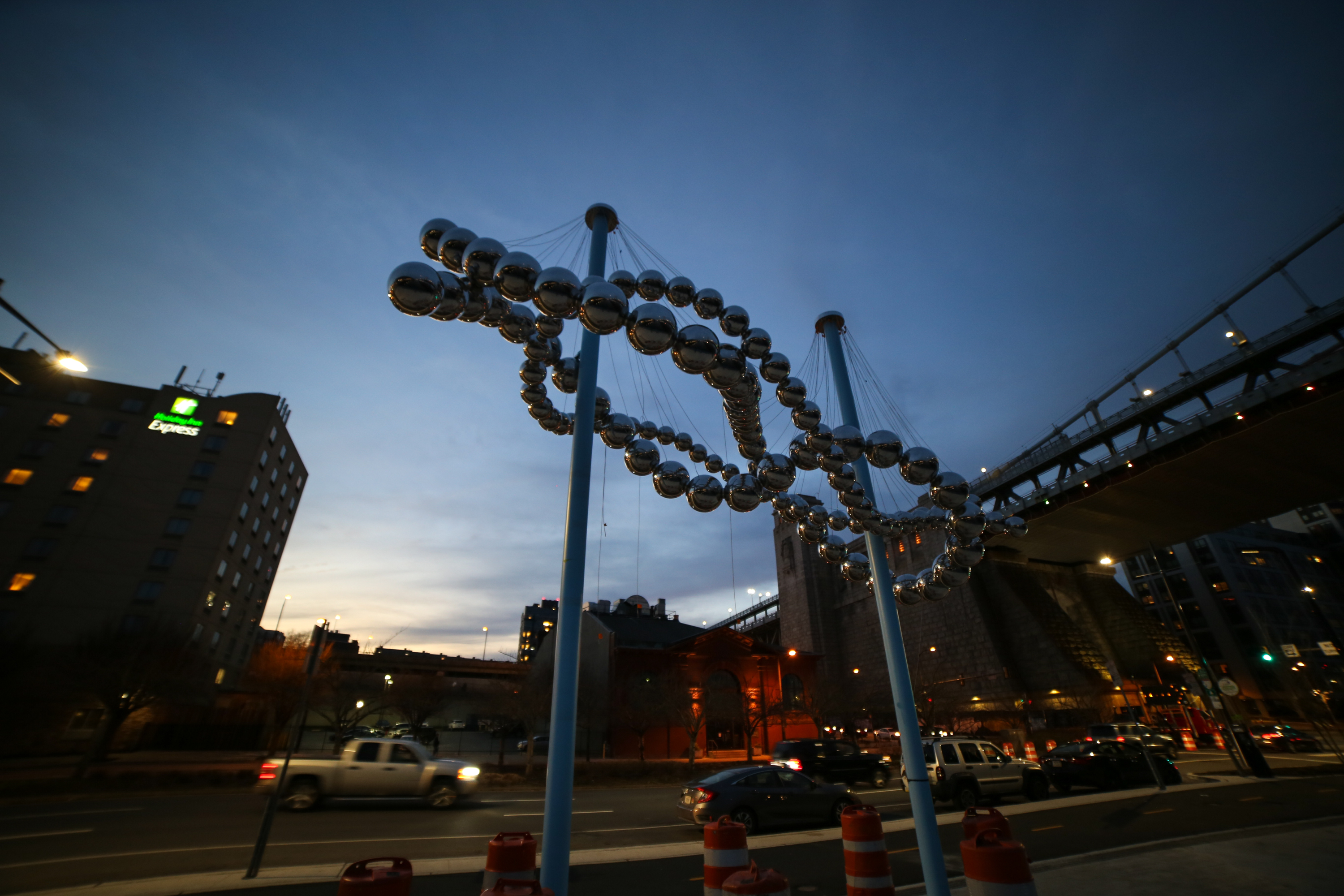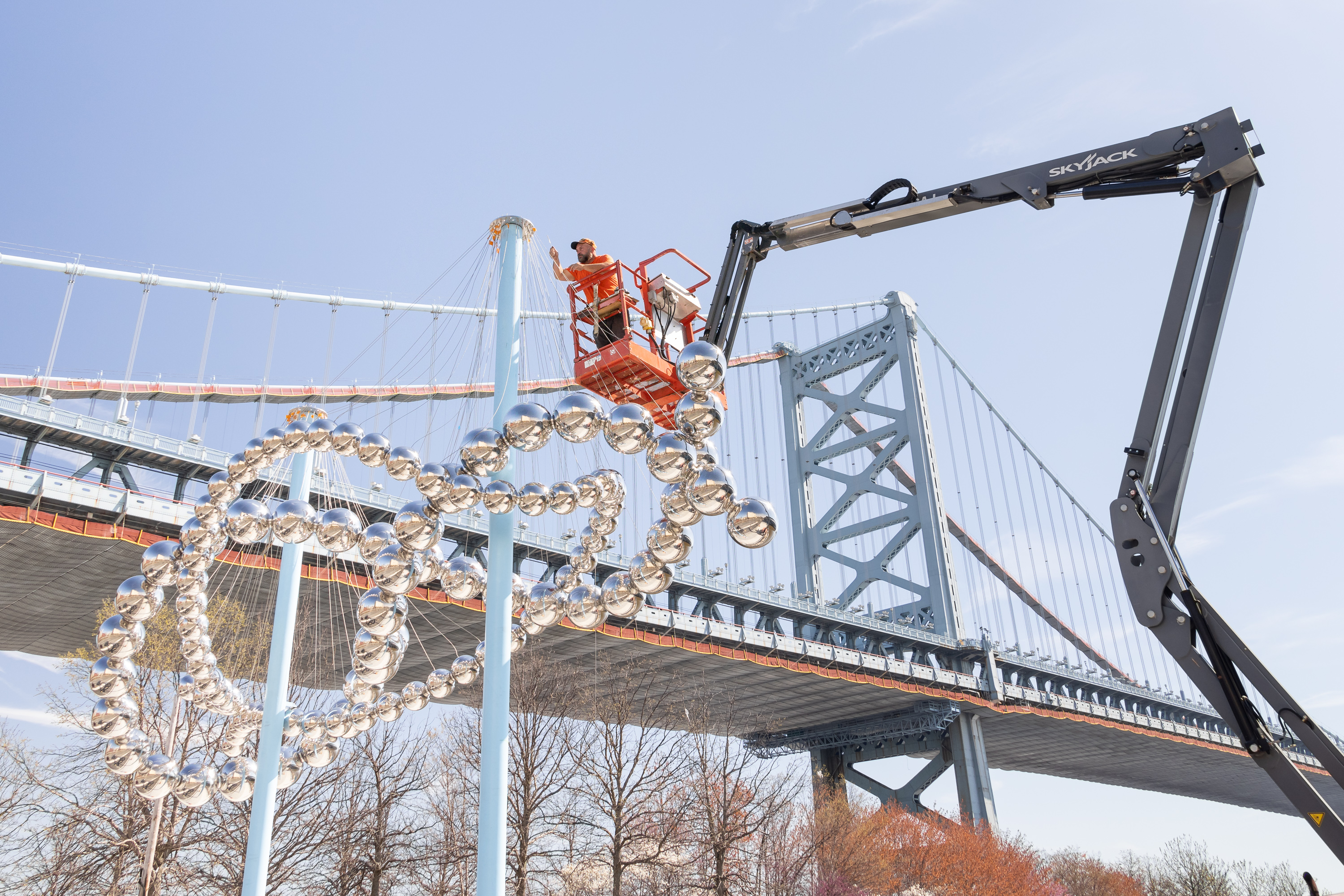 “The artwork takes the form of a giant knot constructed in stainless steel spheres that are suspended overhead from tall poles suggestive of the sail and ‘cargo masts’ that once operated on the boats and wharves at the River Trail site. Further drawing from its setting, the blue tone of the poles is matched 1:1 to the paint of the Benjamin Franklin Bridge.”