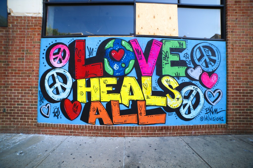 A touching new mural was created yesterday by Philly-based artist BKLvisions. The mural, which reads “love heals all,” was created on the plywood that was put up after the mass shooting that took place on South Street earlier this month; South Street at 3rd Street.