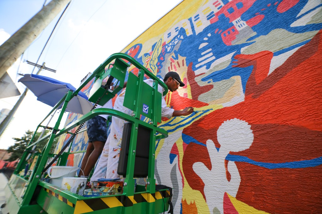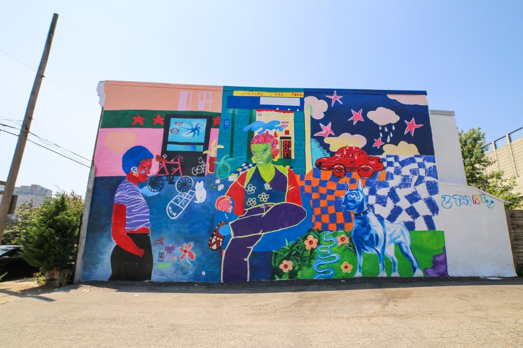 Artist Statement: “Living in an urban environment can be stressful and chaotic at times, however I try to find the moments where I can convey relief and ease. In this mural I capture that moment of joy and relief from unpleasant realities by seeking entertainment in fantasy. The butterflies move from one side to the other representing the embrace of transformation. The characters channel a childlike liberation and cartoony elasticity. I hope the viewer can see themselves here, in this city, surrounded by buildings, trying to find happiness and lightness within the concrete city.”