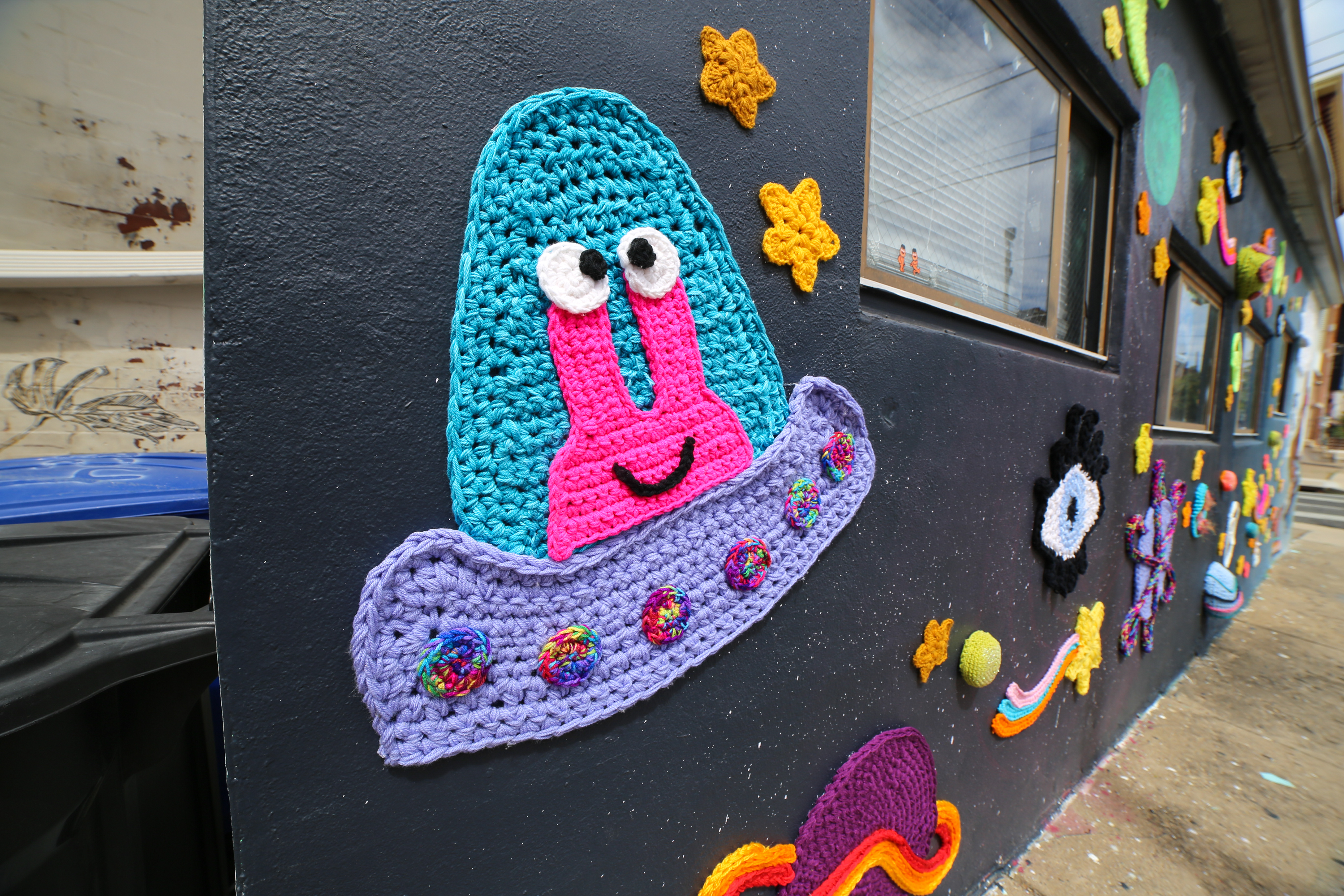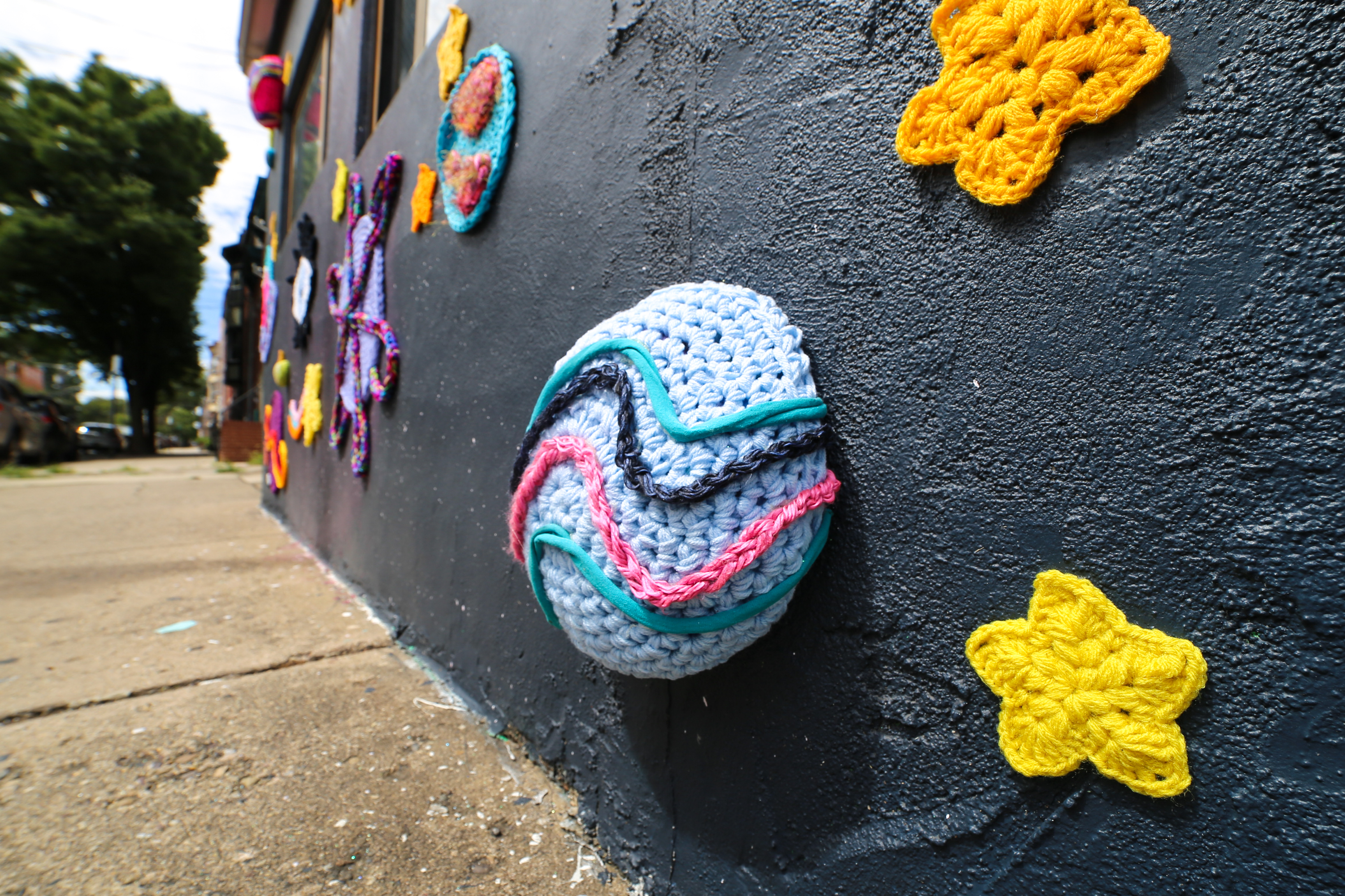 Love this new collaborative mural from Philly-area street artists Sean 9 Lugo and Nicole Nikolich (aka Lace in the Moon) located at 12th and Christian Streets in South Philly! Titled LoSt iN sPaCe, the mural features space-themed yarnbombs from Nicole and a wheatpaste portrait of Nicole creating the mural from Sean. How clever! (You can even watch a quick video of how the pair installed the mural on Instagram here.)