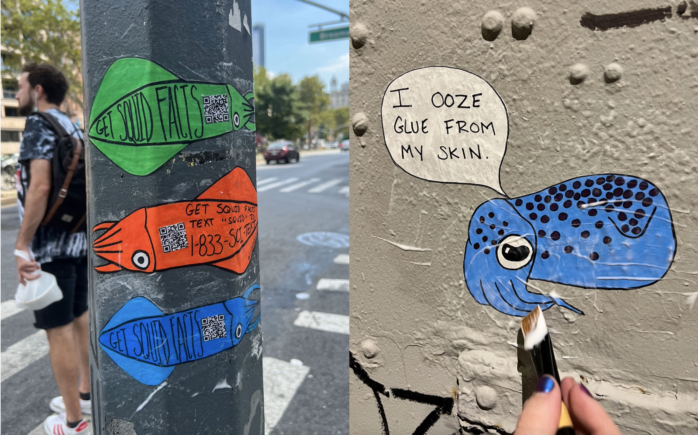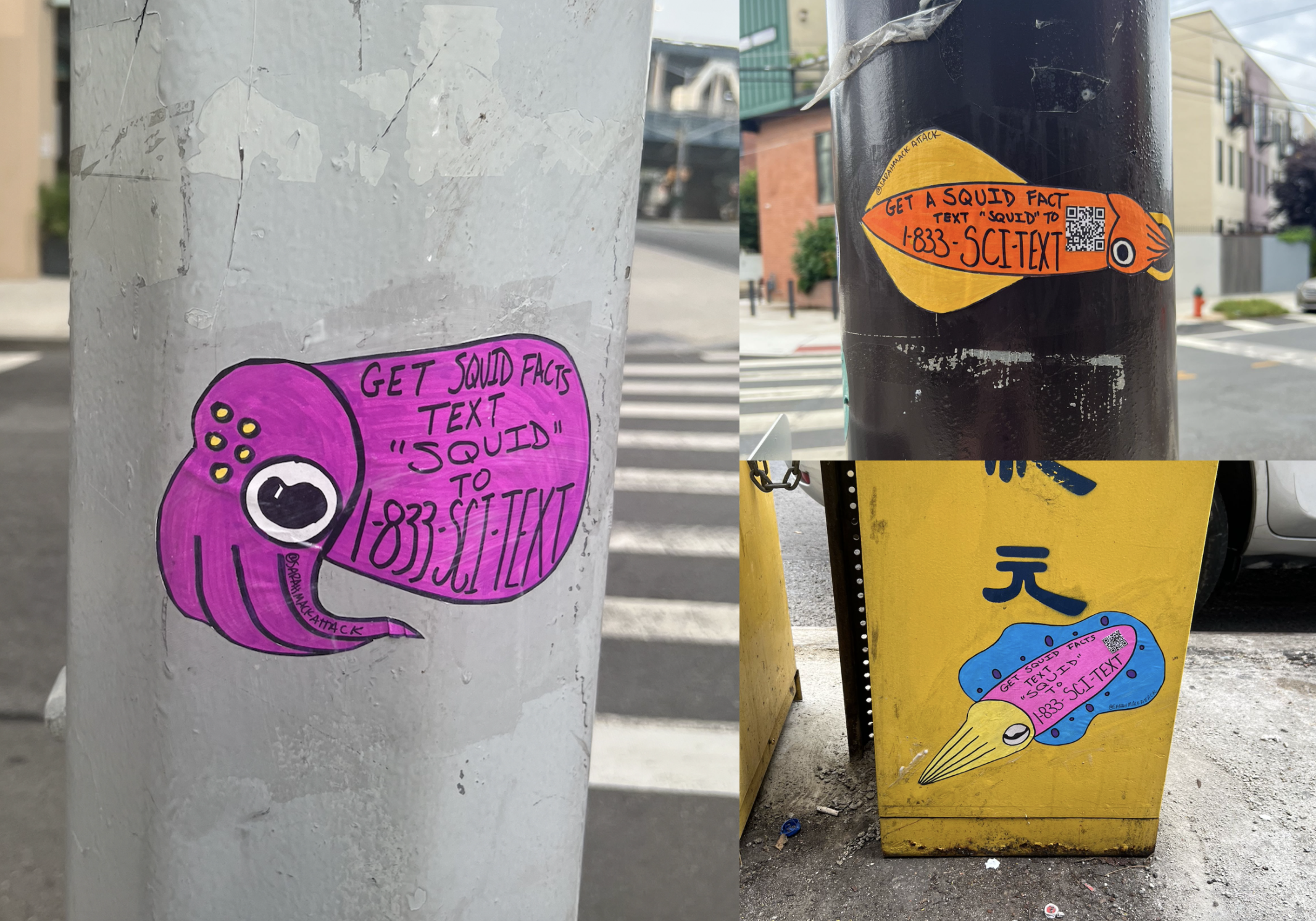So why a street art project? “Social media silos us so badly and it’s really hard to break through to new people. I love street art for that reason. You don’t need an instagram to play with the squid facts hotline. It reaches anybody walking by the pole I just glued a squid to. I love that. Squid for everyone.”
