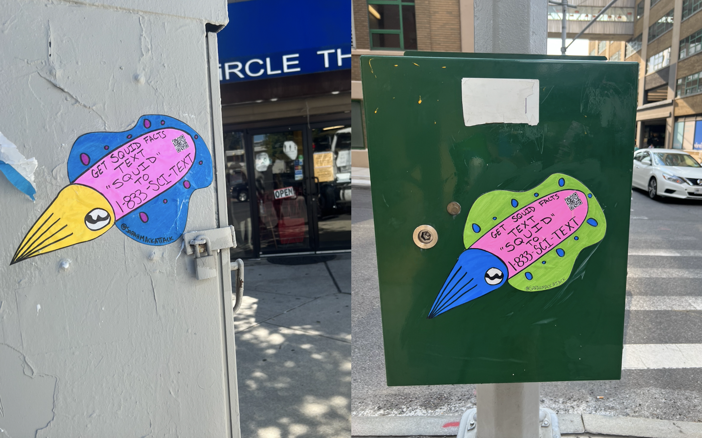 And what Sarah is learning with this street art project, she’s taking back to her larger education work: “At my day job, I’m the Executive Director for an informal science education nonprofit called Skype a Scientist. We’re all about making science accessible to everyone, and the SquidFacts Project is a little playground for me to see what works and what doesn’t when doing informal science education on the street.”