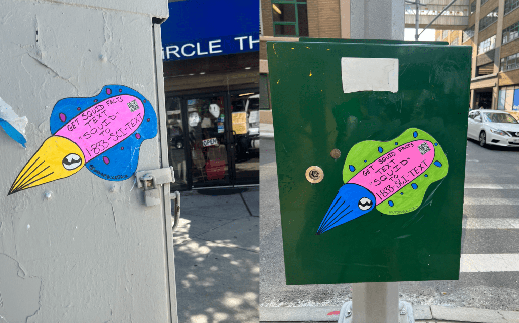 If you’ve been around Philly recently, there’s a good chance you’ve come across a new street art project aimed at delivering facts about a specific sea creator. Created by popular Philly-based scientist, Sarah McAnulty, this “SquidFacts” project installs small hand-drawn squid wheatpastes around Philly that prompt its viewer to text a number or scan a QR code to get facts about squids. Yes, squids!