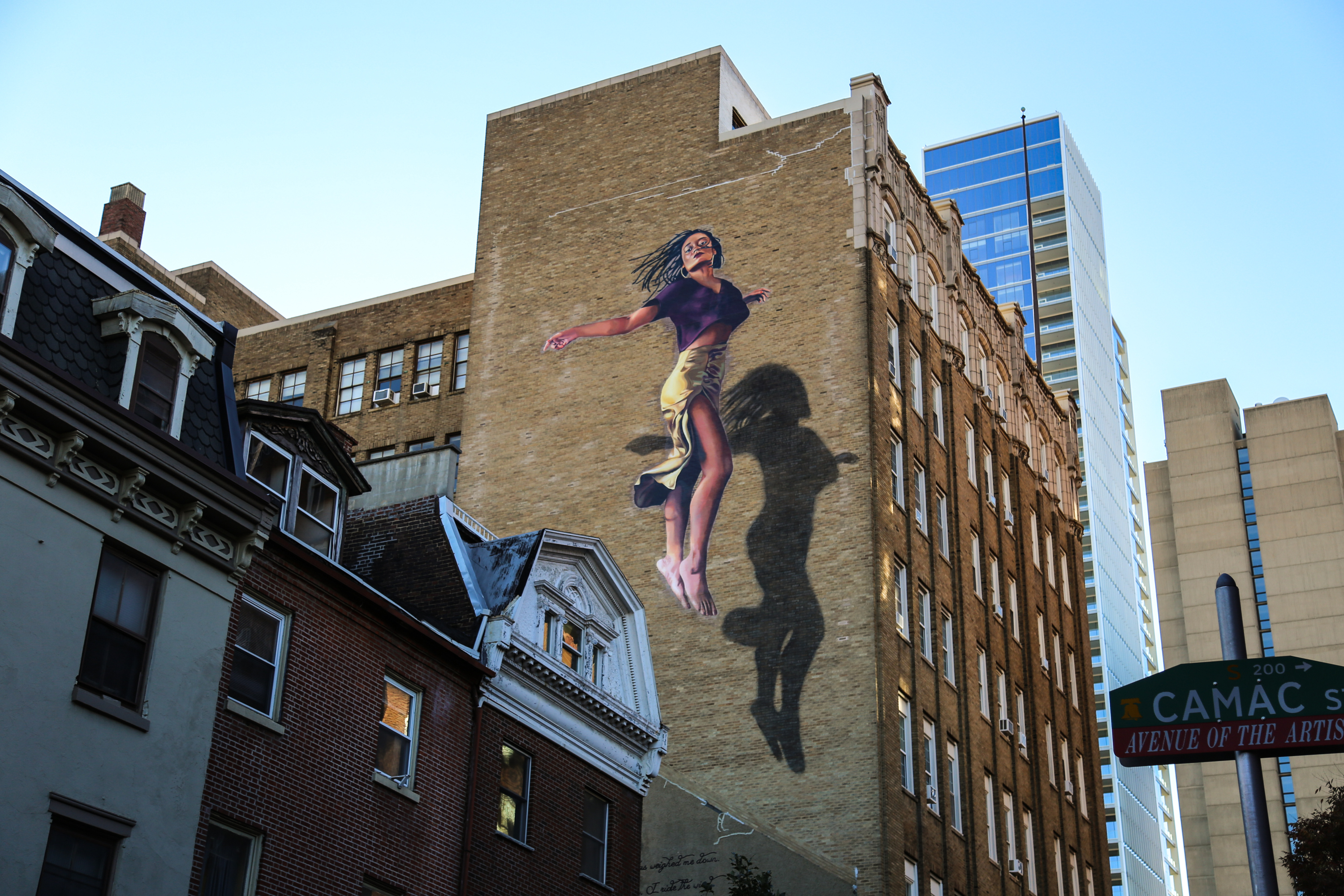 “Flight pictures what it would be like for Black people to rise off the ground into the sky,” a statement about the mural reads on Mural Arts’ website. “Imagining ‘flying’ as a metaphor for liberation, escape, and transformation.”