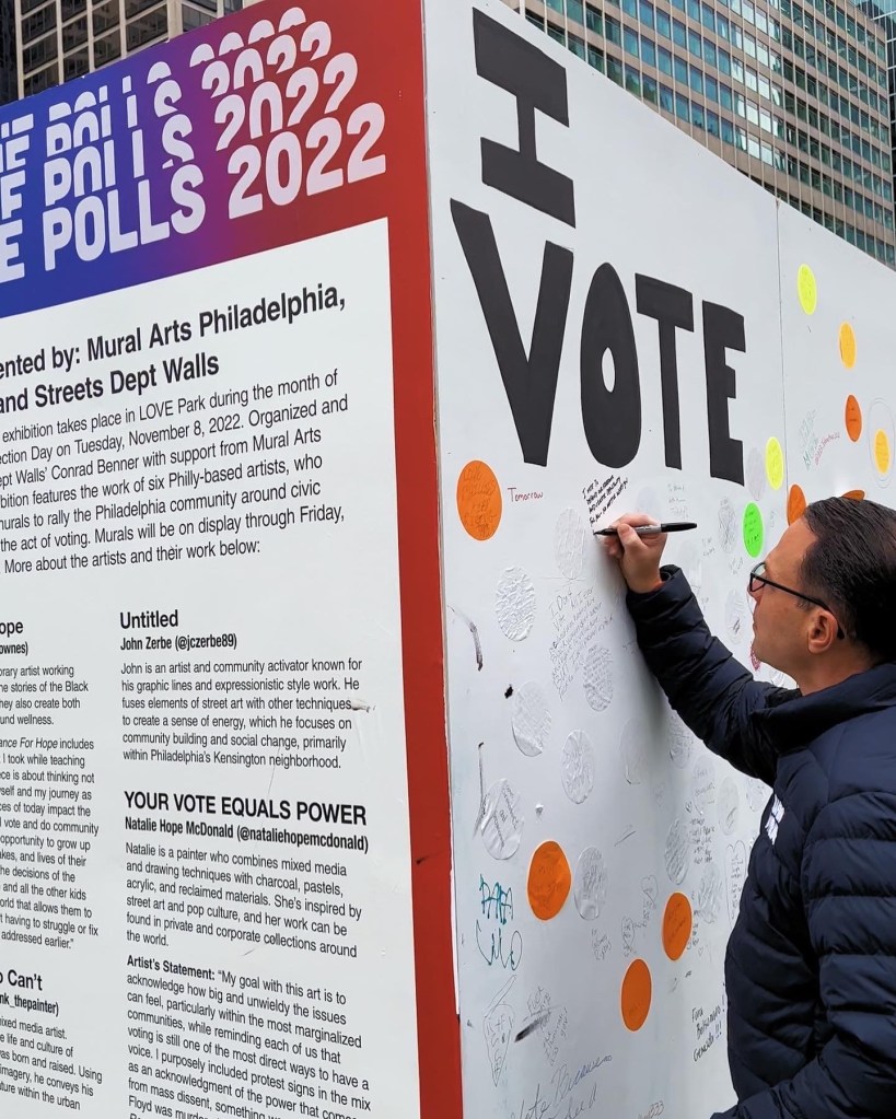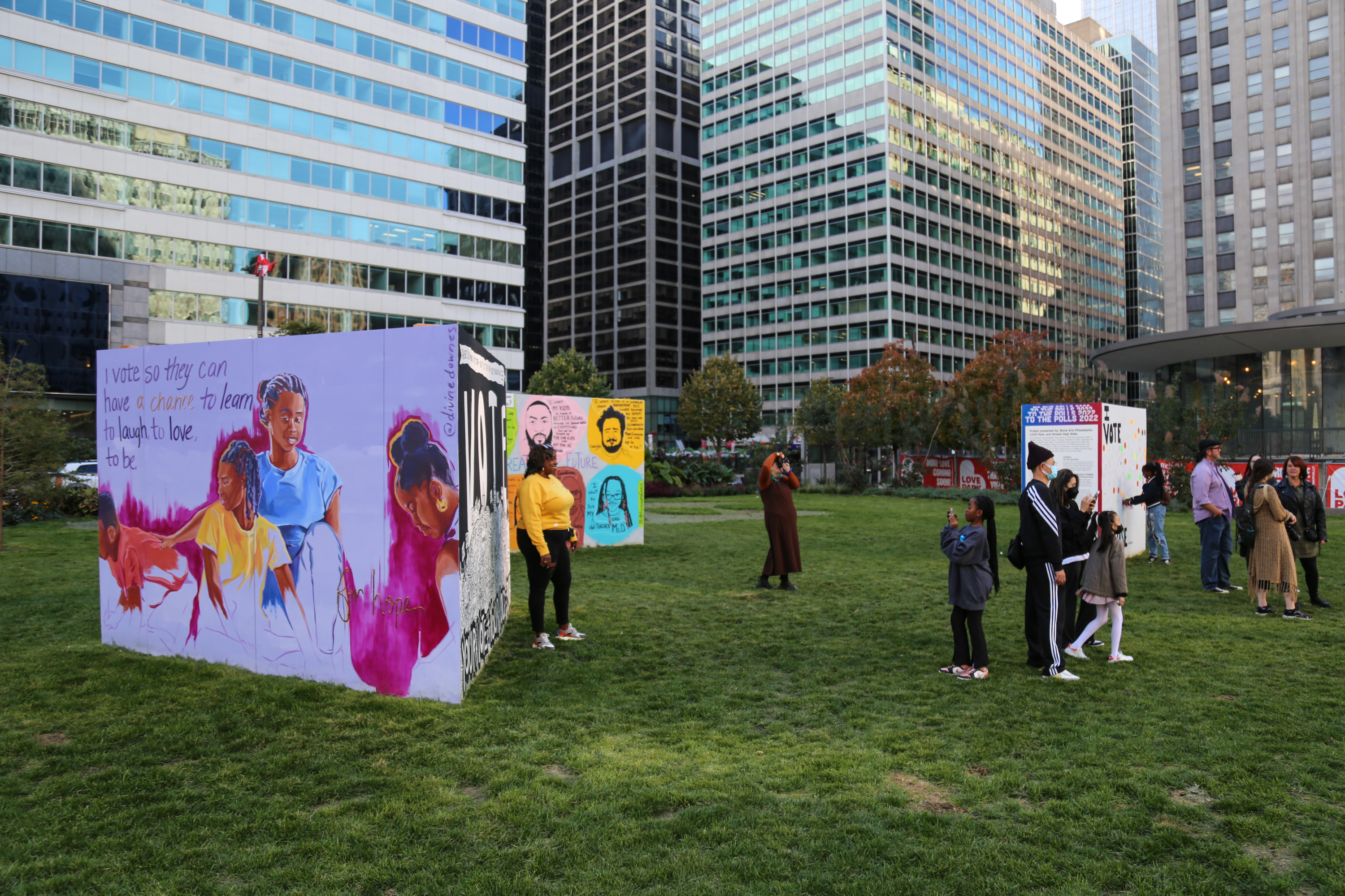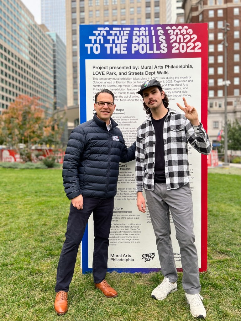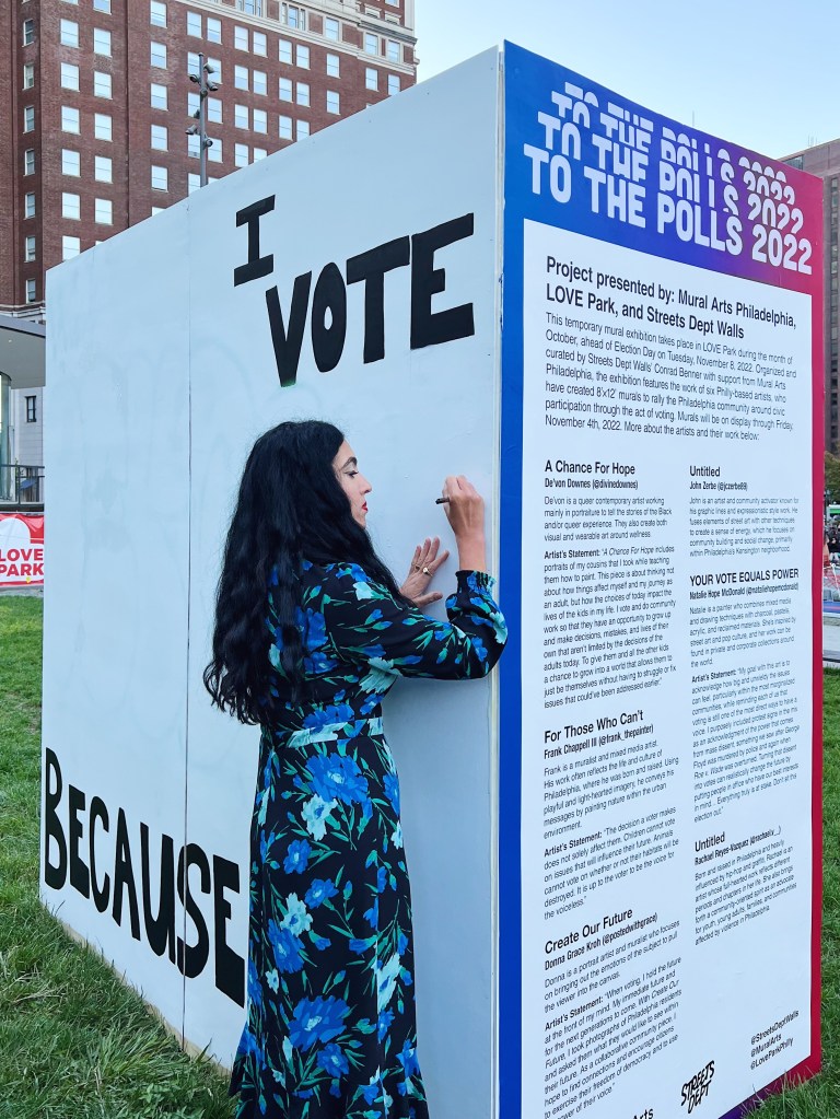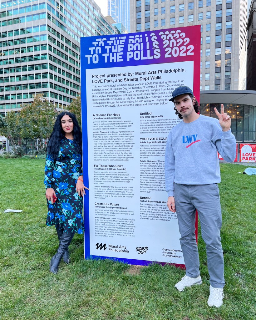 To The Polls 2022 is a mural exhibition that took place in LOVE Park the month of October 2022 through November 4th, ahead of Election Day on November 8th. Organized and curated by Streets Dept Walls’ Conrad Benner with support from Mural Arts Philadelphia, the exhibition worked with six Philly-based artists to create six temporary 8×12-foot murals to rally the Philadelphia community around civic participation through the act of voting. A seventh wall structure invited passers-by to write their reasons for voting.