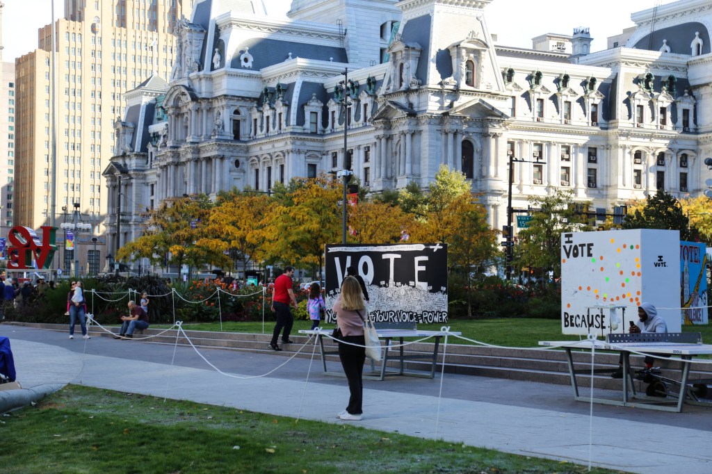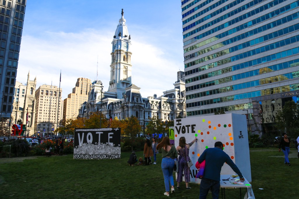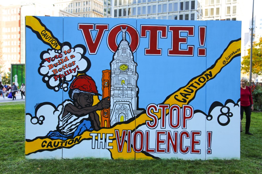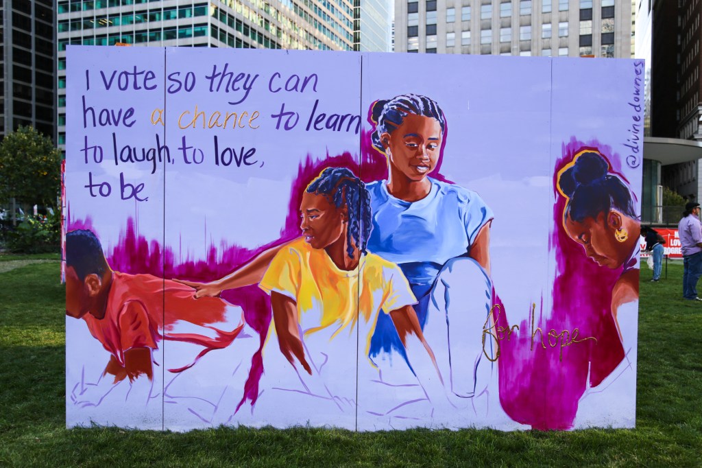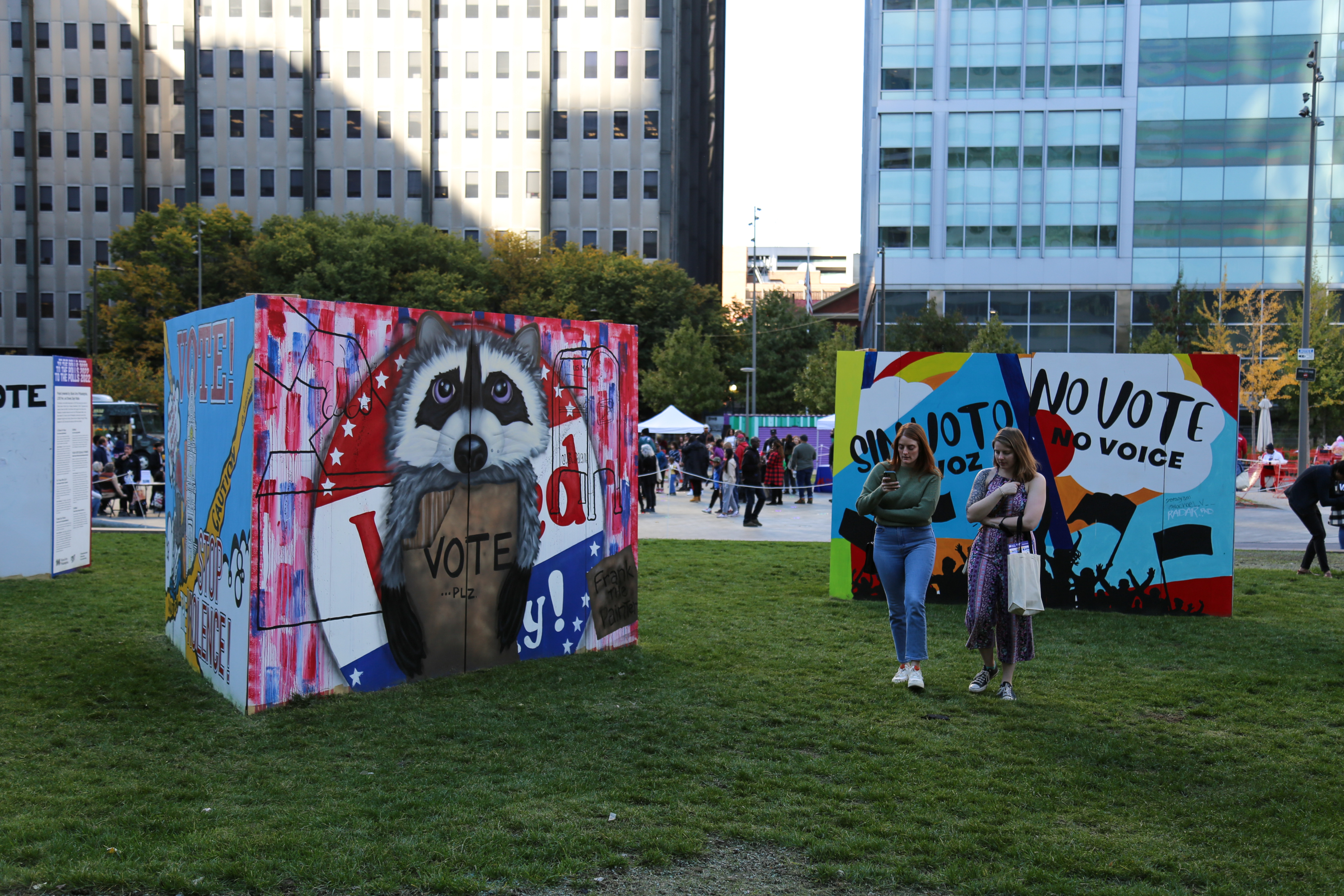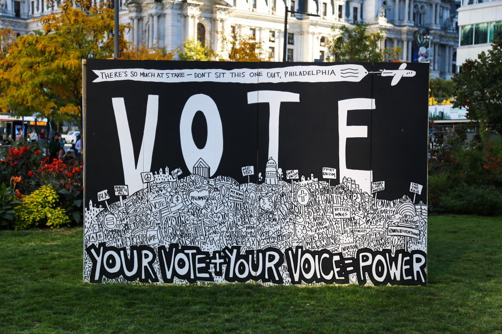 To The Polls 2022 is a mural exhibition that took place in LOVE Park the month of October 2022 through November 4th, ahead of Election Day on November 8th. Organized and curated by Streets Dept Walls’ Conrad Benner with support from Mural Arts Philadelphia, the exhibition worked with six Philly-based artists to create six temporary 8×12-foot murals to rally the Philadelphia community around civic participation through the act of voting. A seventh wall structure invited passers-by to write their reasons for voting.