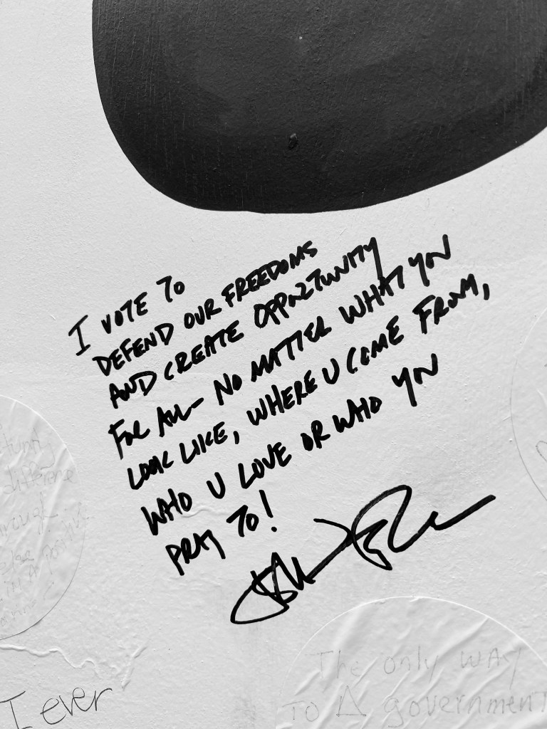 Artist Statement: “My goal with this art is to acknowledge how big and unwieldy the issues can, indeed feel, particularly within the most marginalized communities, while reminding each of us that voting is still one of the most direct ways to have a voice. I purposely included protest signs in the mix as an acknowledgment of the power that comes from mass dissent, something we saw after George Floyd was murdered by police and again when Roe v. Wade was overturned. Turning that dissent into votes can realistically change the future by putting people in office who have our best interests in mind… Everything truly is at stake. Don’t sit this election out.”