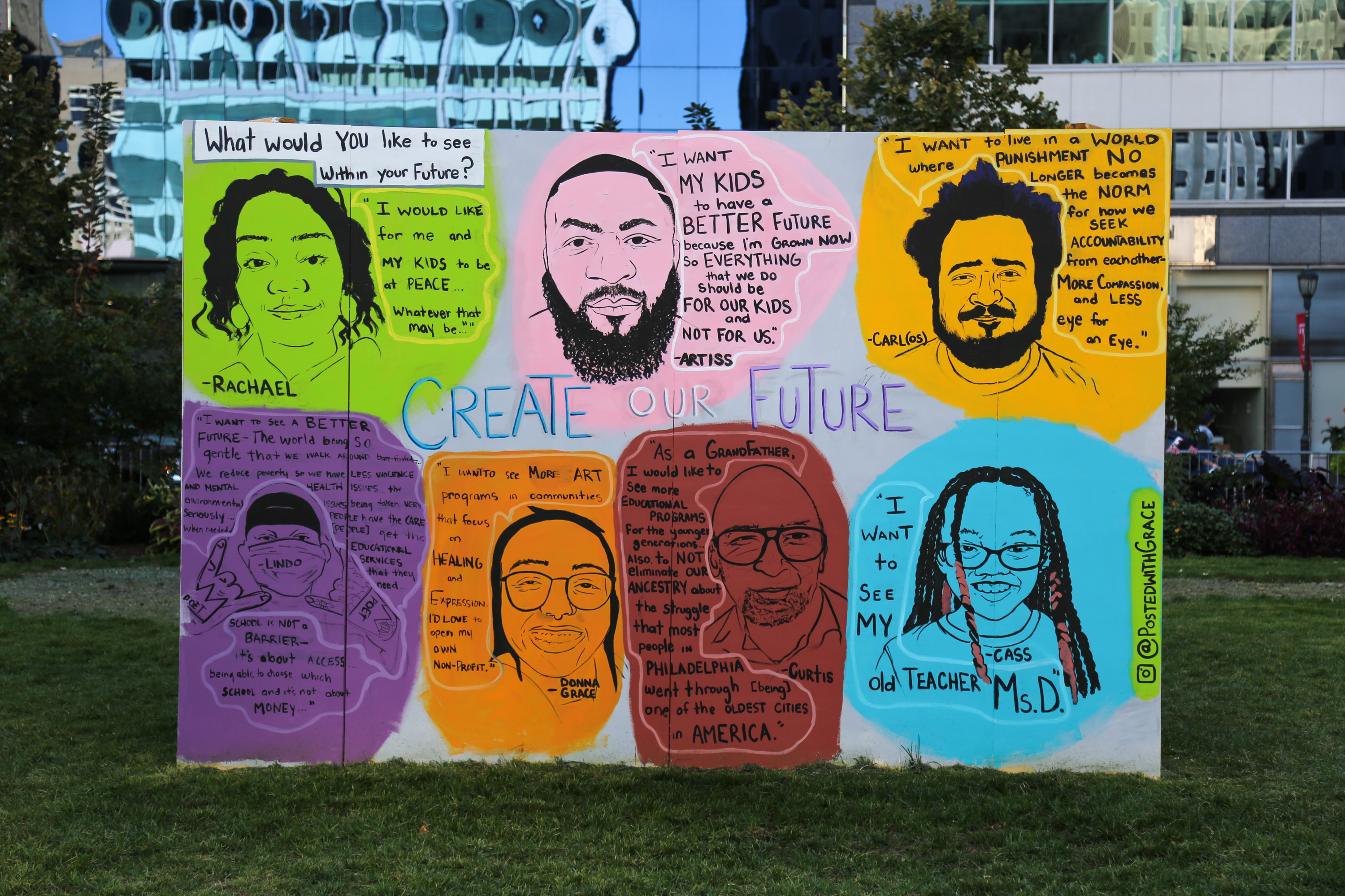 Artist Statement: “When voting, I hold the future at the front of my mind. My immediate future and for the next generations to come. With this mural titled ‘Create Our Future’ I took photographs of Philadelphia residents and asked them what they would like to see within their future. As a collaborative community piece, I hope to find connections and encourage citizens to exercise their freedom of democracy and to use the power of their voice.”