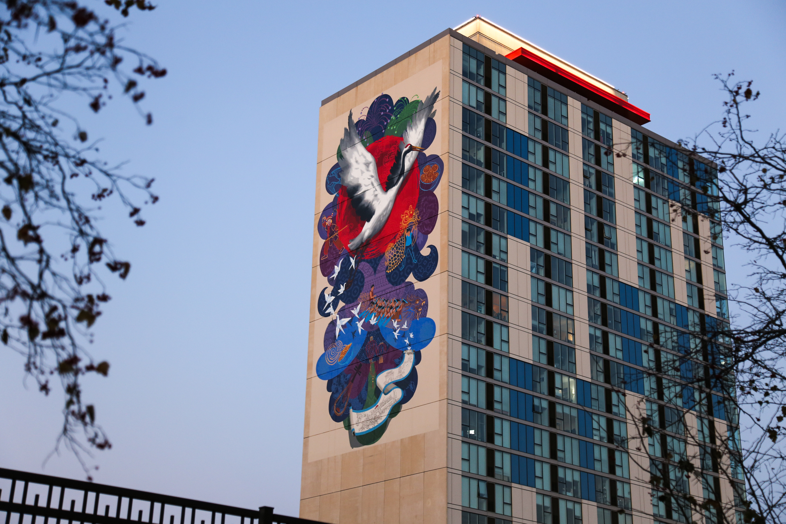 “Artist Chenlin Cai said the design is rich with symbolism, including real and paper cranes, that will speak to different segments of the Asian American community while also showcasing the friendship and unity between different Asian countries,” Mural Arts reports. “Surrounding the giant crane are images of contemporary Chinatown, a dragon boat team, a young girl performing the lion dance, a traditional Pipa stringed instrument, the Monkey King, a popular figure from Chinese opera, a swallow, representing migration, and some of the delicacies that make the area a dining destination. The background is composed of peony petals embossed with textile patterns reflecting some of the many AAPI cultures of Philadelphia: Japan, India, Korea, China, Vietnam, Indonesia, Thailand, Myanmar, Laos, Cambodia, Tibet, Bhutan, and the Philippines.”