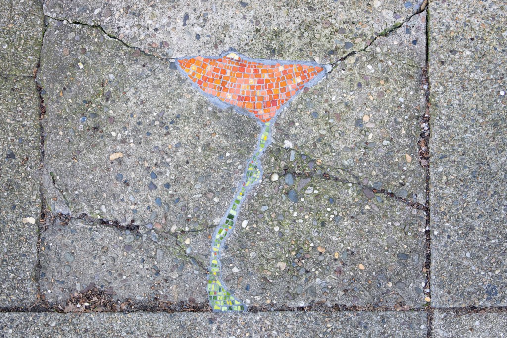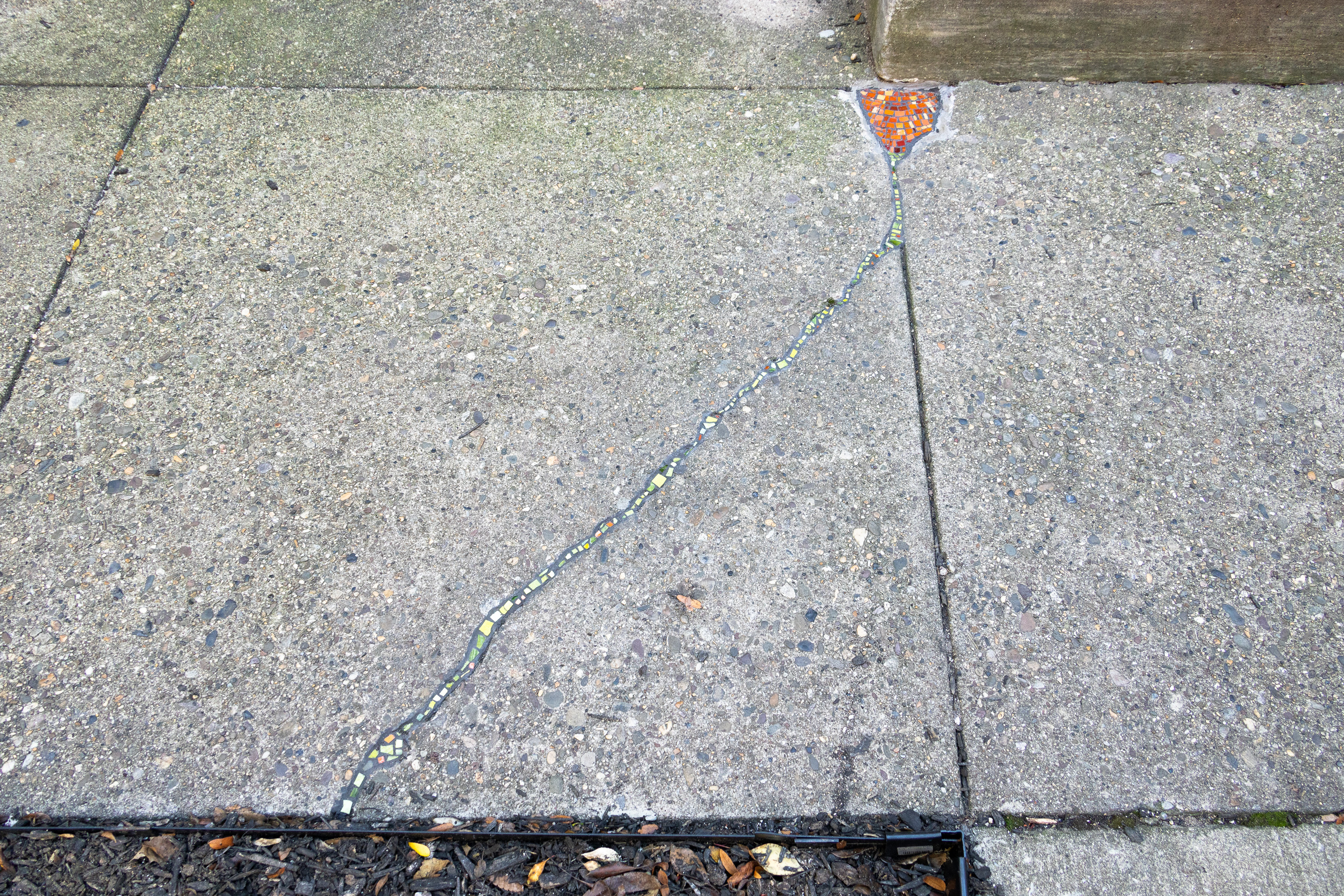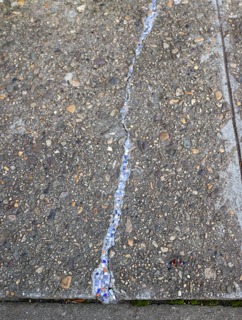 Sidewalk: I’ve been doing mosaic murals for about 7 years now. In contrast to the street cracking, the other things I have done are big murals. My first one was a 10 foot by 13 foot wall when I knew pretty much nothing about the whole endeavor. I have not had any art school training but have learned mostly though workshops with artists I admire or practice.