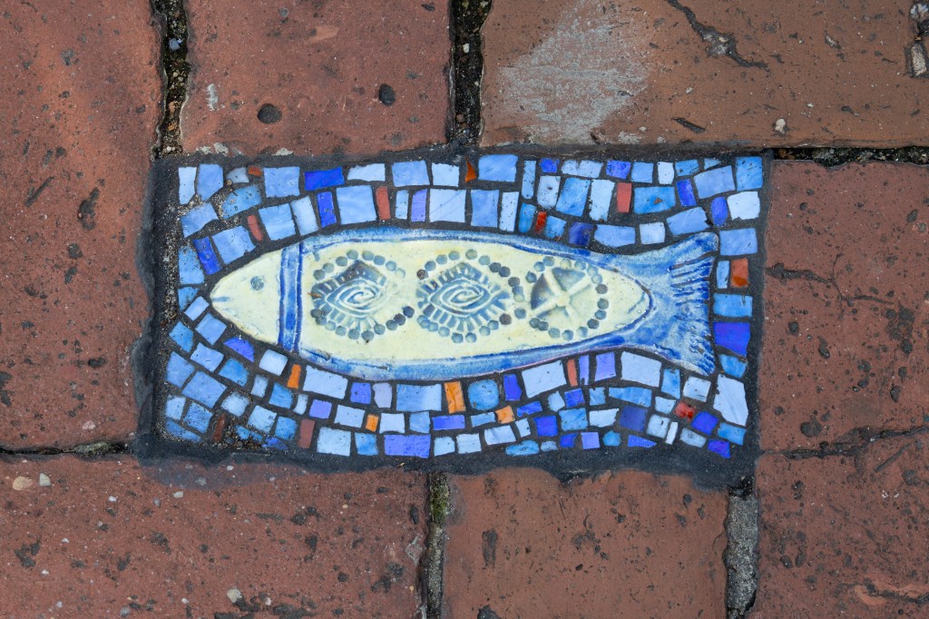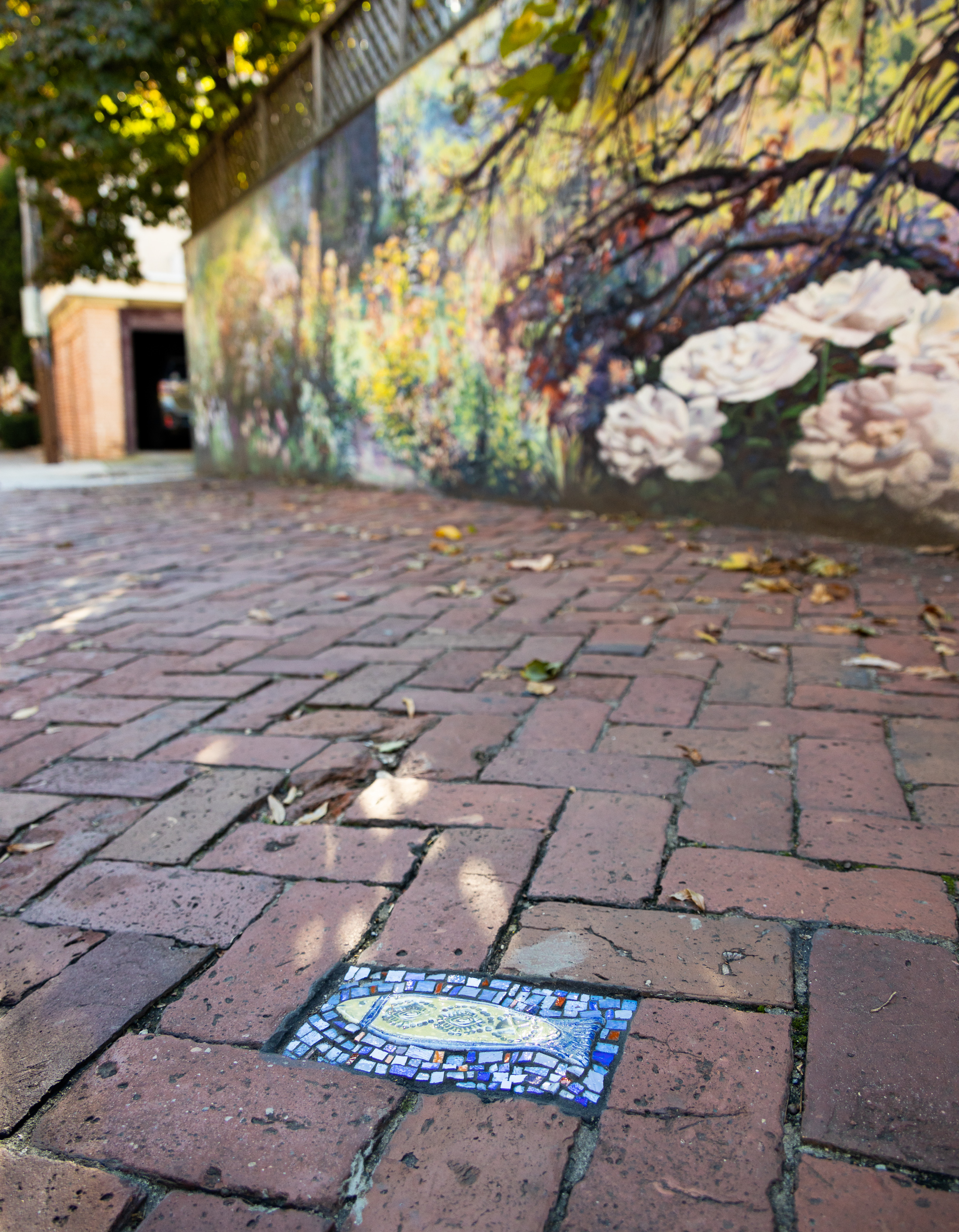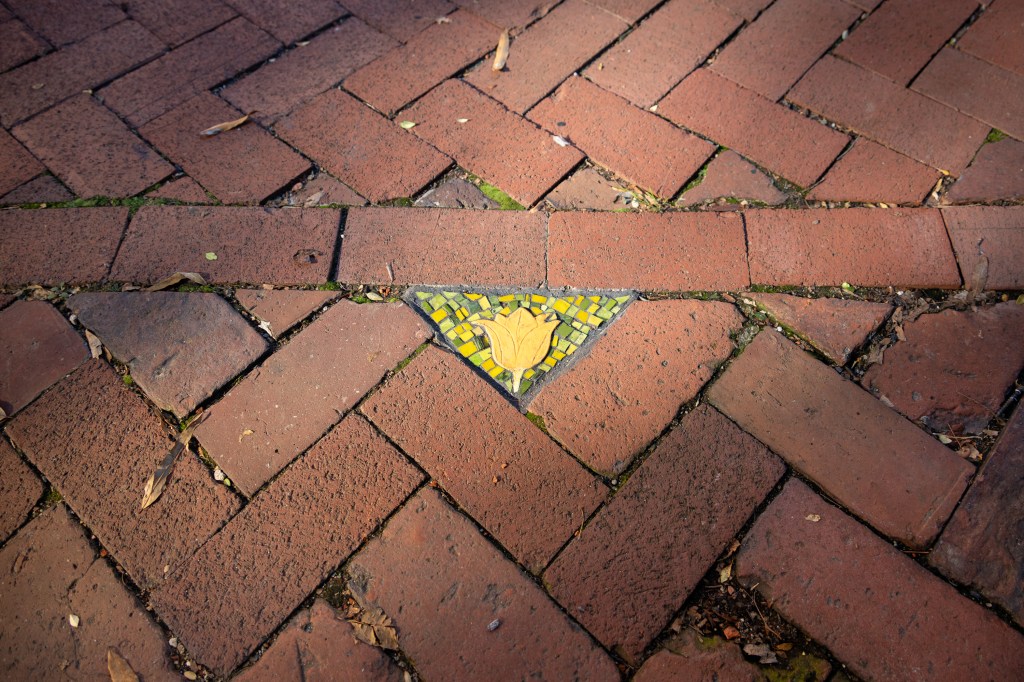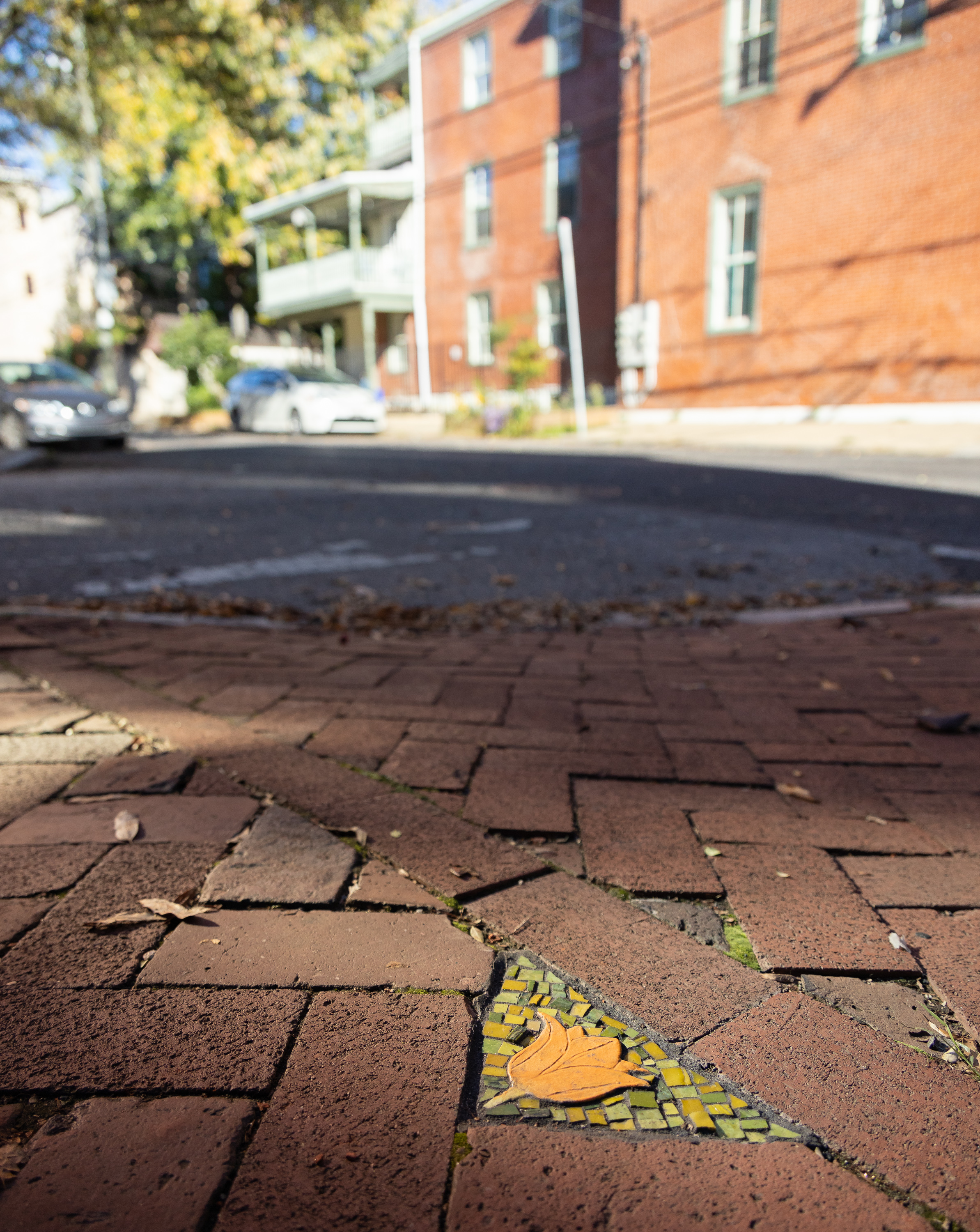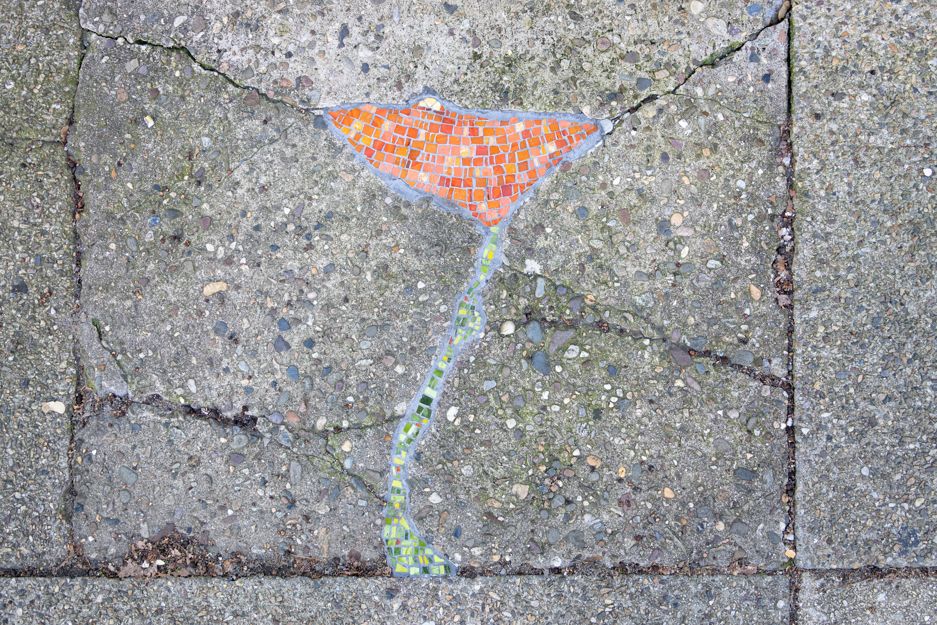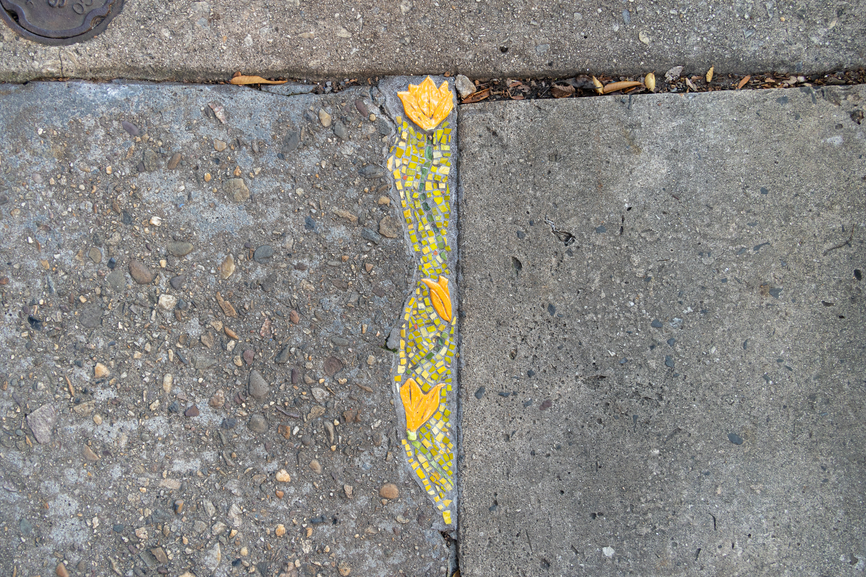 If you look carefully in the sidewalks on that street and a few others in the neighborhood, you’ll see other mosaic interventions that fill sidewalk cracks and holes left by missing bricks. Both delightful and functional, they exemplify some of the best things that street art can accomplish. But who made them?