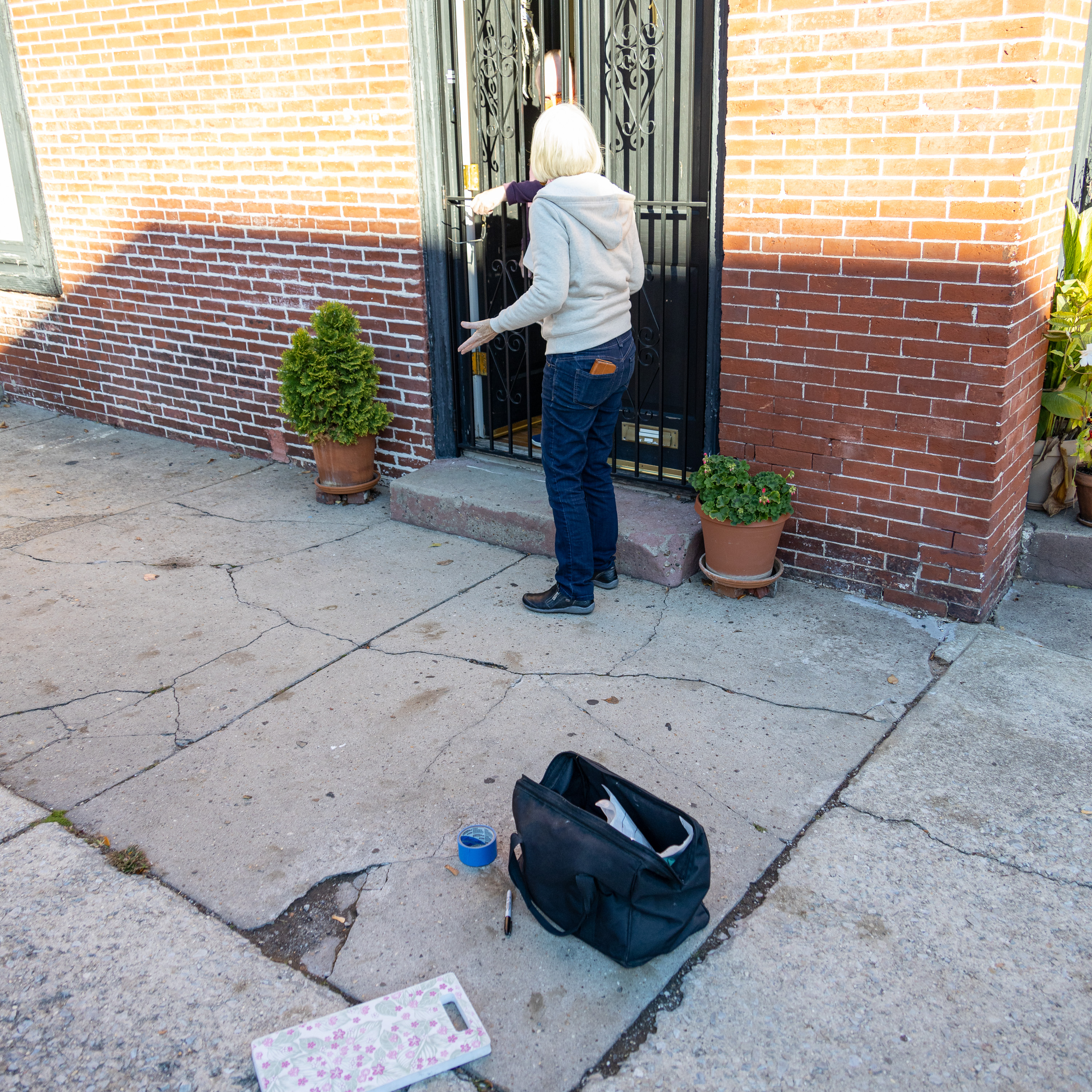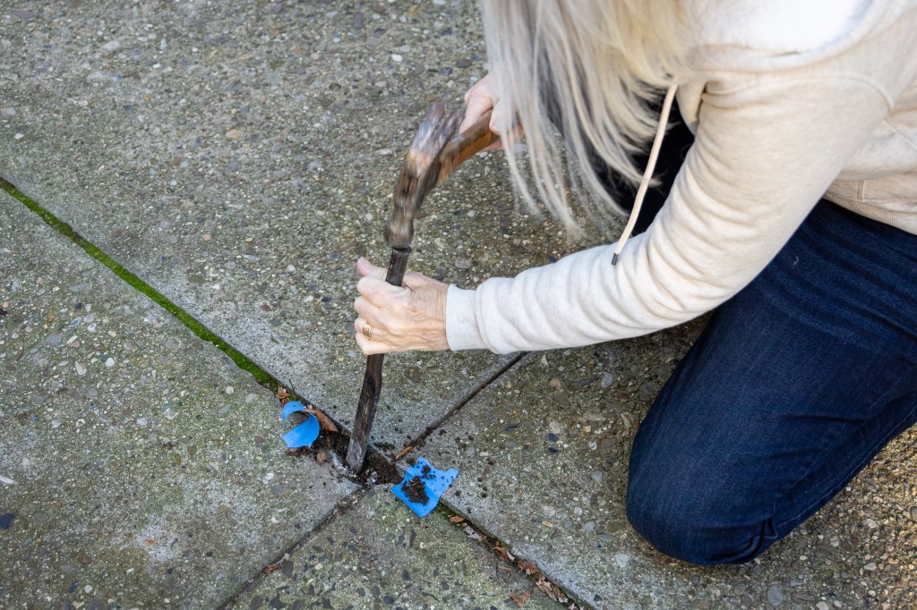 For smaller cracks and holes, she just digs them out and fills them on the fly. On the day I stopped by, she had used painter’s tape to mark about a dozen potential cracks to fill up and down the sidewalk, and was starting to dig them out for mosaicing the following day. I even witnessed her asking several residents for permission to fill cracks in front of their homes. Needless to say, she didn’t get a single “no.”