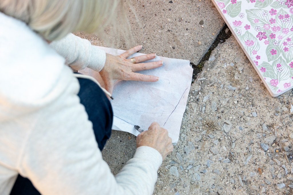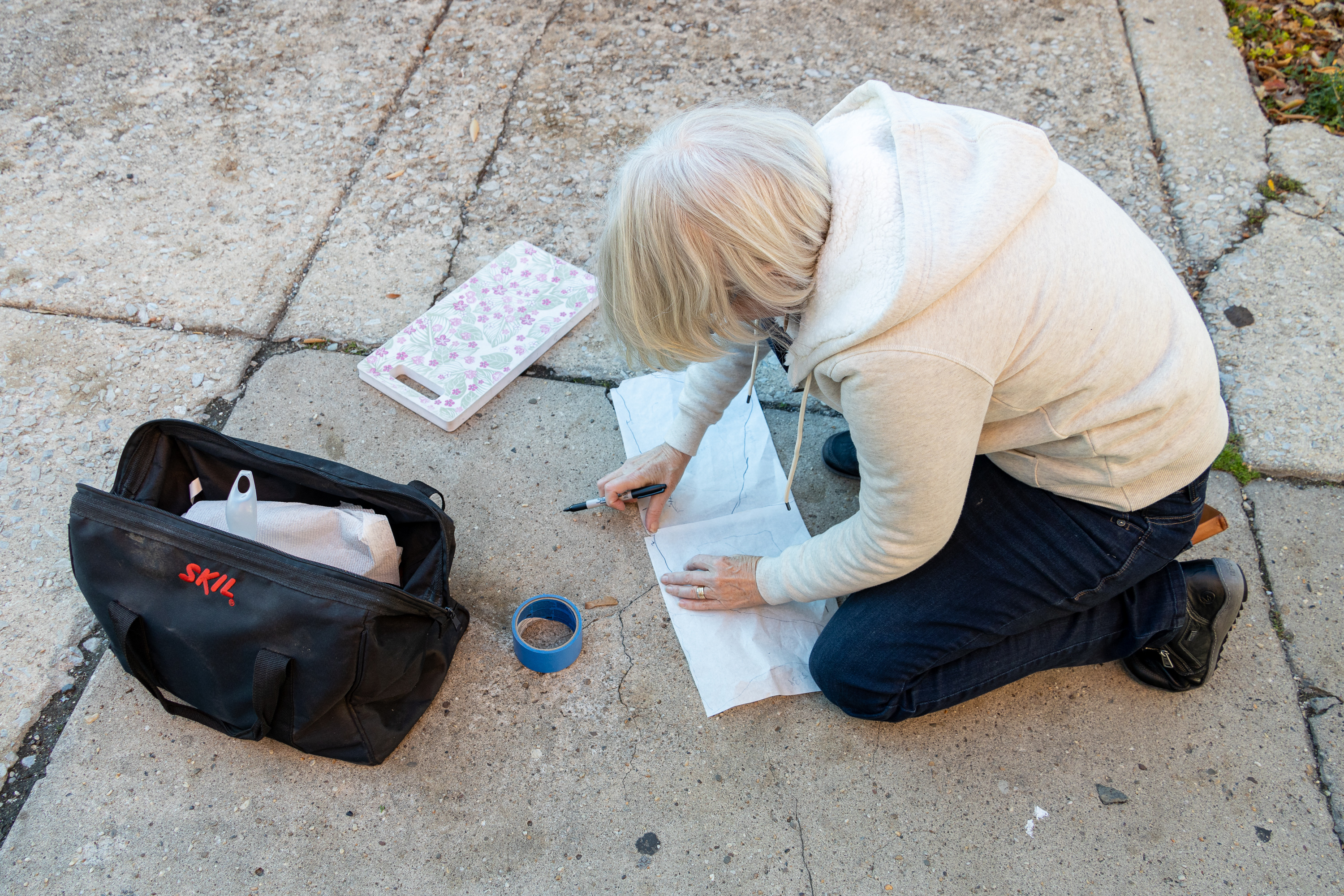 It turns out that the artist behind these repairs didn’t have a name for herself when she started making them. Nevertheless, with a little DMing, I managed to find her on Instagram! She told me the exact locations of several cracks she had filled, and when I went out to photograph them, by sheer luck, I ran into her! After chatting a little, she showed me the first step in her process—making a rough outline of the crack that needs filling. Using the outline, she can go back to her studio to lay down her design on a mesh mosaic backing cut to the exact shape of the hole.