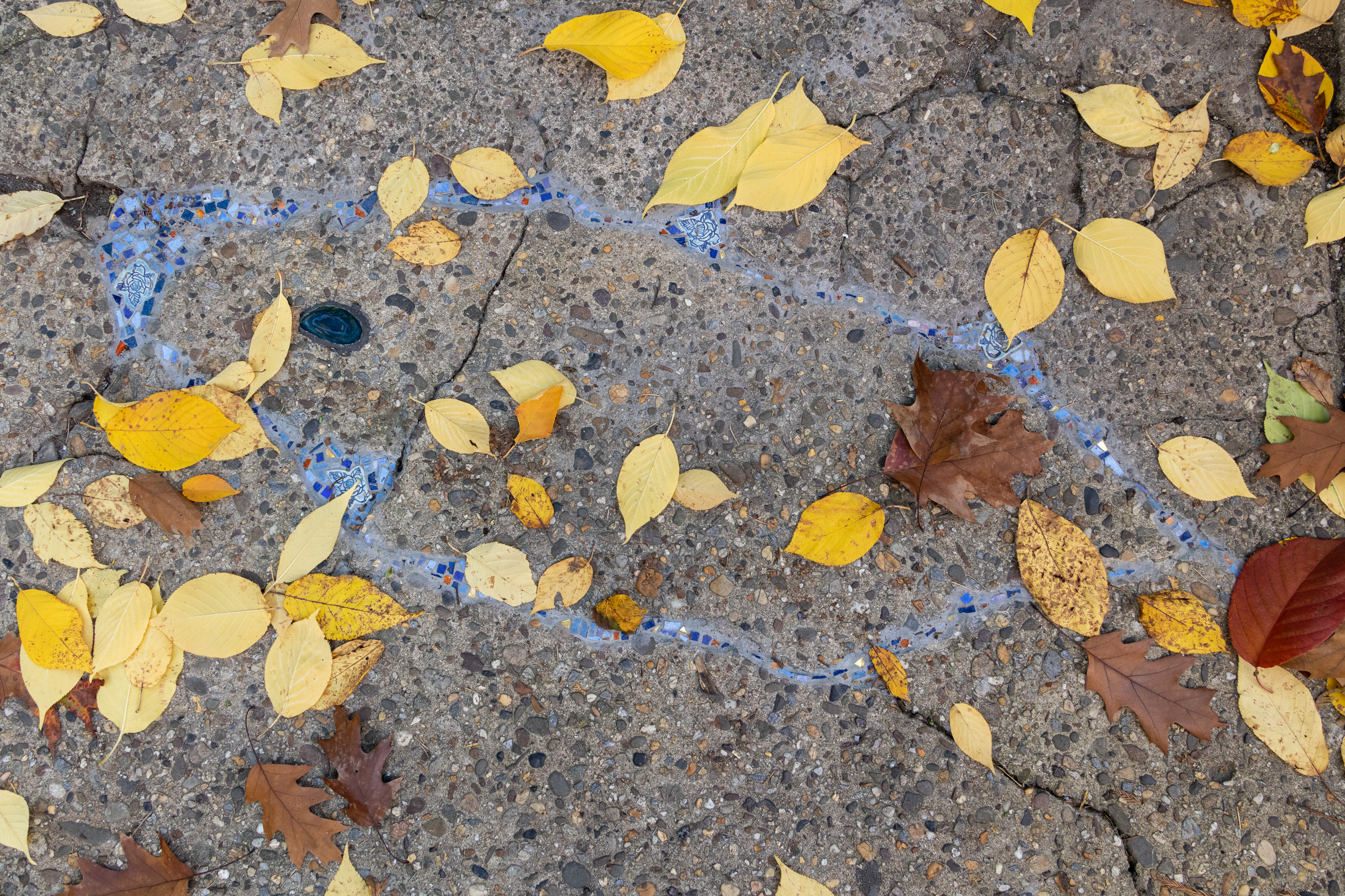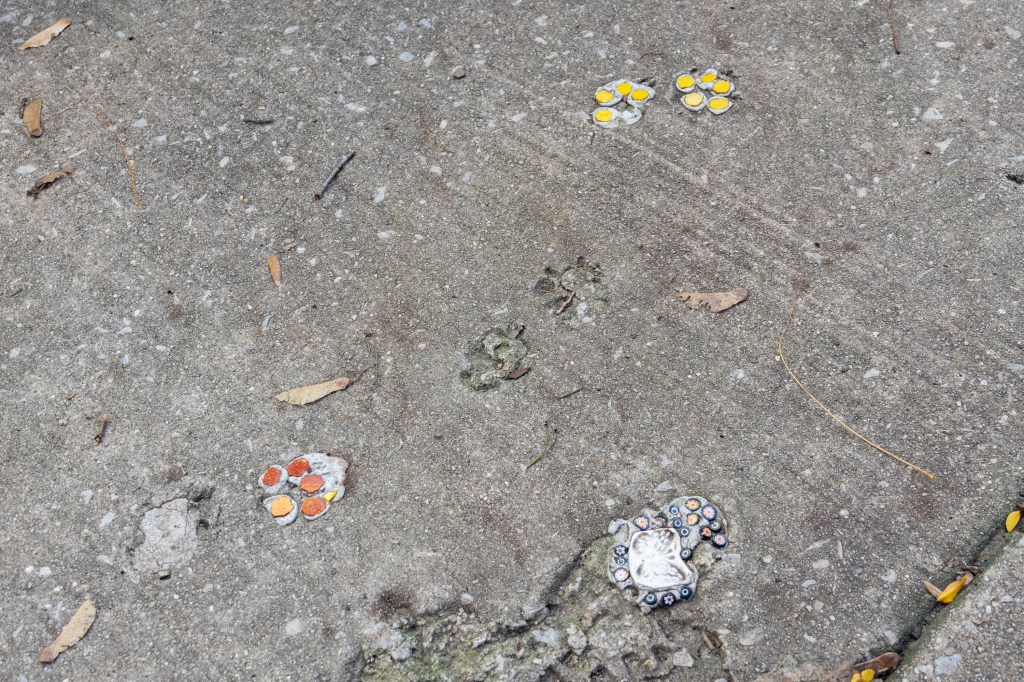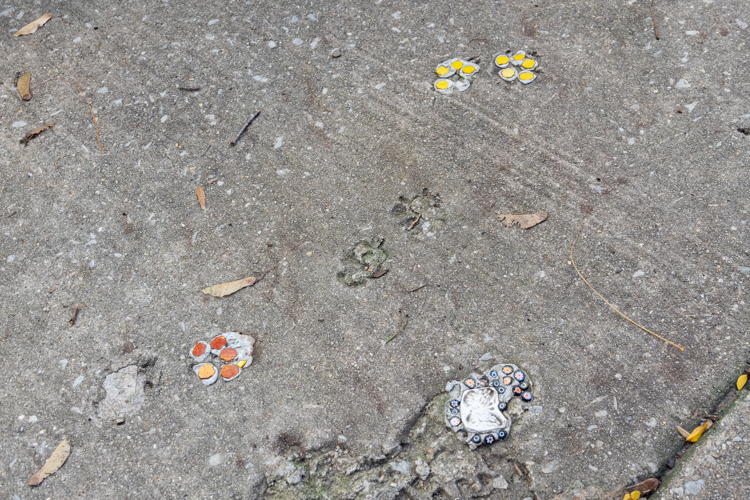Sidewalk: I think I filled my first cracks about five years ago. I started with those dog prints. I had been staring at them for years and finding them, even empty, hilarious. The way that one little dog-second got frozen in time. So one day when I was working on something else and had some mortar mixed up, I just went out, sat down, and filled about four of them. It seemed like such a transformation. A neighbor of mine then suggested that I fill up the dog prints in front of her house. It took me about a year to get around to doing it. While sitting on the ground doing that, another neighbor came over and showed me some broken dishes she had which had meaning for her and wondered if I could do something with them in front of her house. I couldn’t use the dishes, but put something small in a few of the cracks in front of her house. I actually hated the way they looked and kind of cringed every time I passed that spot. So one day, I thought I think I’ll fill a bigger spot and do it with more intention and put something down I actually like, using more high-end materials—like some ceramic pieces I had made, and smalti.