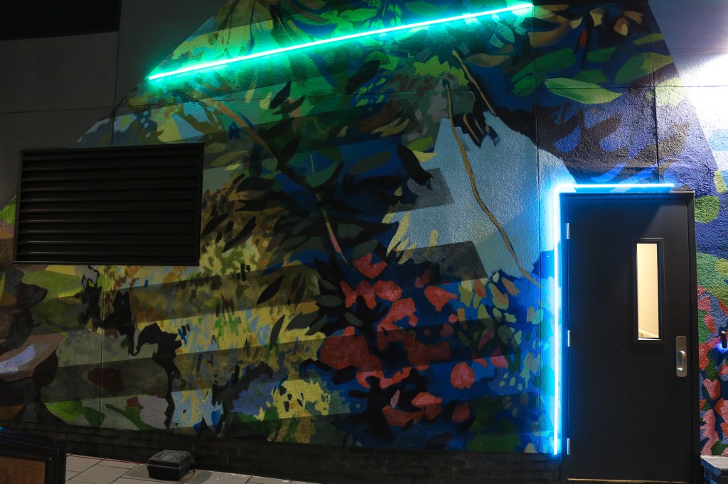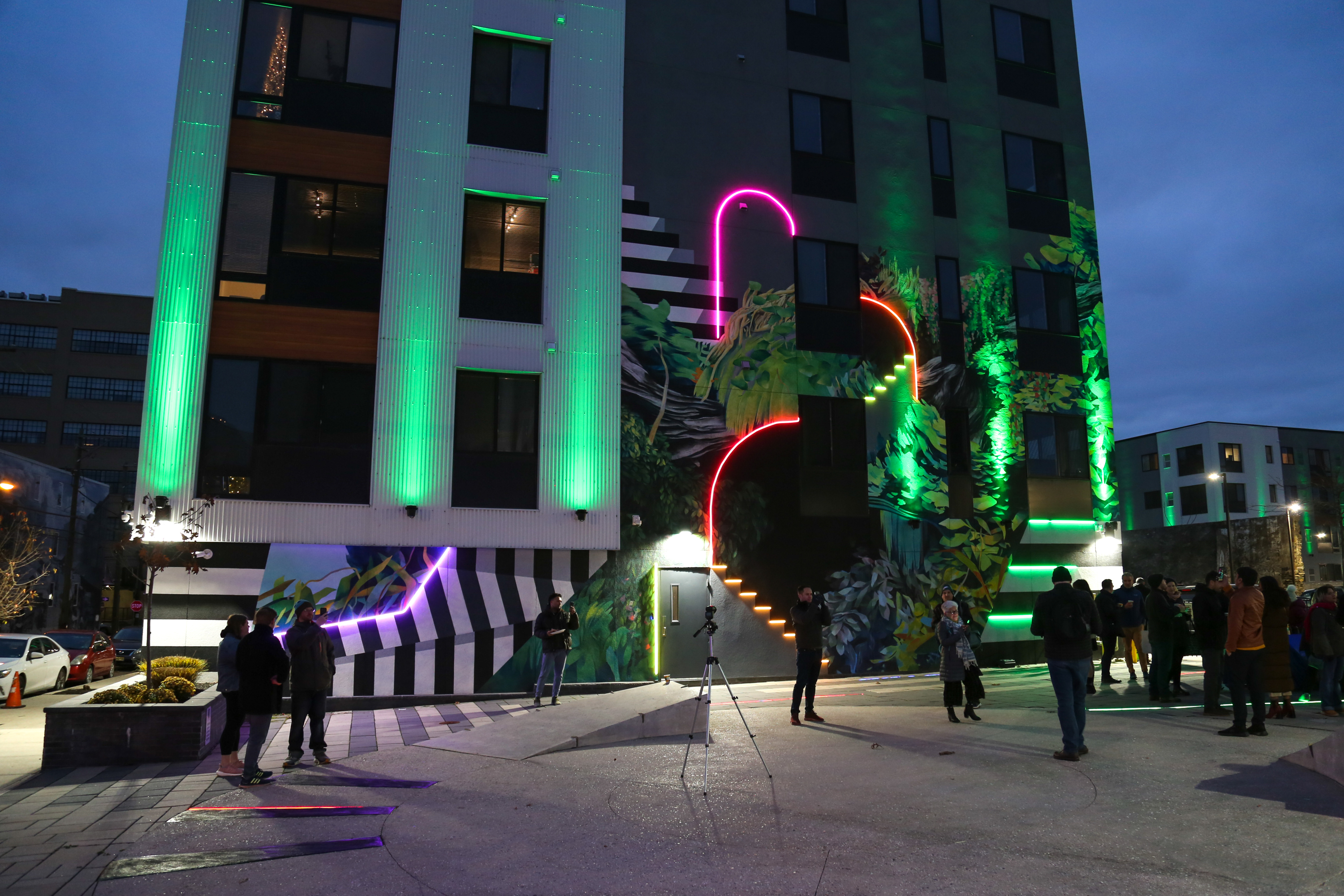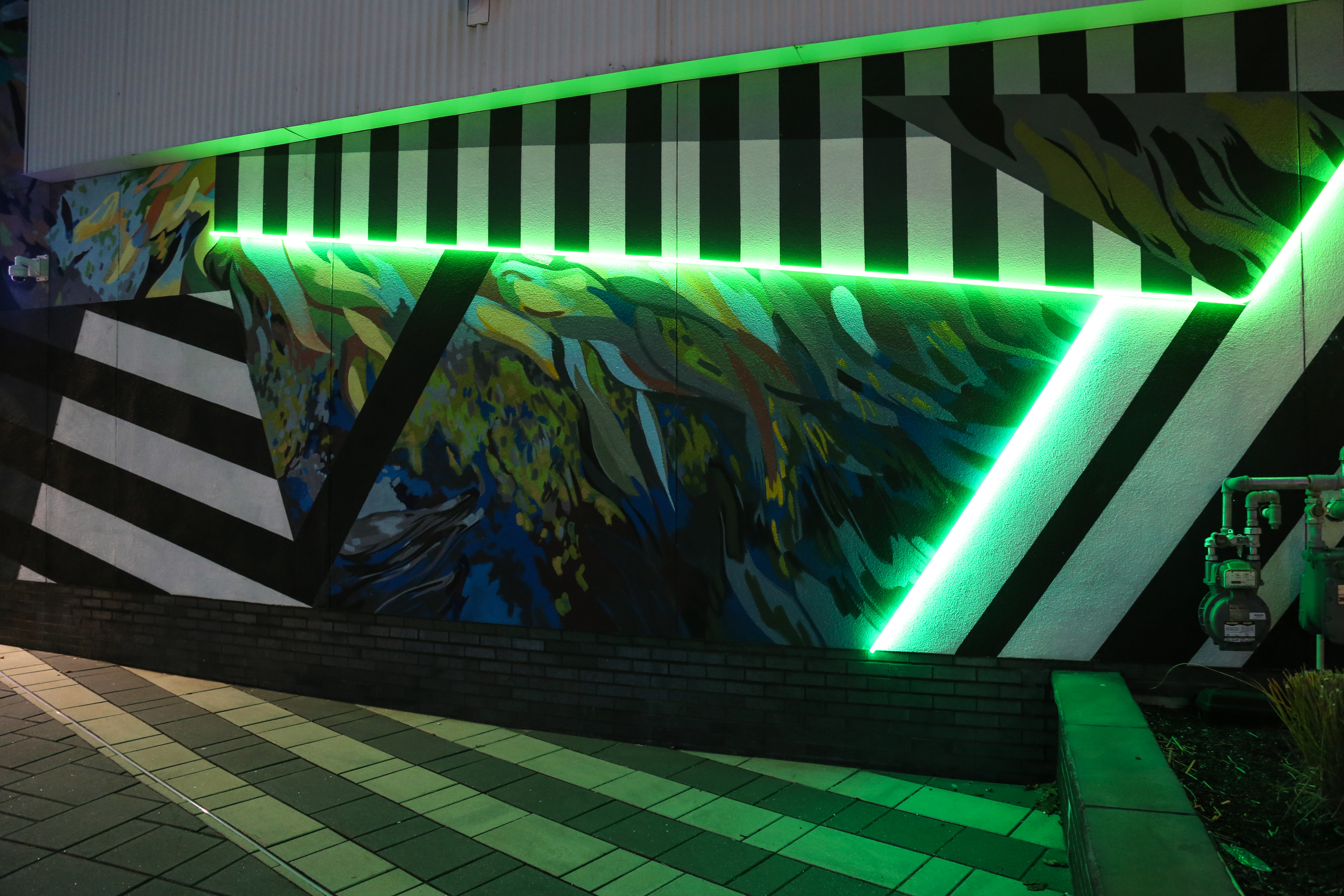 Titled Future Valley Plaza, the multi-layered mural has been in the works for many years. In fact, the painted mural and LED lights embedded in the walls and paving were completed in 2019. But it’s today that the full picture of this project has come in to focus.