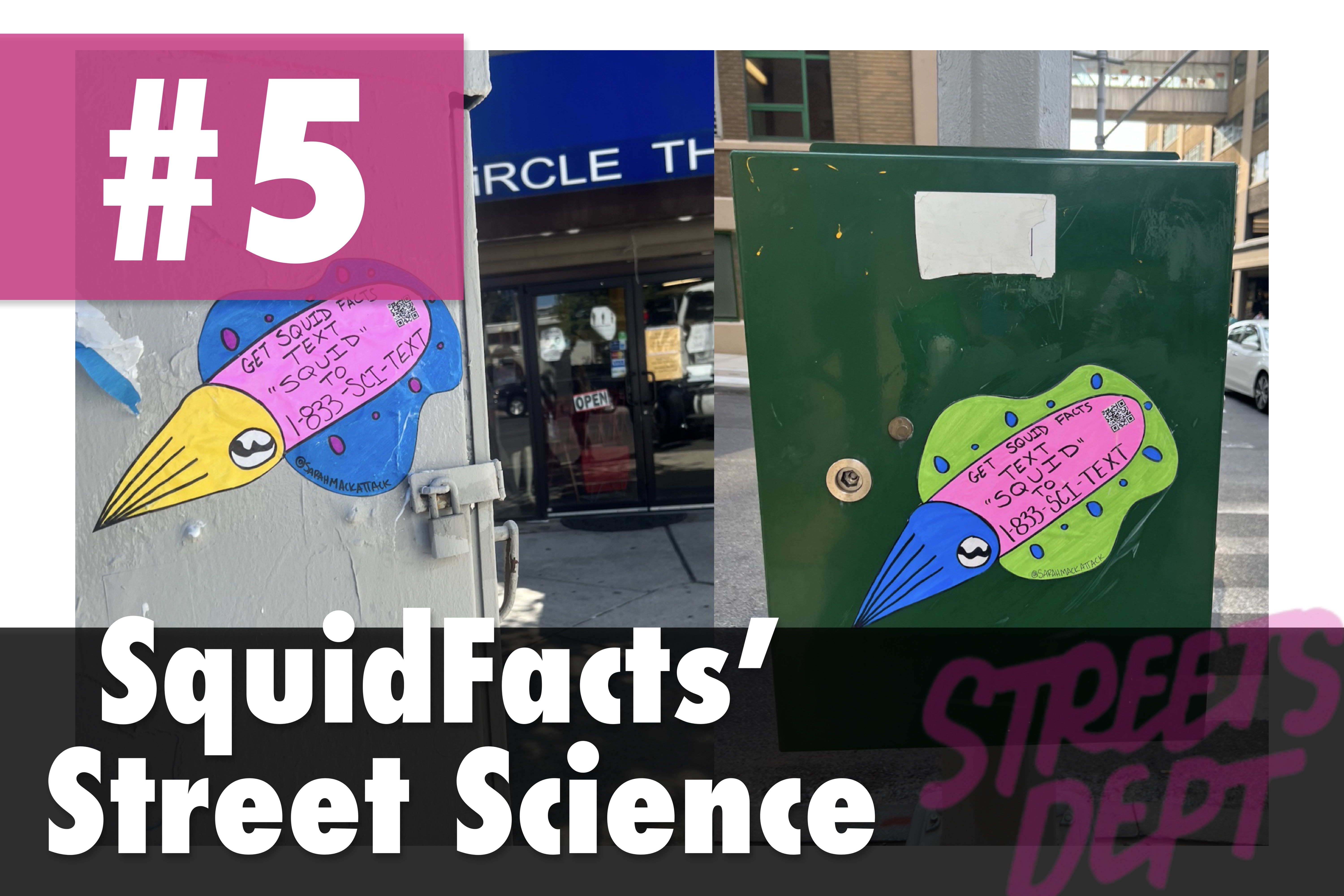 Completely from left field–that’s how I’d describe this smile-inducing exercise in science street art! When I first started seeing stickers and small wheatpastes on the street encouraging passersby to text a number to learn facts about squids, I thought, Well that’s interesting. I thought that in large part because they each appeared to be hand-made. not printed or mass produced. And these little squid-shaped prompts ended up on endless street polls, newspaper boxes, and construction walls around the city. That’s a lot of work for a quick joke–there must be something here, I conduced. And there was!